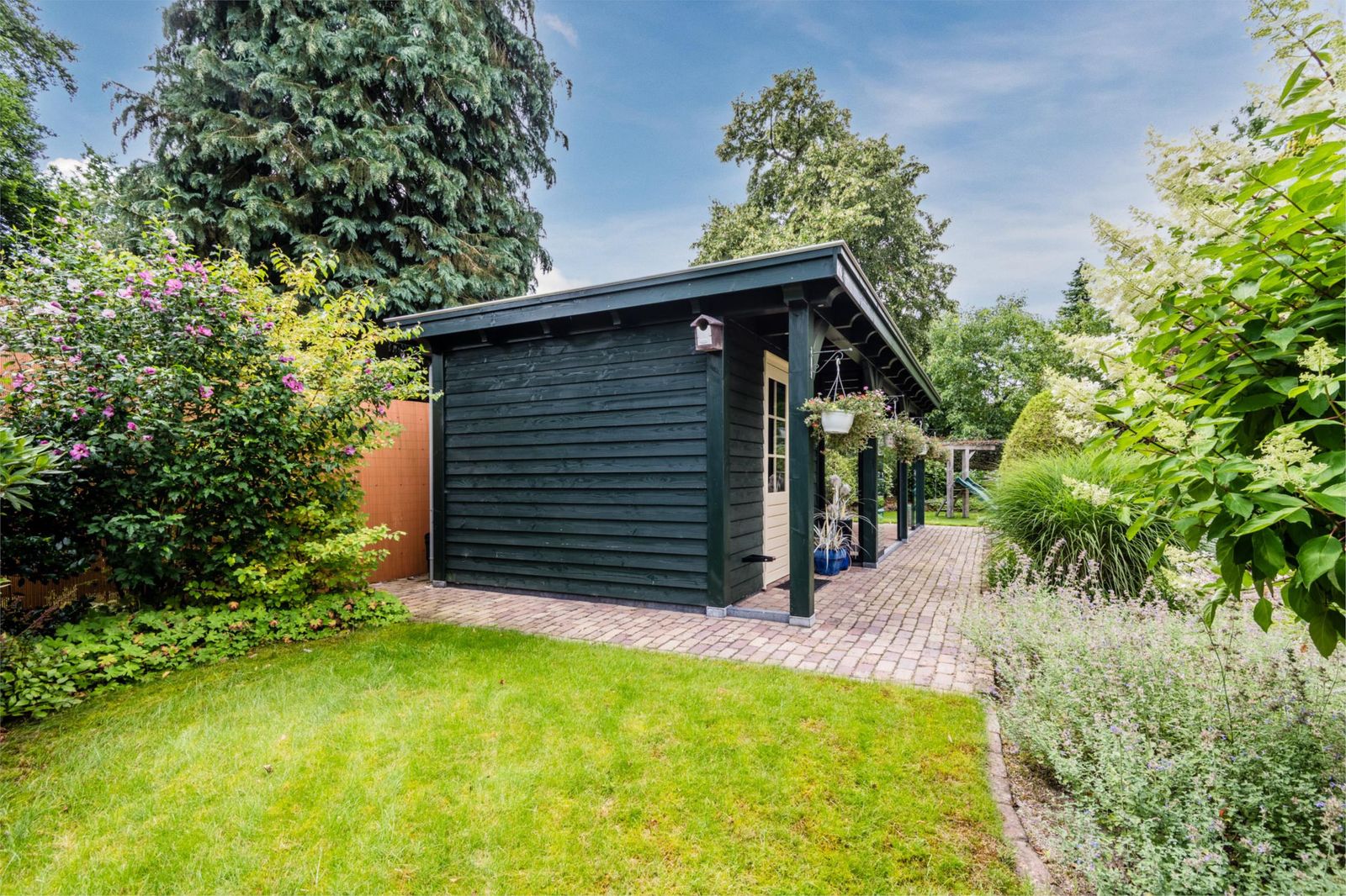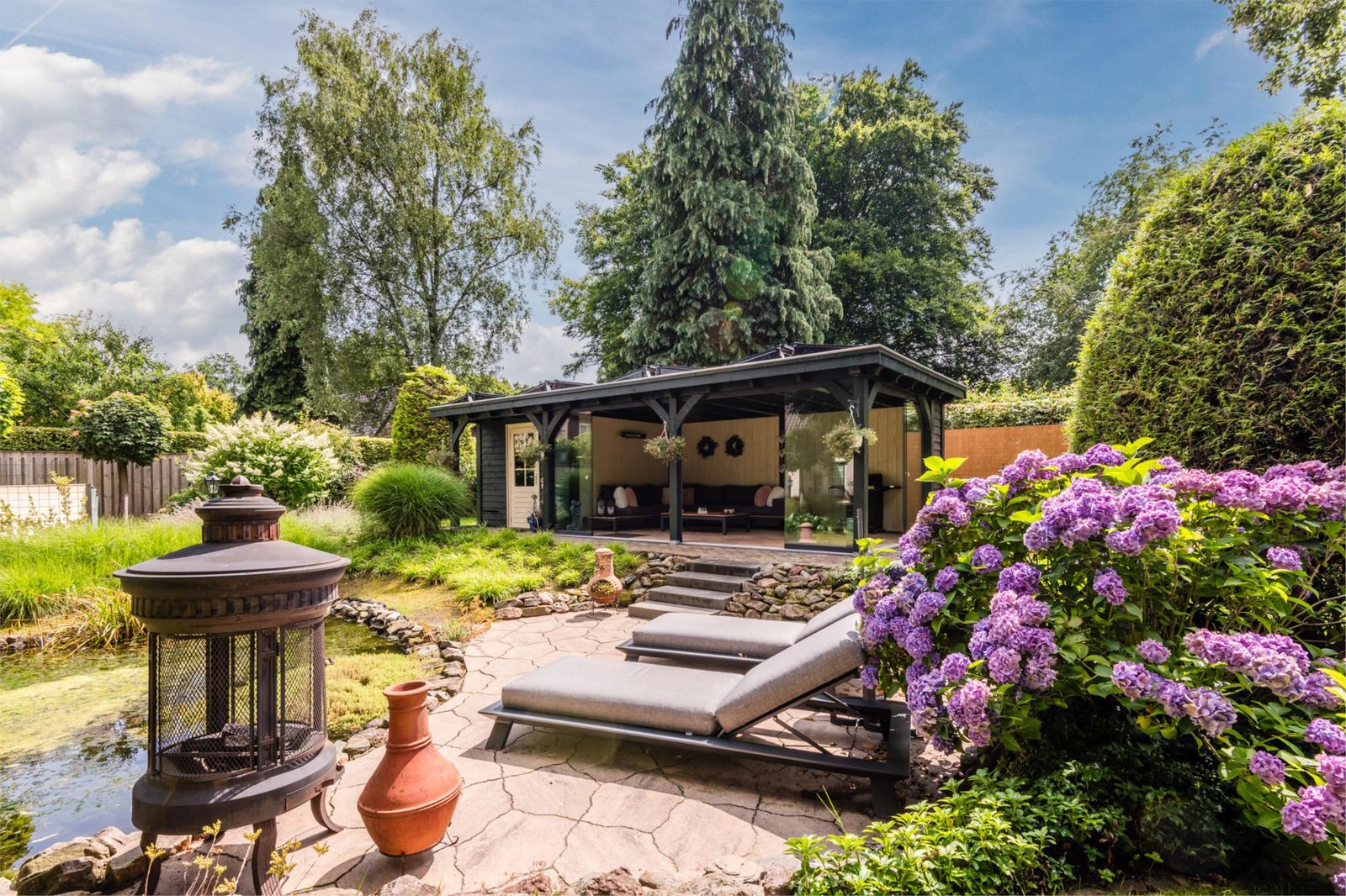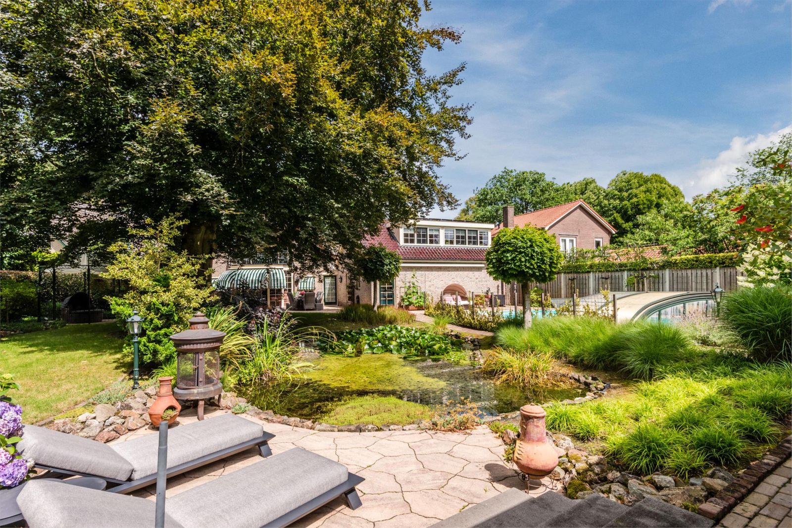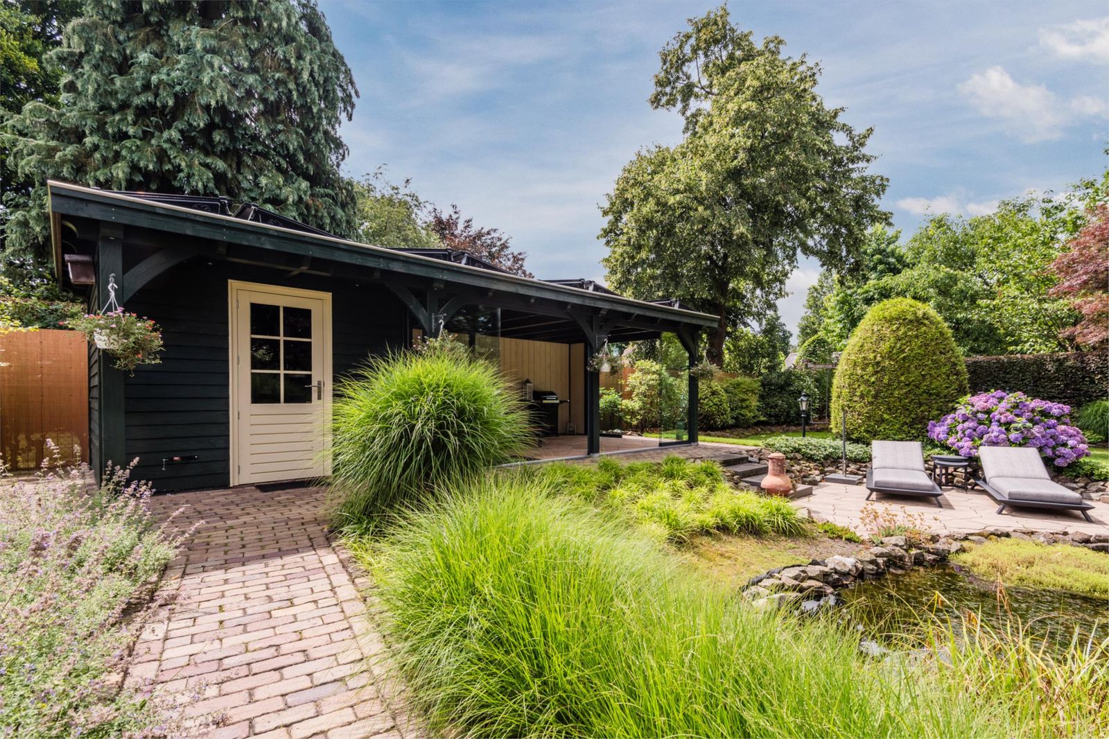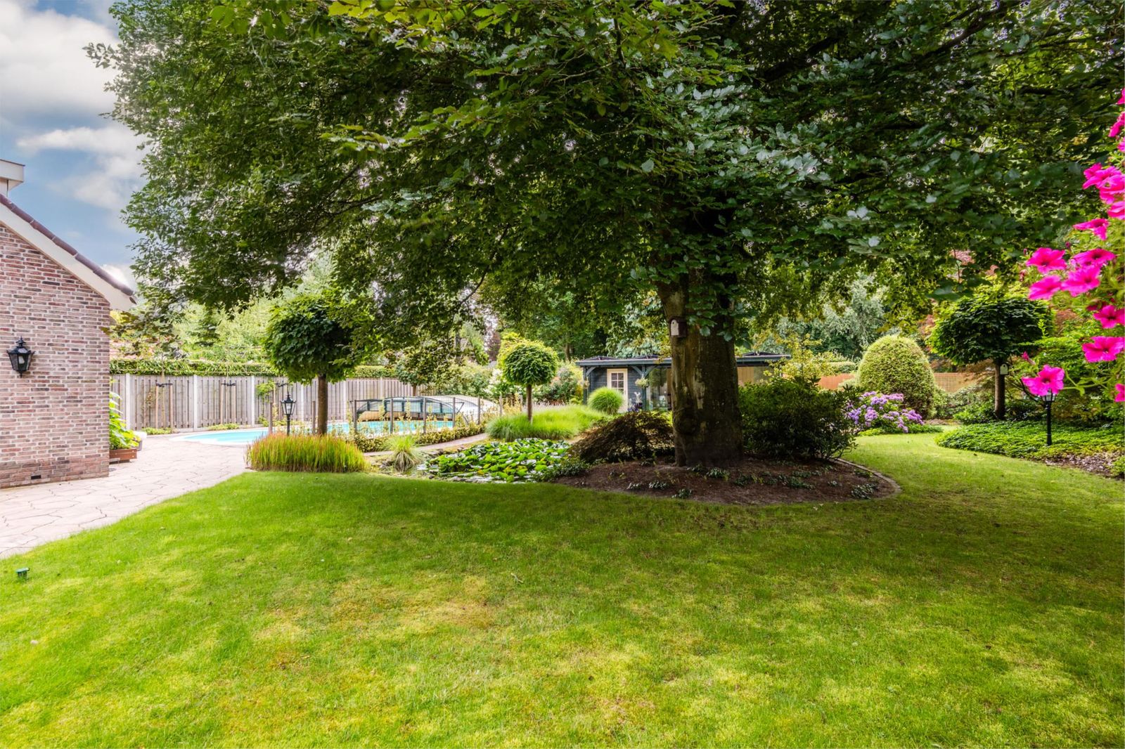 Het totale erf inclusief tuin is in 2020 met zorg en sfeer opnieuw aangelegd en onderhoudsarm ingericht. Het voorerf betreed je via de afstandsbediende toegangspoort en is grotendeels bestraat en biedt riante parkeerruimte. De zijtuin is een oase van kleurrijke hortensia's. In de achtertuin (34m diep en 32m breed) zijn organische vormen en hoogteverschillen toegepast zodat het geheel een rustige en natuurlijke uitstraling heeft. Er zijn grote borders met veel vaste planten/struiken, siergrassen en bodembedekkers en een deel gras. In de achtertuin staat prominent een prachtige rode beukenboom die in de zomer voor fijne schaduw zorgt en je altijd het gevoel geeft midden in de natuur te leven. Naast de beukenboom bevindt zich de grote vijver waaraan het verlaagde zonneterras is gesitueerd. Achter in de tuin staat het fraaie en robuuste tuinhuis met berging (Trendhout; 2020) met 9 glazen schuifwanden. Vanuit het tuinhuis beleef je de volledige tuin optimaal! Op het dak van het tuinhuis liggen 16 zonnepanelen. Er is een vaste UTP verbinding met het tuinhuis zodat je ook daar probleemloos internet kunt gebruiken!