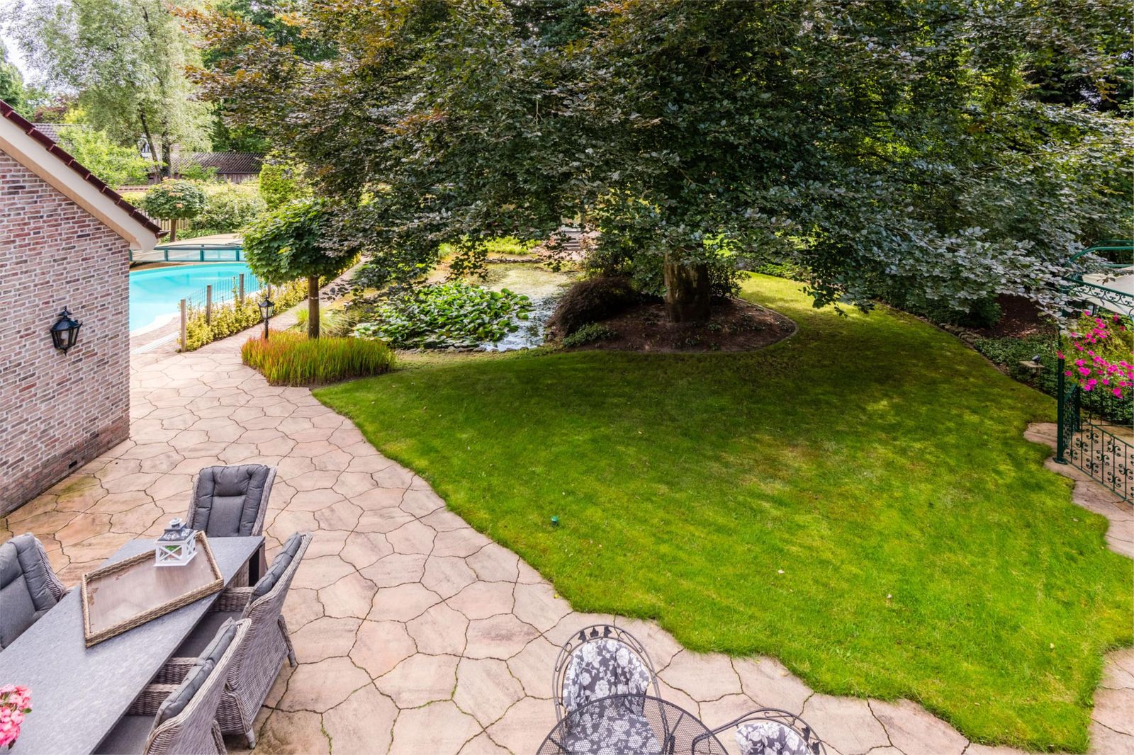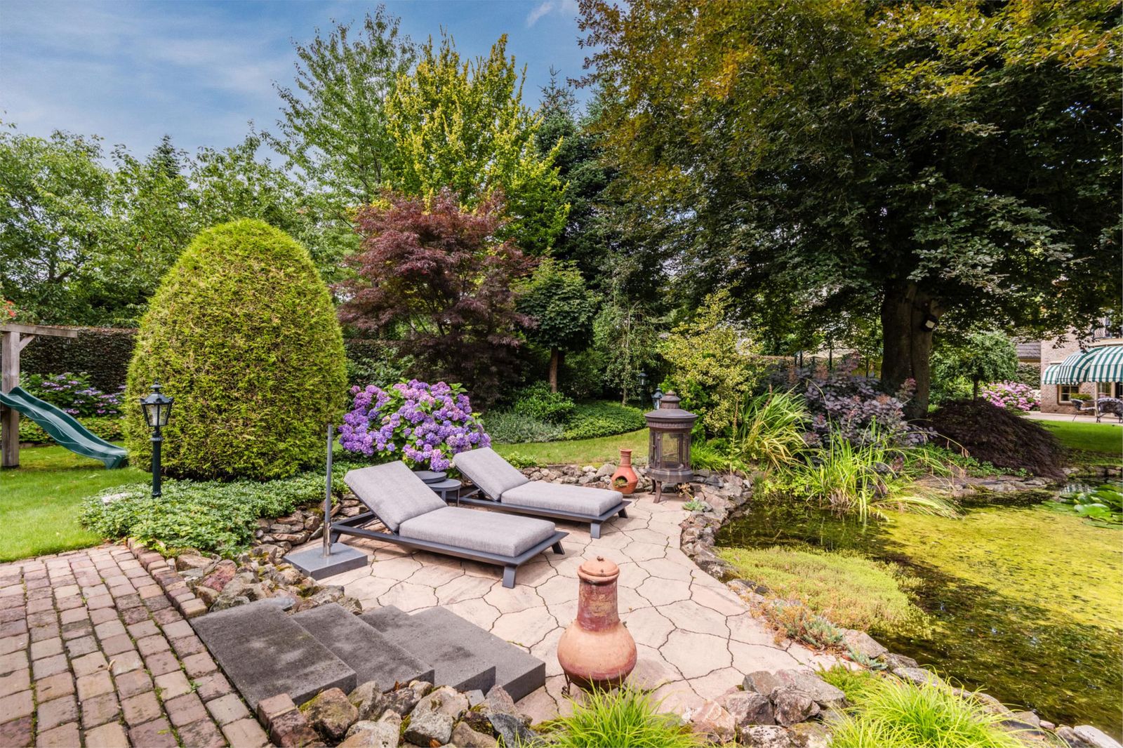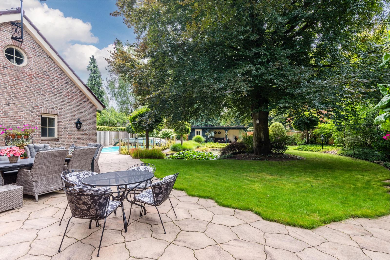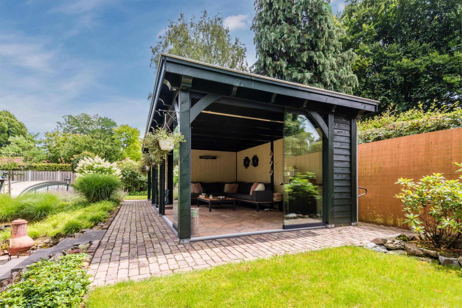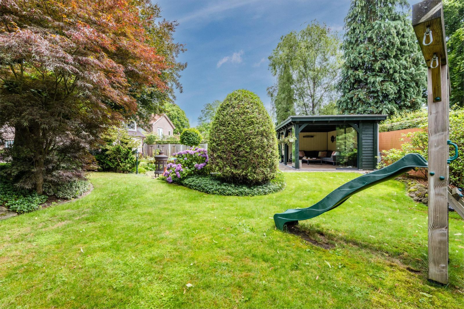 Het totale erf inclusief tuin is in 2020 met zorg en sfeer opnieuw aangelegd en onderhoudsarm ingericht. Het voorerf betreed je via de afstandsbediende toegangspoort en is grotendeels bestraat en biedt riante parkeerruimte. De zijtuin is een oase van kleurrijke hortensia's. In de achtertuin (34m diep en 32m breed) zijn organische vormen en hoogteverschillen toegepast zodat het geheel een rustige en natuurlijke uitstraling heeft. Er zijn grote borders met veel vaste planten/struiken, siergrassen en bodembedekkers en een deel gras. In de achtertuin staat prominent een prachtige rode beukenboom die in de zomer voor fijne schaduw zorgt en je altijd het gevoel geeft midden in de natuur te leven. Naast de beukenboom bevindt zich de grote vijver waaraan het verlaagde zonneterras is gesitueerd. Achter in de tuin staat het fraaie en robuuste tuinhuis met berging (Trendhout; 2020) met 9 glazen schuifwanden. Vanuit het tuinhuis beleef je de volledige tuin optimaal! Op het dak van het tuinhuis liggen 16 zonnepanelen. Er is een vaste UTP verbinding met het tuinhuis zodat je ook daar probleemloos internet kunt gebruiken!