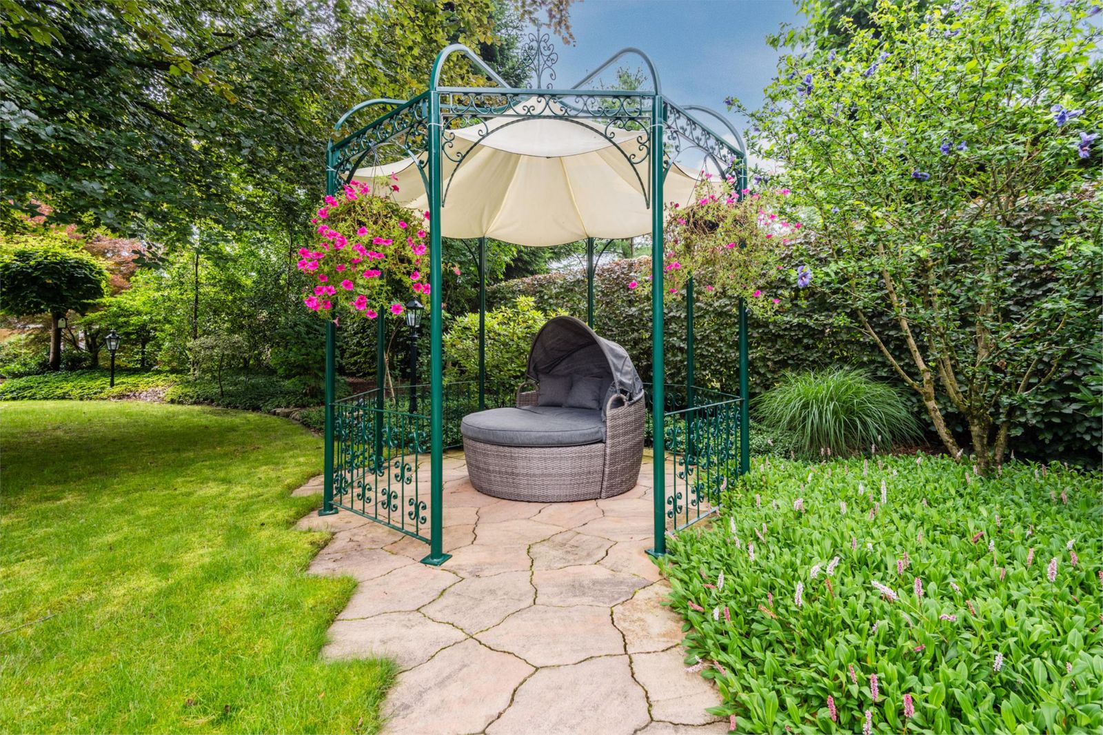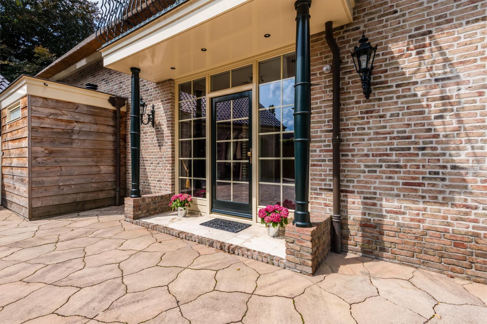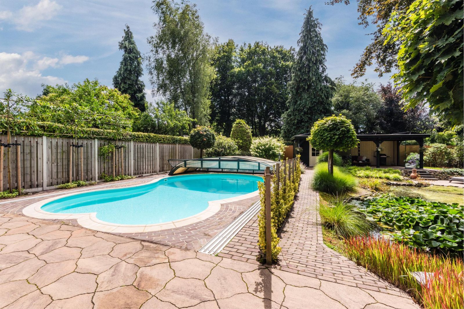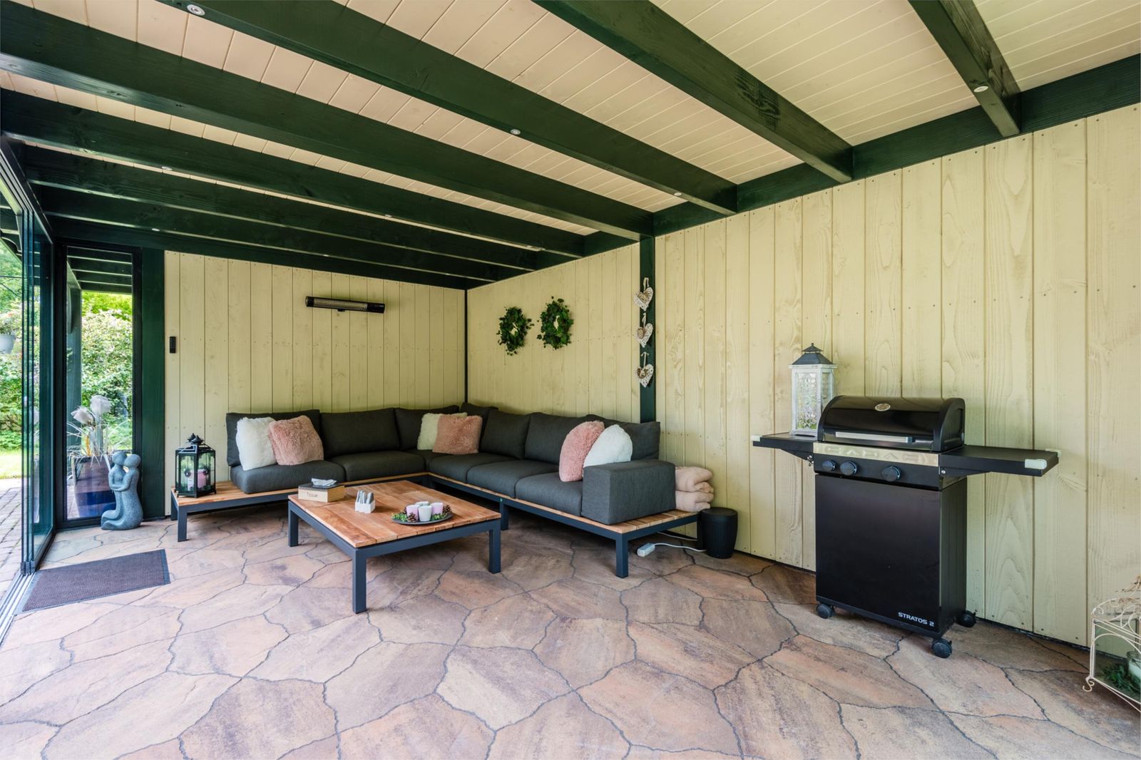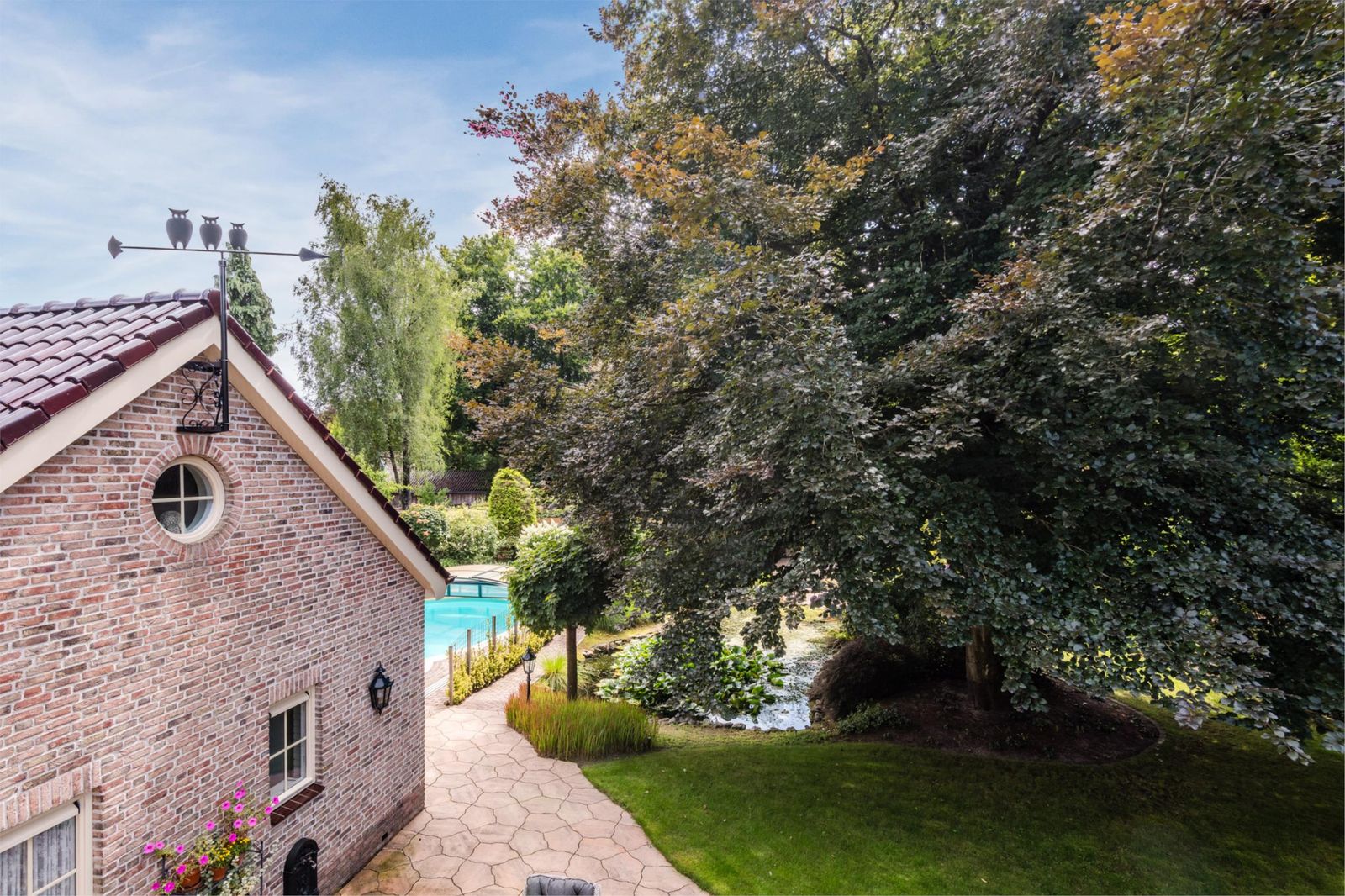 Het totale erf inclusief tuin is in 2020 met zorg en sfeer opnieuw aangelegd en onderhoudsarm ingericht. Het voorerf betreed je via de afstandsbediende toegangspoort en is grotendeels bestraat en biedt riante parkeerruimte. De zijtuin is een oase van kleurrijke hortensia's. In de achtertuin (34m diep en 32m breed) zijn organische vormen en hoogteverschillen toegepast zodat het geheel een rustige en natuurlijke uitstraling heeft. Er zijn grote borders met veel vaste planten/struiken, siergrassen en bodembedekkers en een deel gras. In de achtertuin staat prominent een prachtige rode beukenboom die in de zomer voor fijne schaduw zorgt en je altijd het gevoel geeft midden in de natuur te leven. Naast de beukenboom bevindt zich de grote vijver waaraan het verlaagde zonneterras is gesitueerd. Achter in de tuin staat het fraaie en robuuste tuinhuis met berging (Trendhout; 2020) met 9 glazen schuifwanden. Vanuit het tuinhuis beleef je de volledige tuin optimaal! Op het dak van het tuinhuis liggen 16 zonnepanelen. Er is een vaste UTP verbinding met het tuinhuis zodat je ook daar probleemloos internet kunt gebruiken!