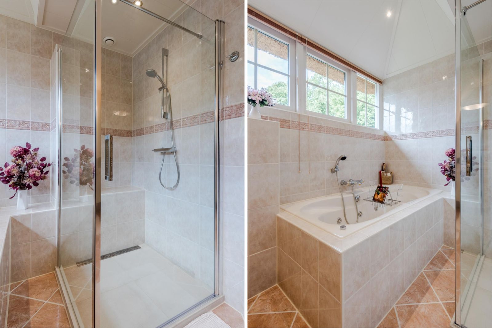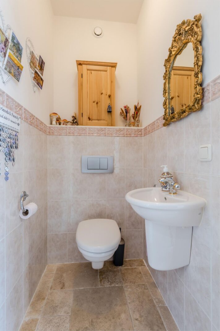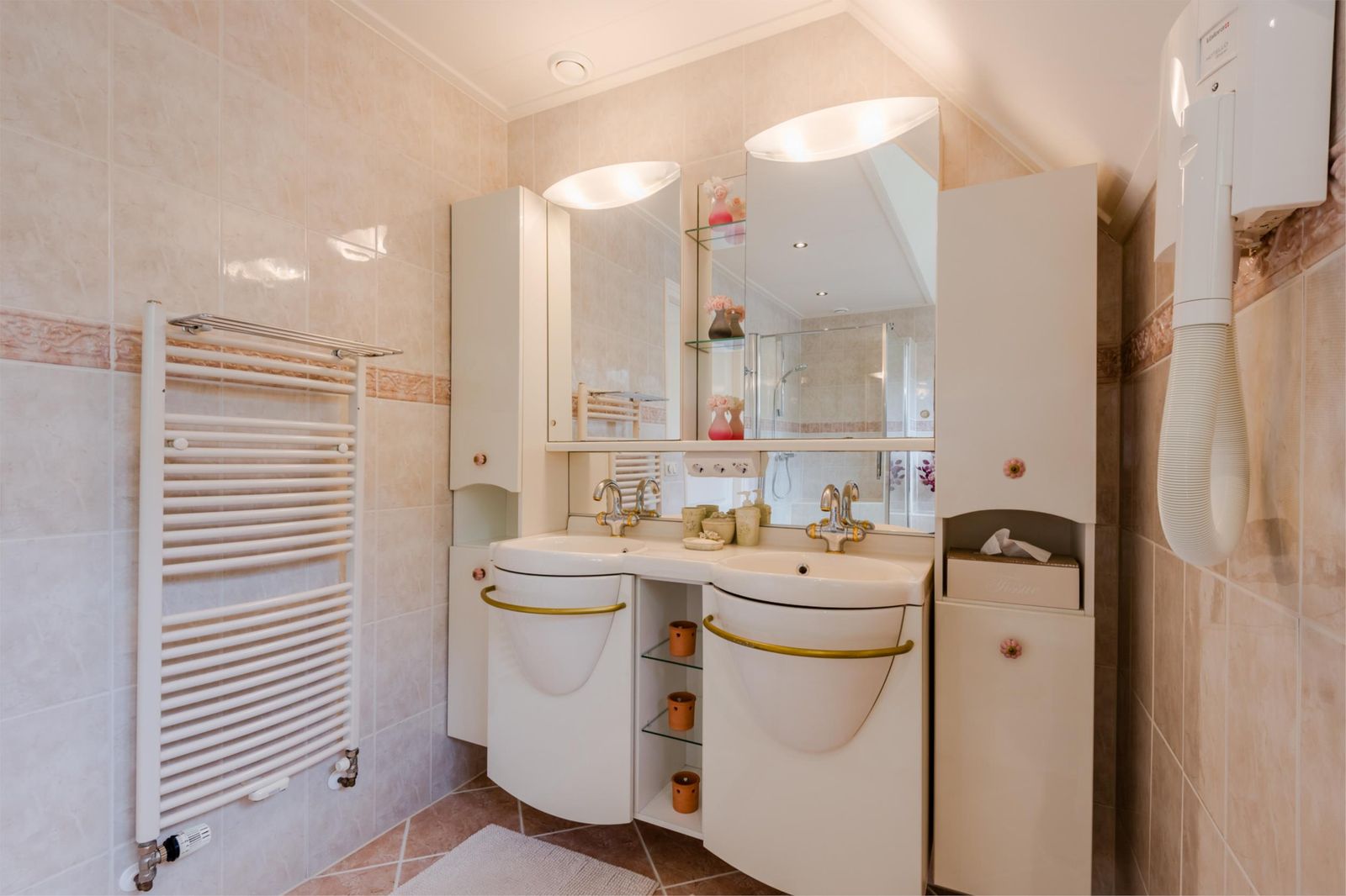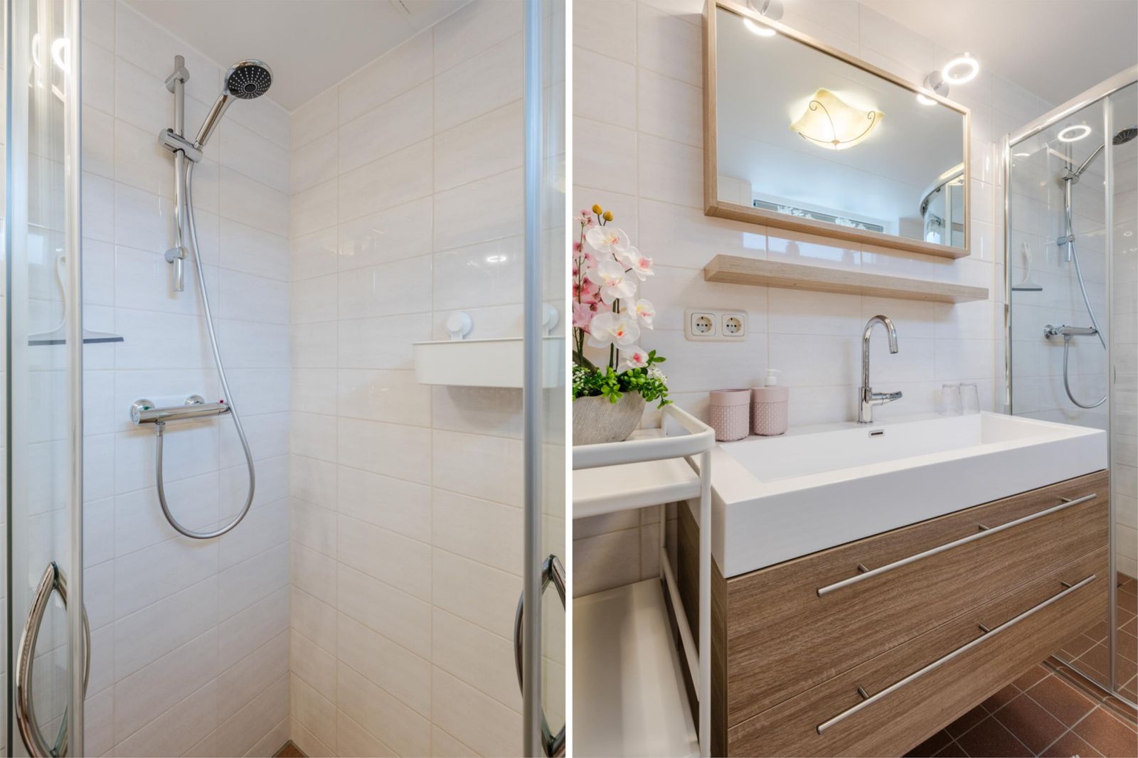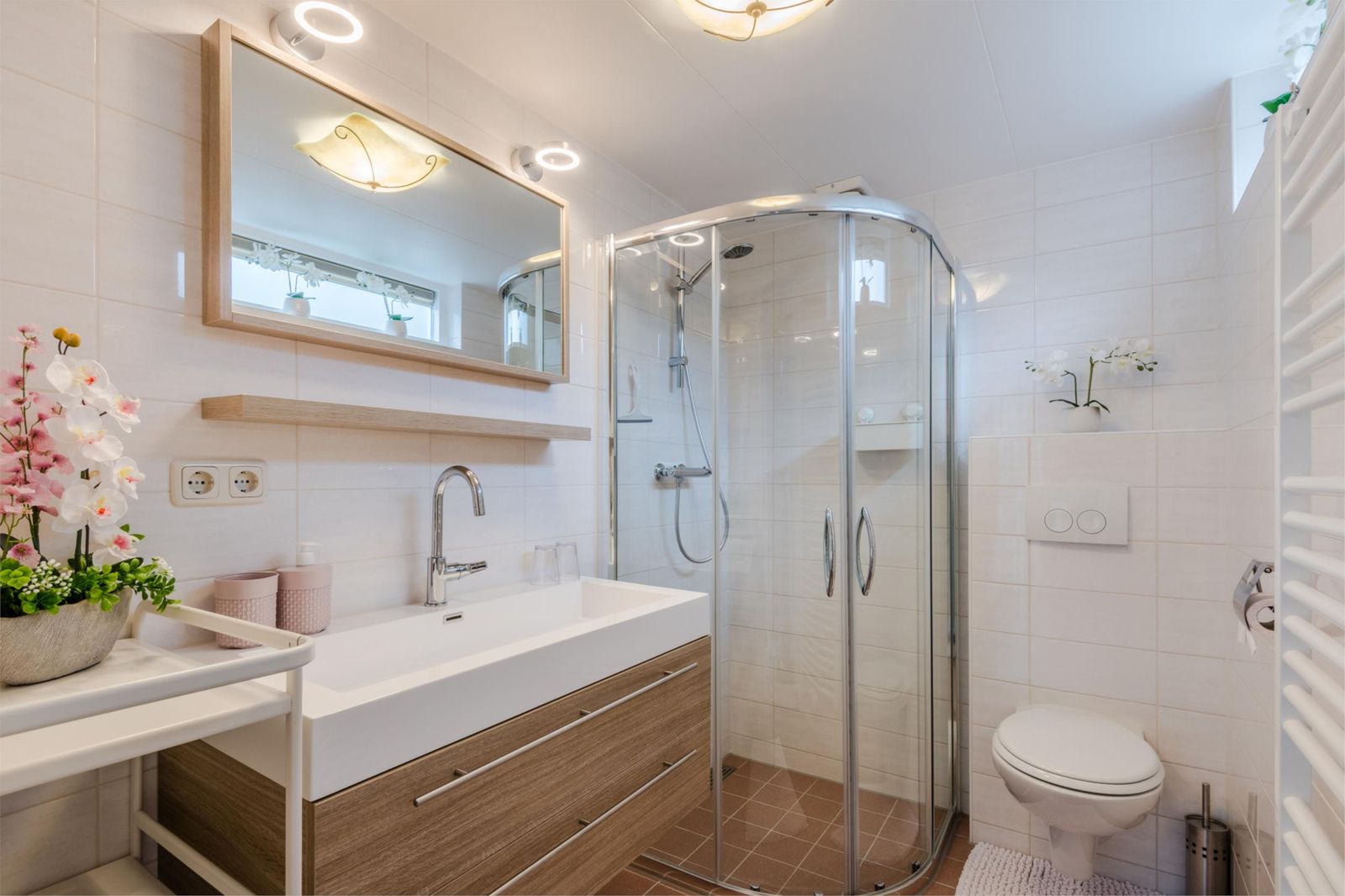 De badkamer op de begane grond is in 2020 nieuw aangebouwd en voorzien van douche, toilet, wastafelmeubel en wand-haardroger.
