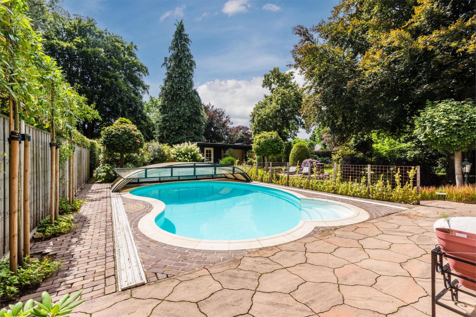 In de tuin vind je ook het grote overdekte zwembad van ongeveer 10x5 meter die wordt verwarmd met een eigen op afstand te bedienen warmtepomp (van 2023). Van mei tot oktober is het daardoor prima zwemmen op elke gewenste temperatuur. En wil je even in de schaduw bij het zwembad, dan rol je eenvoudig het afstandsbediende zonnescherm van 7x3 meter uit die aan de garage hangt.