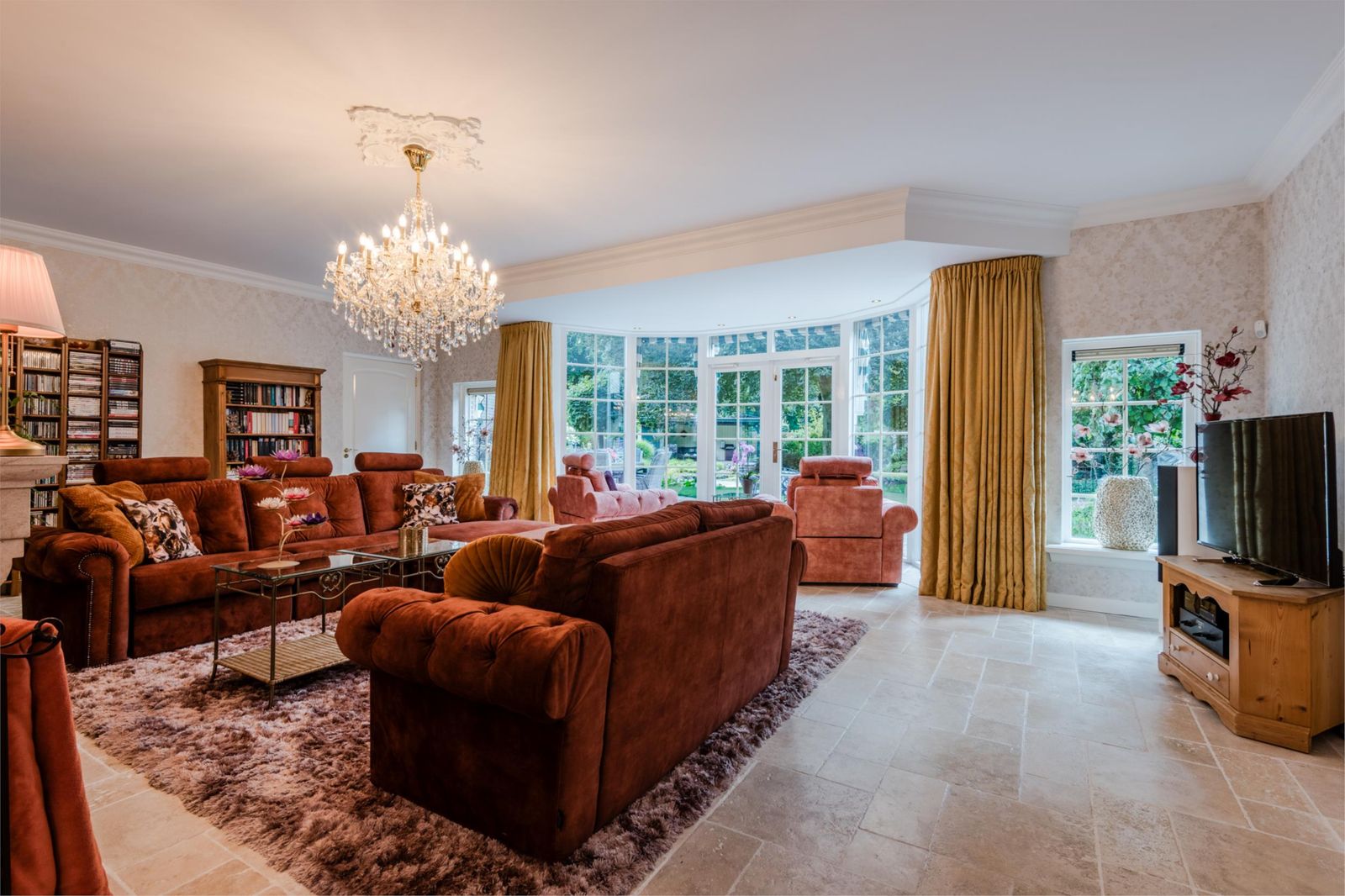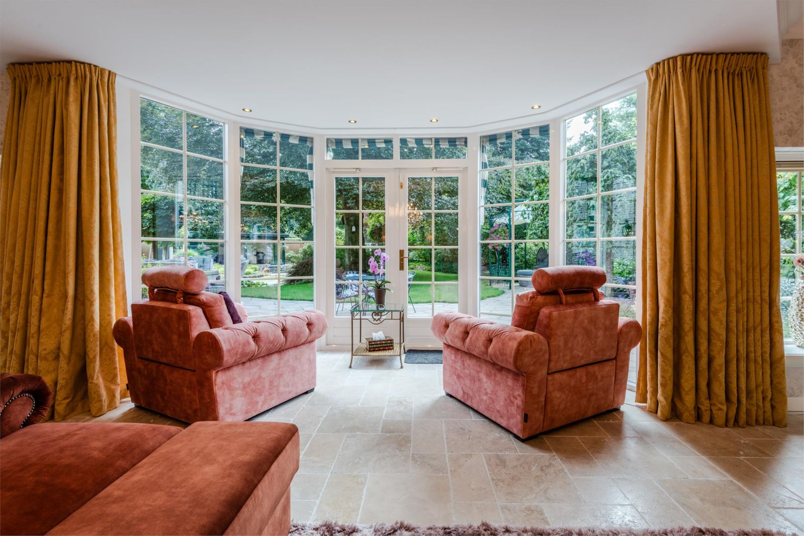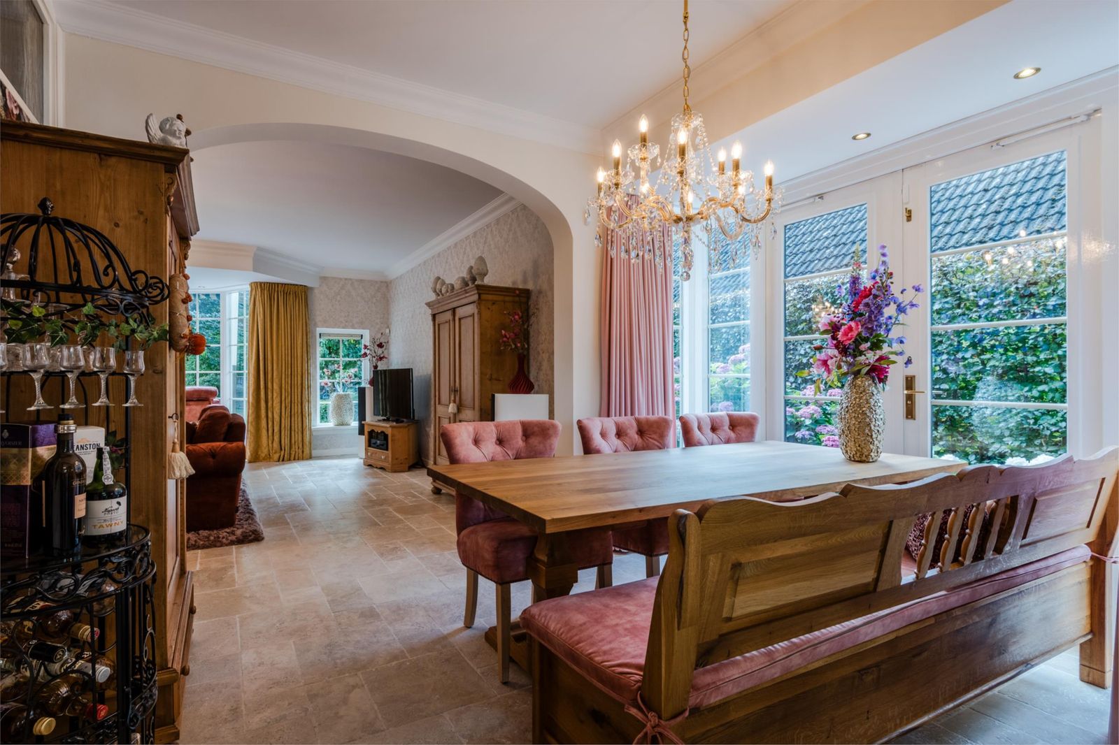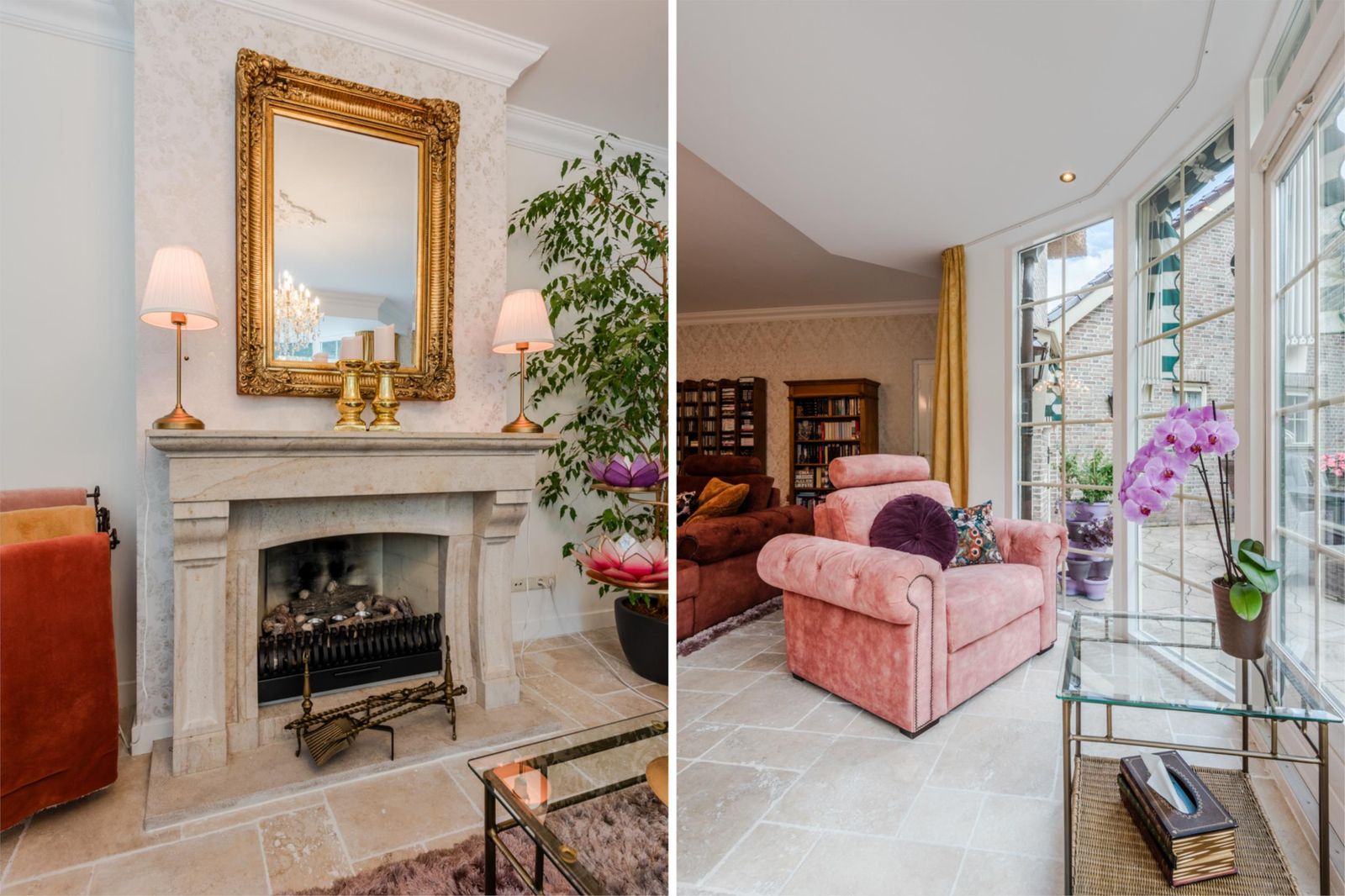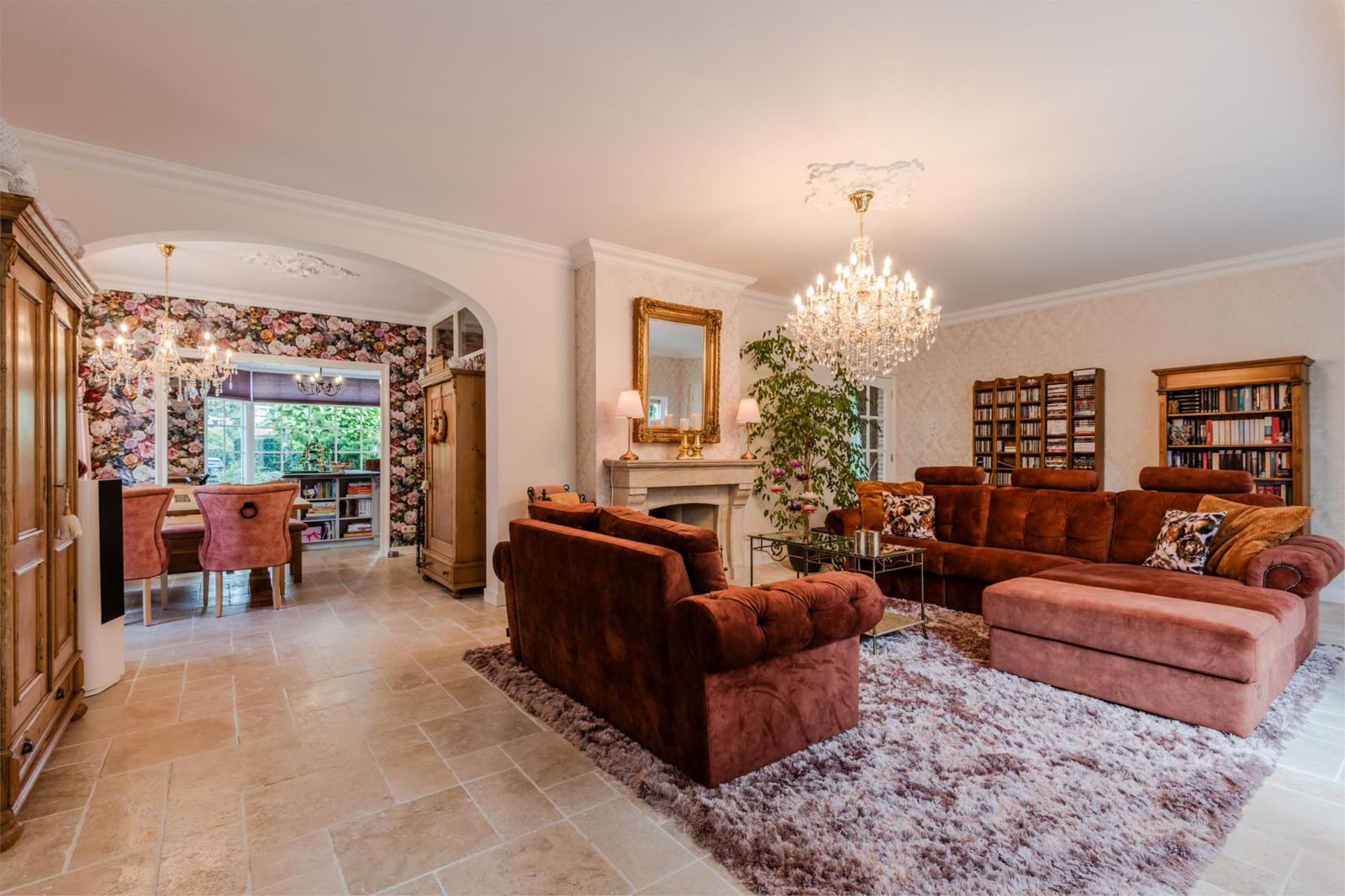 De hal ontsluit ook de zeer riante living met woonkamer en eetkamer en twee serres waar direct de aandacht naar het prachtige uitzicht op de riante tuin wordt getrokken. Sfeervol is de grote schouw met (gel) haard. De 2,85 meter hoge plafonds zijn voorzien van sierlijke ornamenten.
