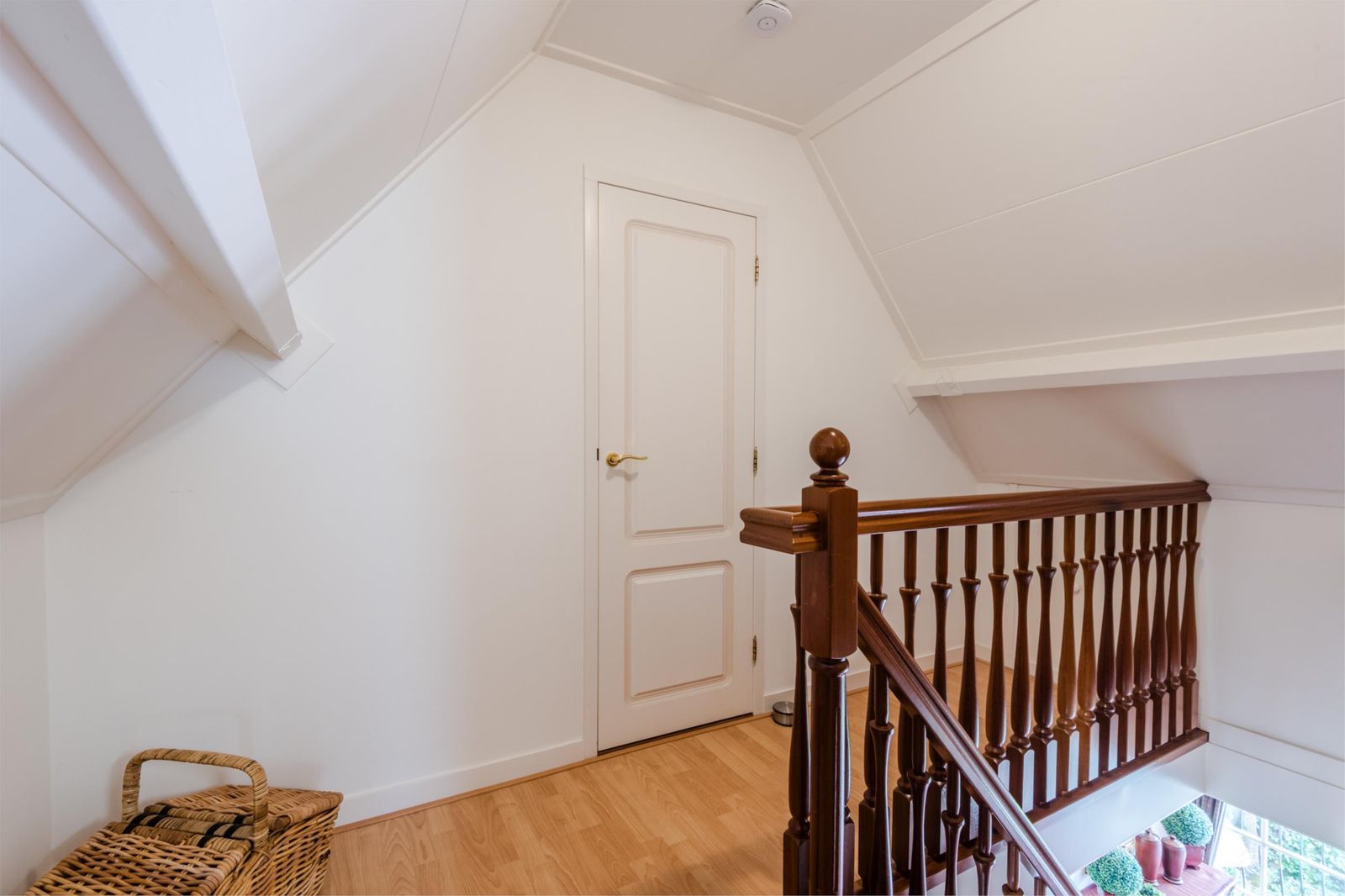 De hardhouten bordes-trap geeft toegang tot de zeer ruime hal met fraaie vide, grote raampartij en balkon. Aan de voorzijde zijn twee slaapkamers waarvan er nu één als kantoor annex wasruimte in gebruik is. De badkamer is zeer ruim opgezet met een badmeubel met dubbele wastafel, toilet, ruime douche (1x1m), wand-haardroger en een tweepersoons Ucosan ligbad met een zeer stil whirlpoolsysteem.