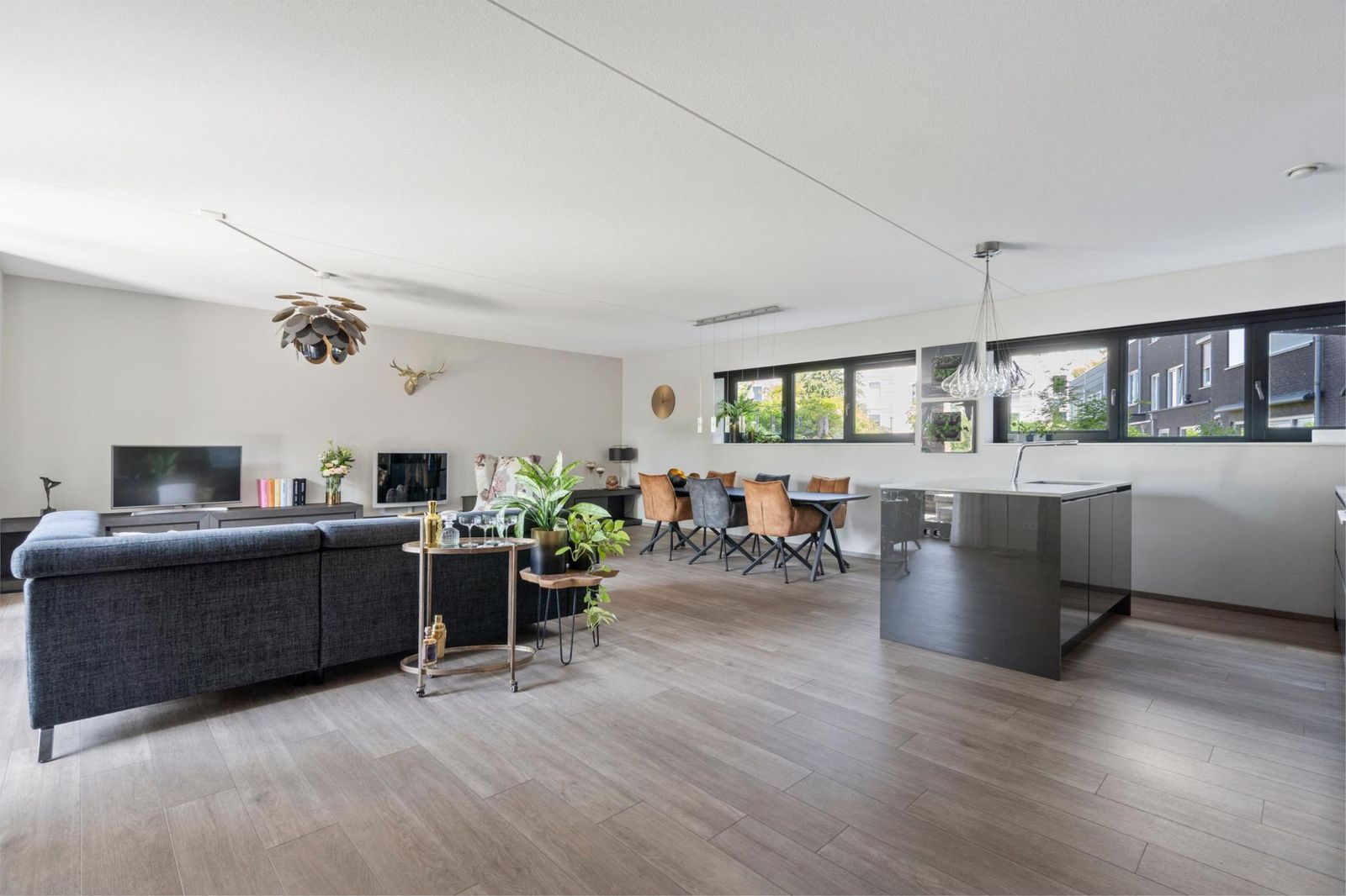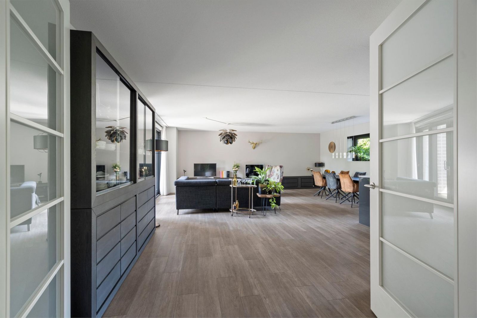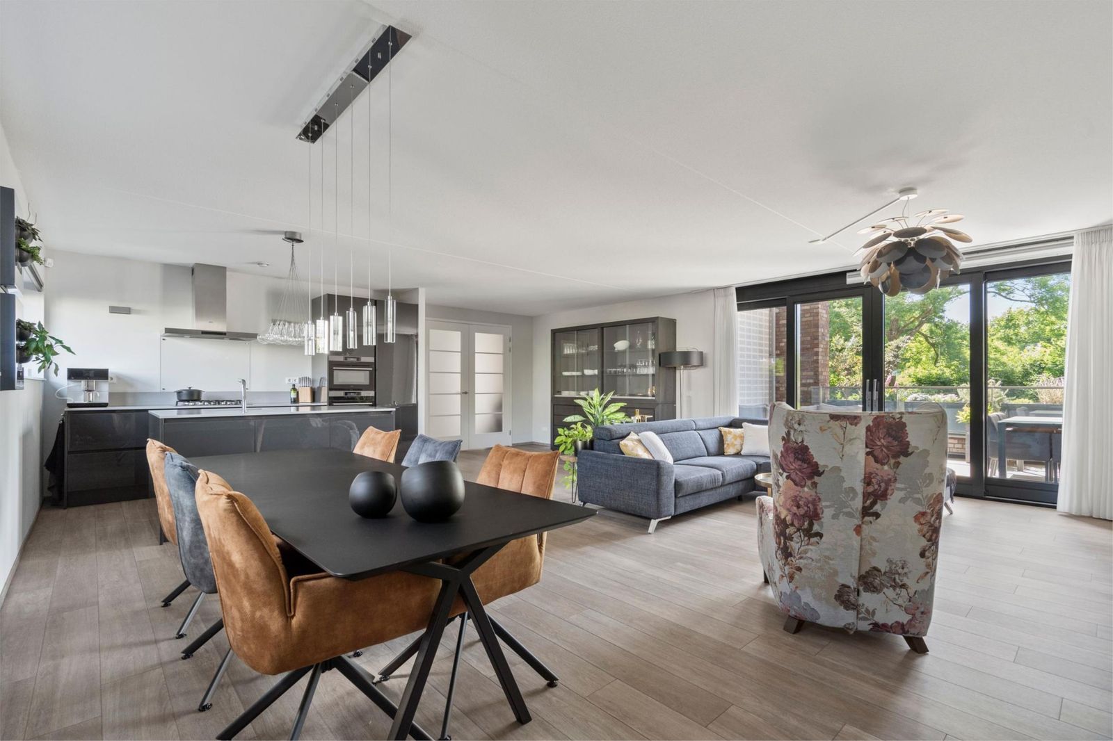 •Woonkamer: Via dubbele openslaande deuren betreedt u de lichte en ruime woonkamer van ca. 63 m². Dankzij de grote raampartijen geniet u van veel daglicht en uitzicht op groen. Er is volop ruimte voor een comfortabele zithoek én een grote eettafel — perfect voor gezellige momenten met familie of vrienden.