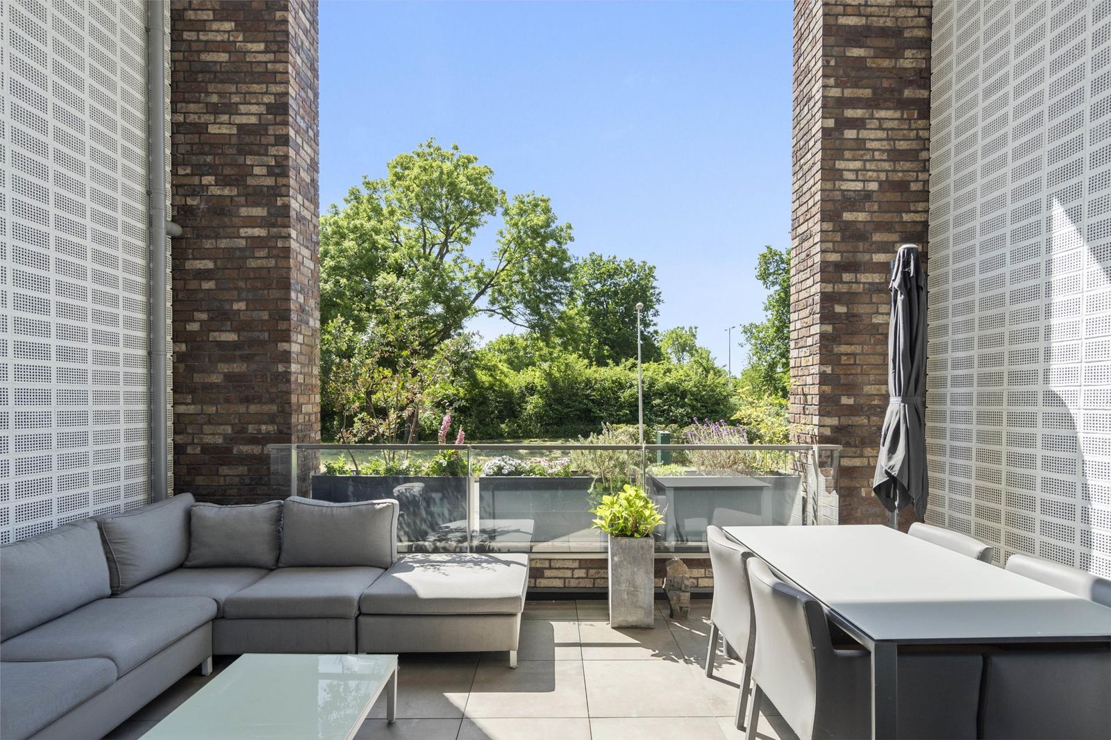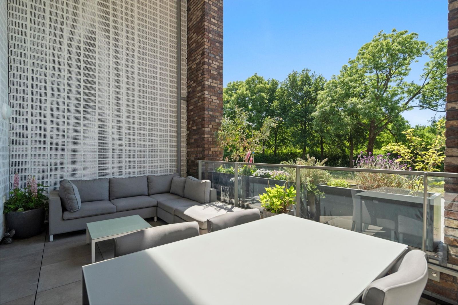 •Balkon: Vanuit de woonkamer loopt u zo het inpandige balkon op het zuiden op (ca. 19 m²). Deze beschutte buitenruimte met hoog plafond biedt veel privacy en een vrij uitzicht op een groene parkstrook. Een heerlijke plek voor uw ochtendkoffie of een goed boek.