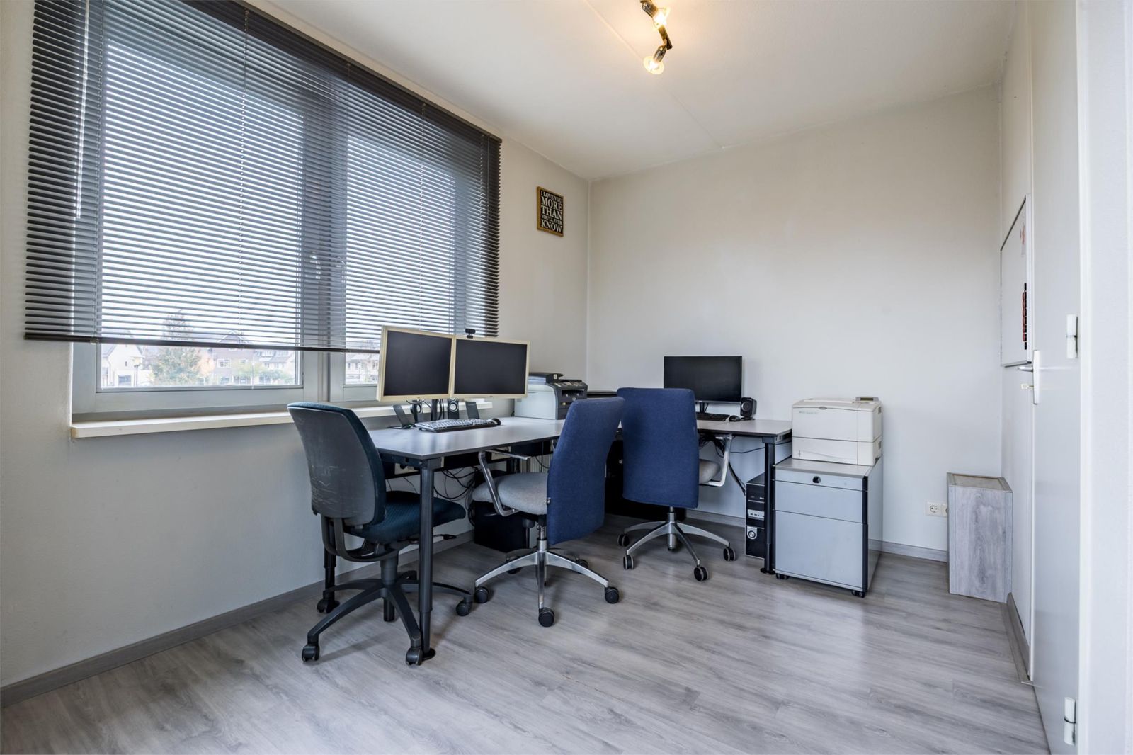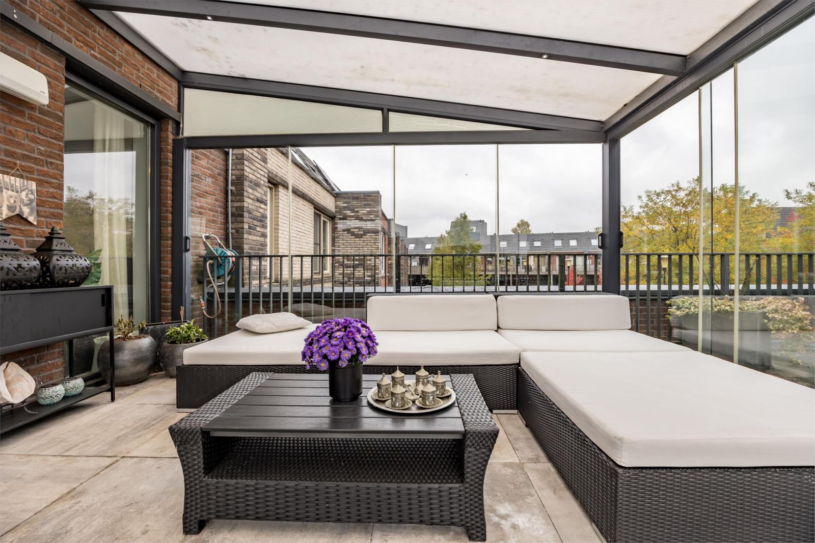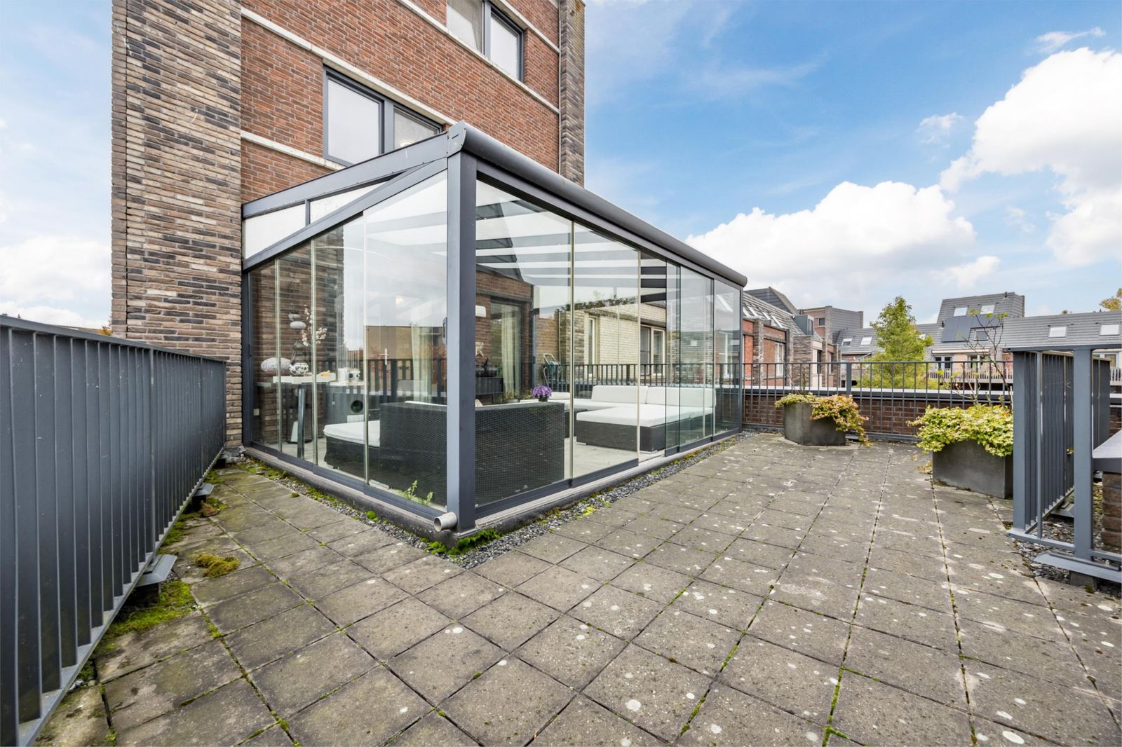 Op de 1e verdieping liggen twee volwaardige (slaap)kamers, waarvan er één nu gebruikt wordt als kantoor/leef-/hobbyruimte. Vanuit hier stap je zó het eigen dakterras van ca. 27,5 m² op, met een serre (ca. 5×4 m) en een stenen barbecue: een tweede buitenwoonkamer, beschut en bijna het hele jaar door te gebruiken. De verdiepingen zijn afgewerkt met laminaat.
