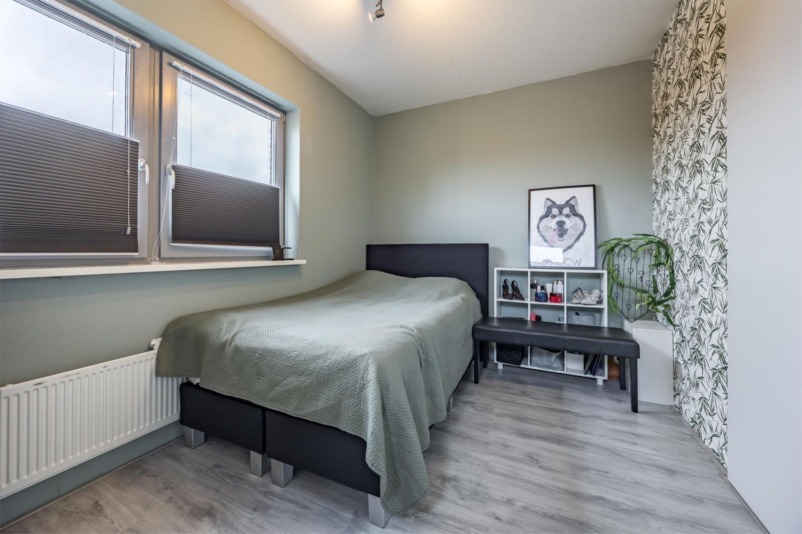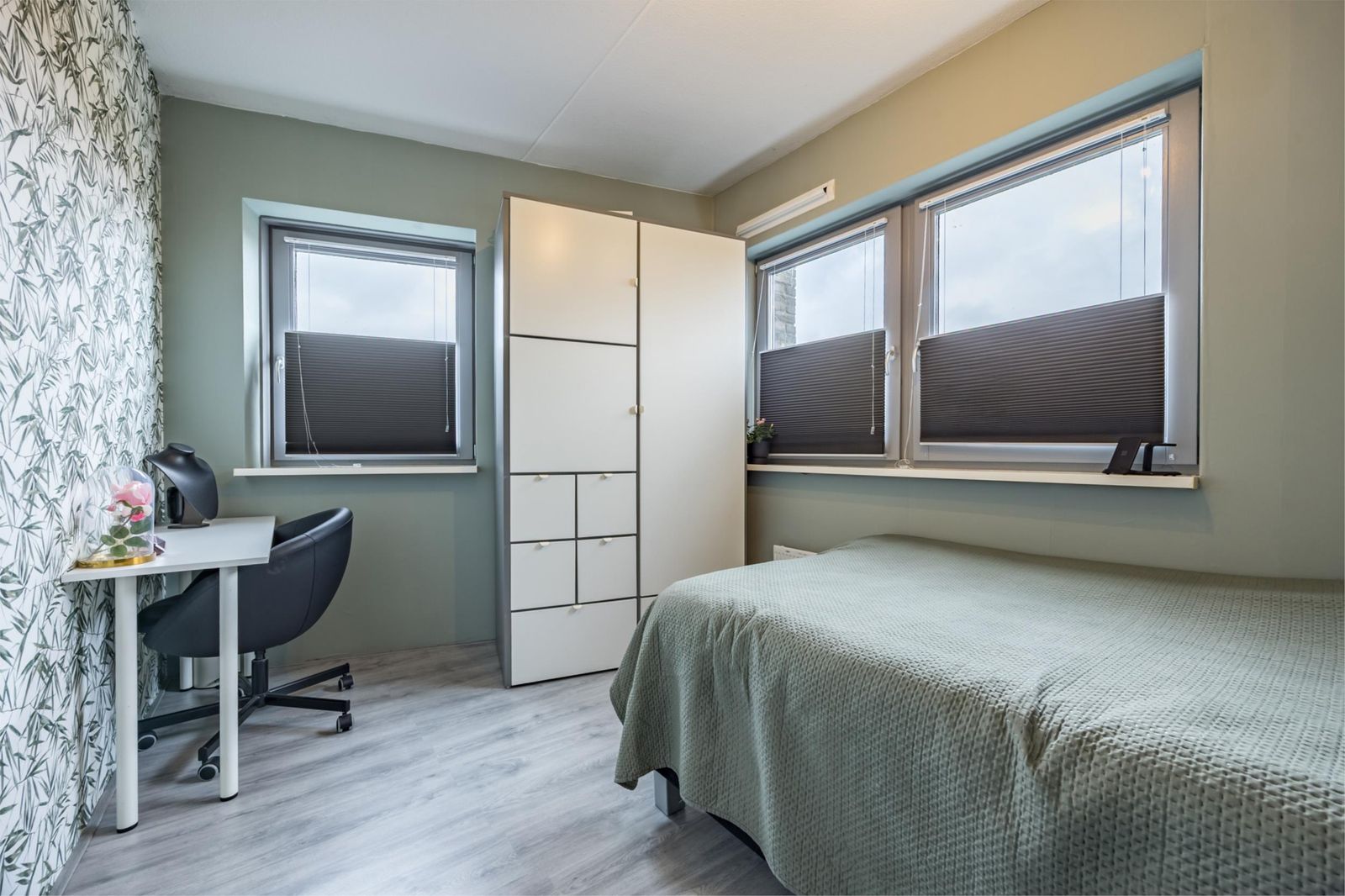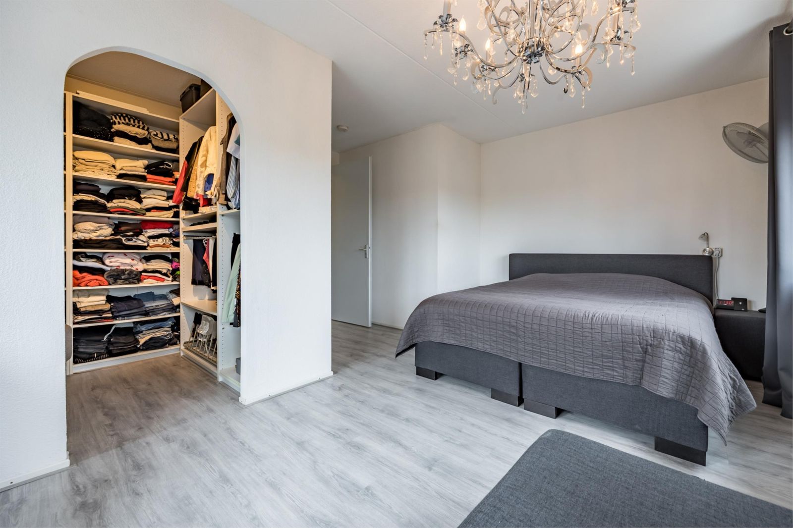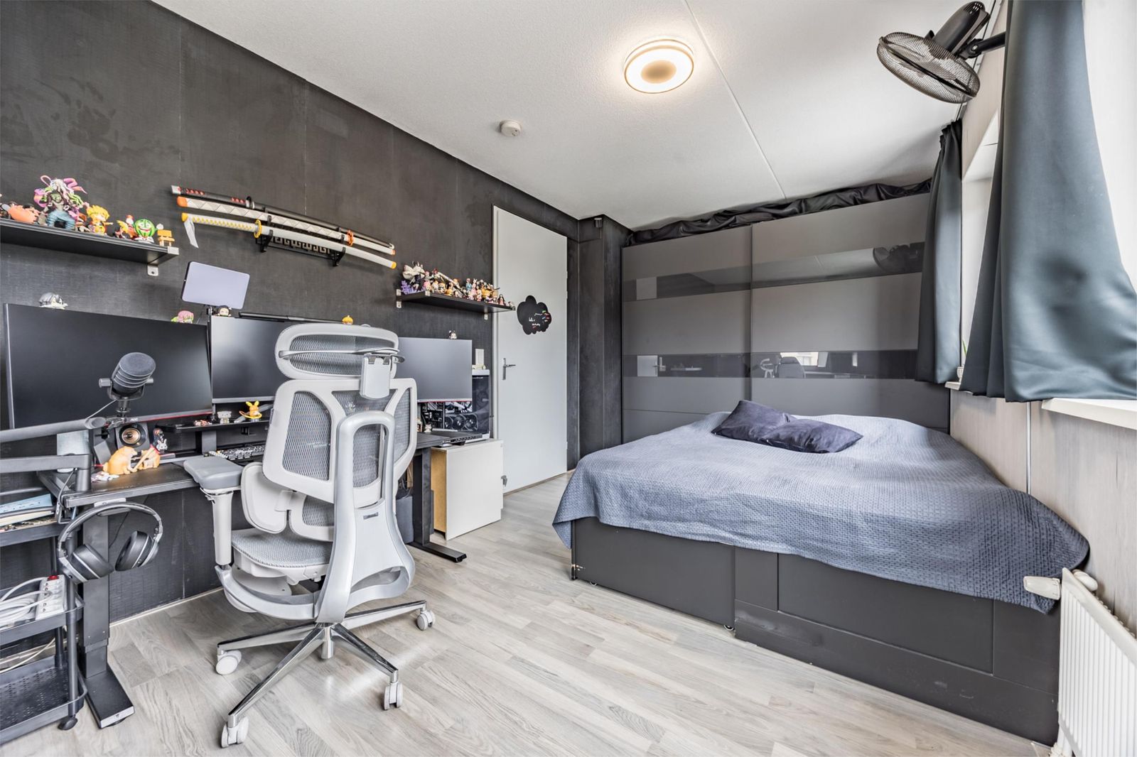 Op de 1e verdieping liggen twee volwaardige (slaap)kamers, waarvan er één nu gebruikt wordt als kantoor/leef-/hobbyruimte. Vanuit hier stap je zó het eigen dakterras van ca. 27,5 m² op, met een serre (ca. 5×4 m) en een stenen barbecue: een tweede buitenwoonkamer, beschut en bijna het hele jaar door te gebruiken. De verdiepingen zijn afgewerkt met laminaat.
