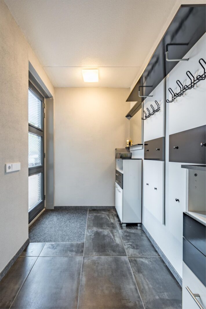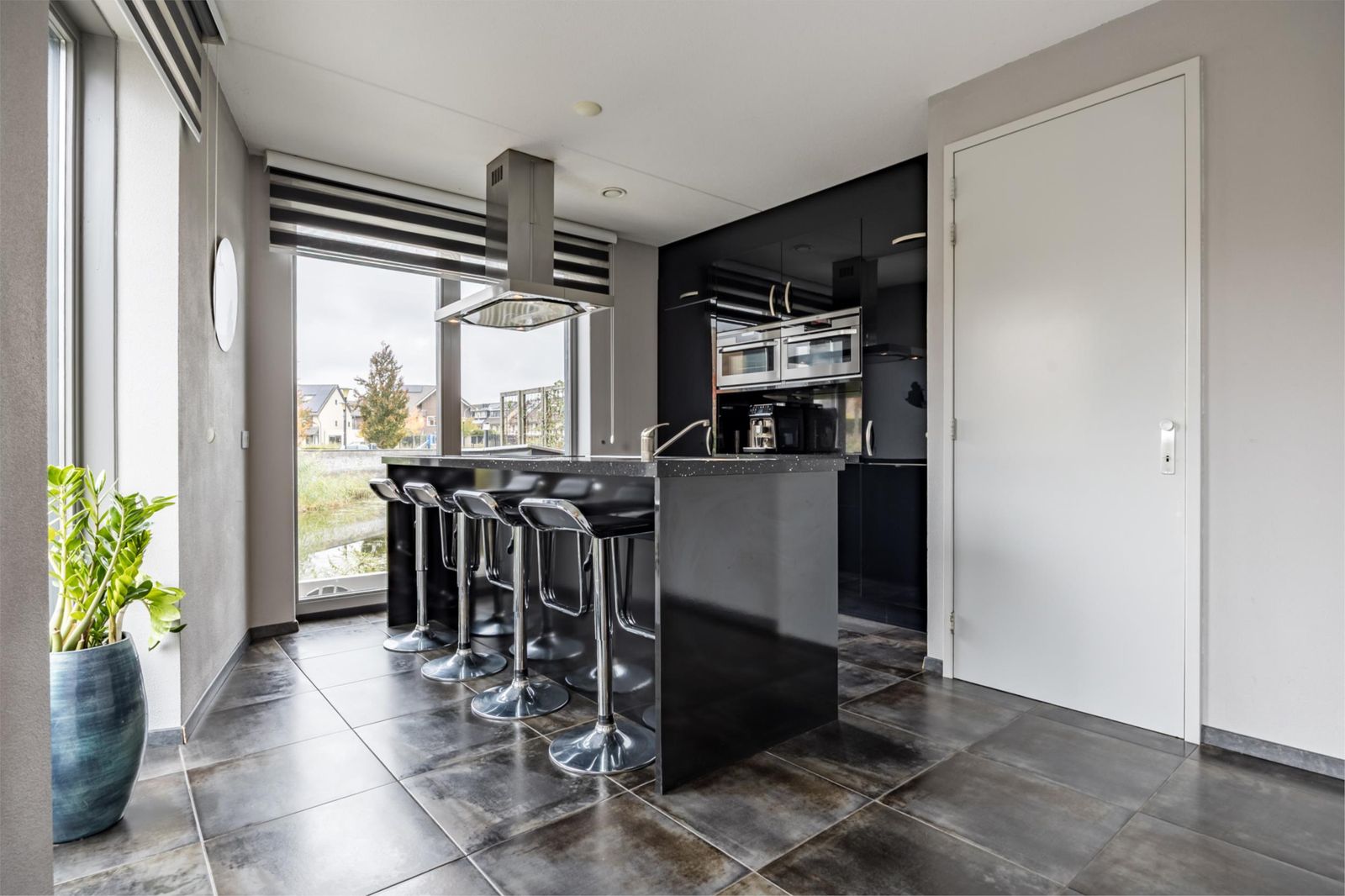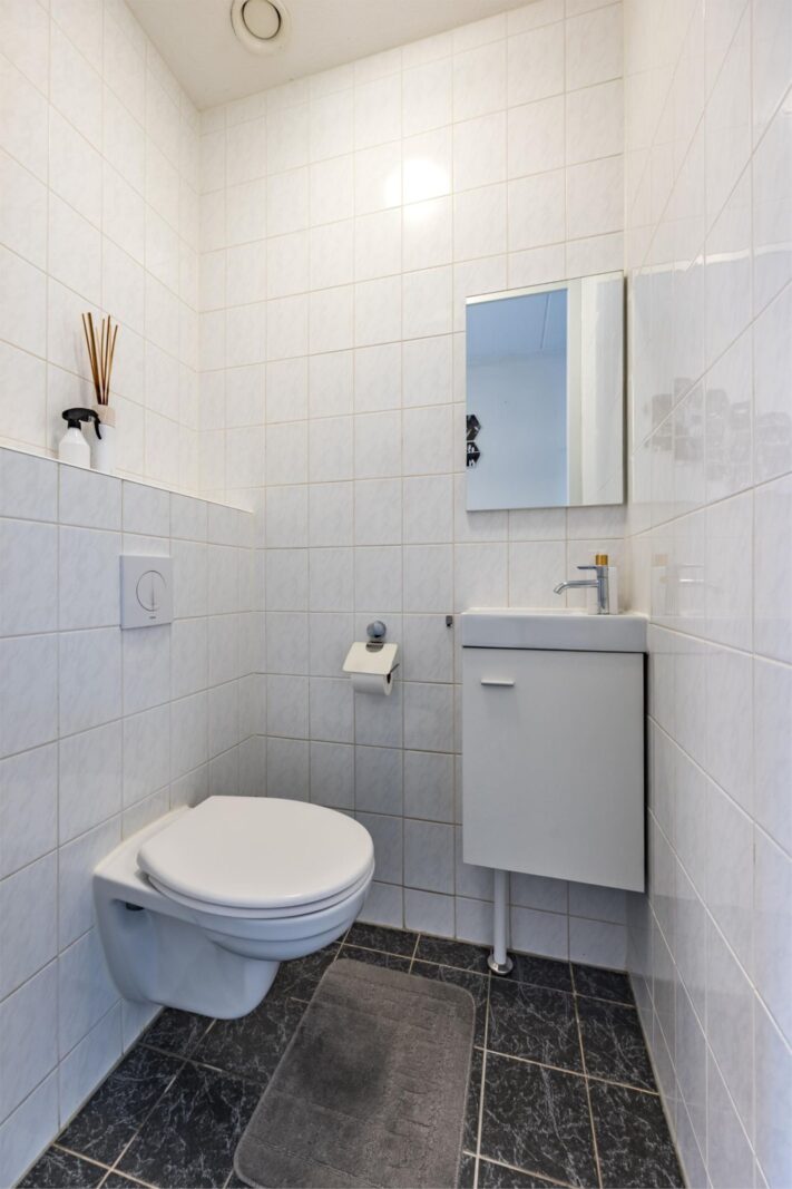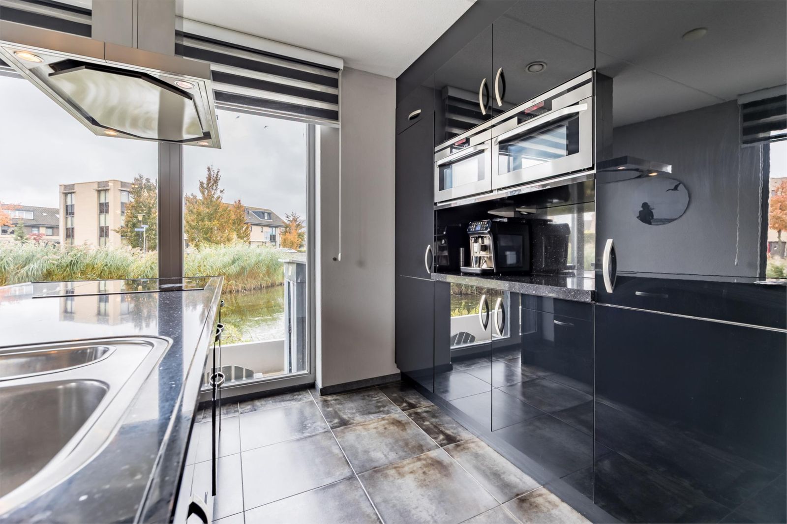Over de gehele begane grond liggen plavuizen met vloerverwarming (hoofdverwarming): comfortabel, slijtvast en onderhoudsarm. De hoogglans zwarte keuken met kookeiland vormt het hart van het huis—samen koken, borrelen aan het eiland en altijd in verbinding met de woonkamer en het terras aan het water. Voorzien van inbouwapparatuur (oven, magnetron), een ruime koel-/vriescombinatie en veel kastruimte. In de royale hal: een separaat toilet, plek voor garderobe/schoenkasten en handige voorraadberging onder de trap.