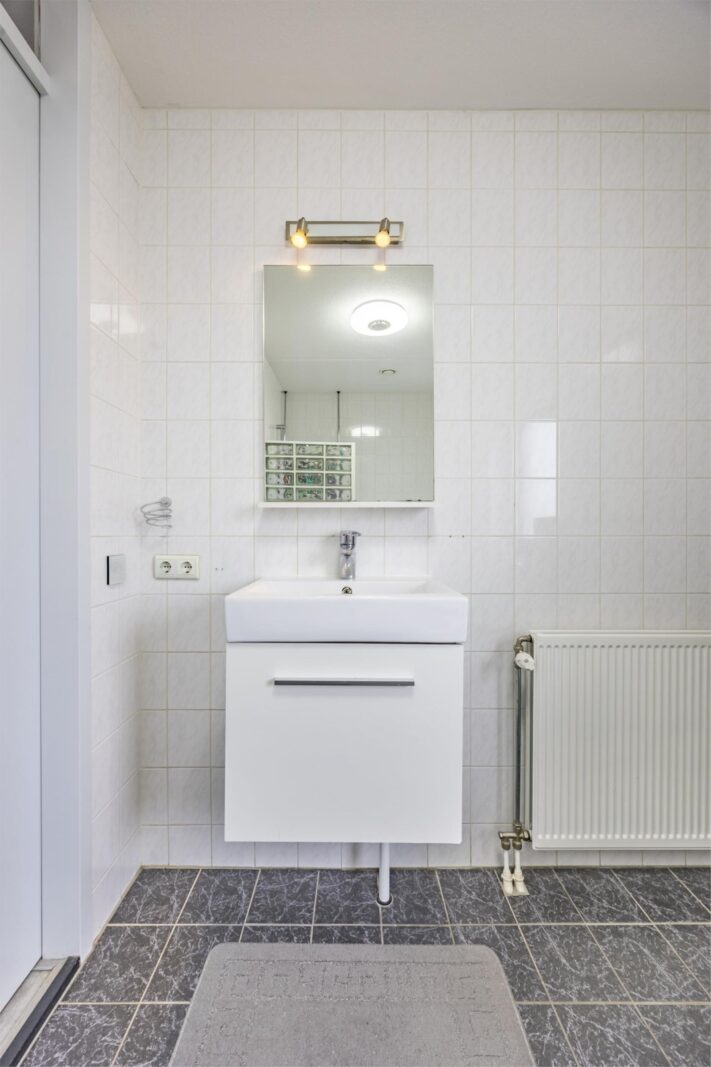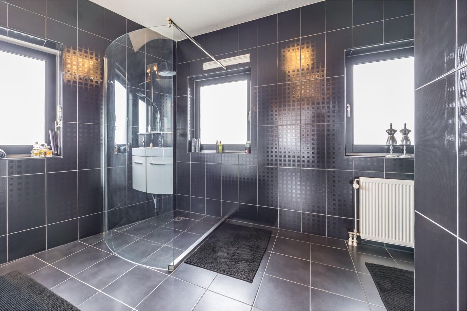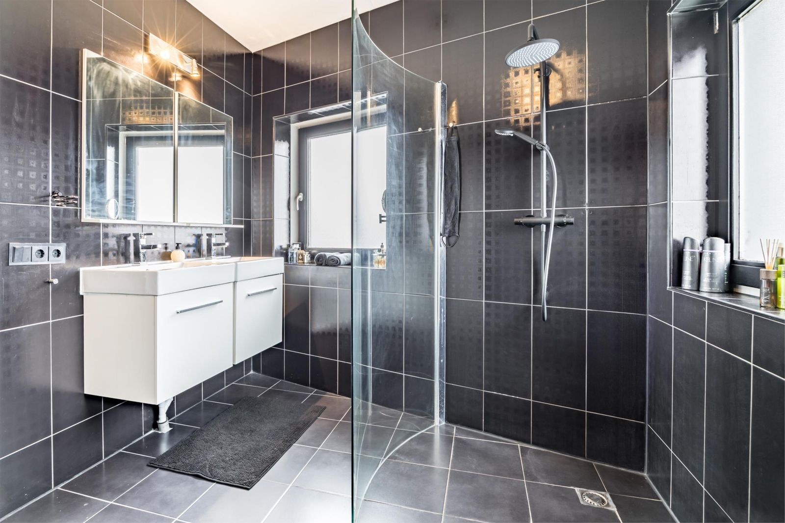 De 3e verdieping is een volwaardige slaapverdieping met een ruime vijfde slaapkamer inclusief ingebouwde kledingkast, een tweede badkamer (stijlvol zwart, volledig betegeld) met inloopdouche, dubbele wastafel en toilet. Hier vind je ook de praktische waskast (voor wasmachine/droger), extra bergruimte en de cv-opstelling.