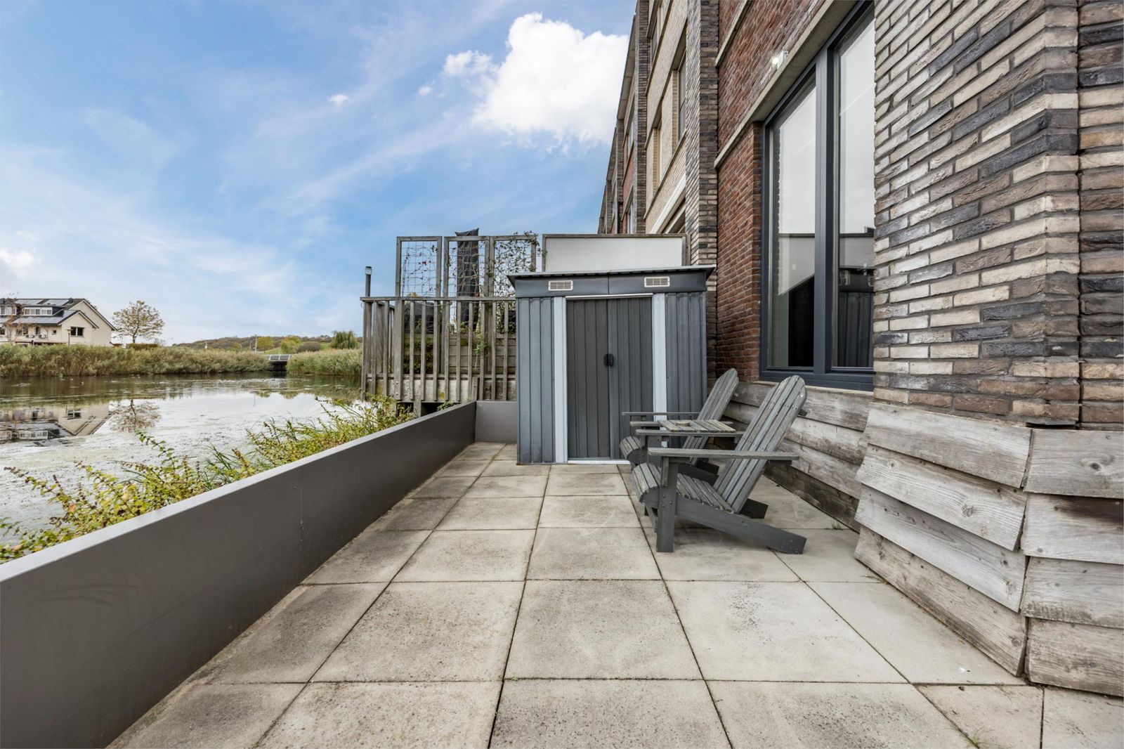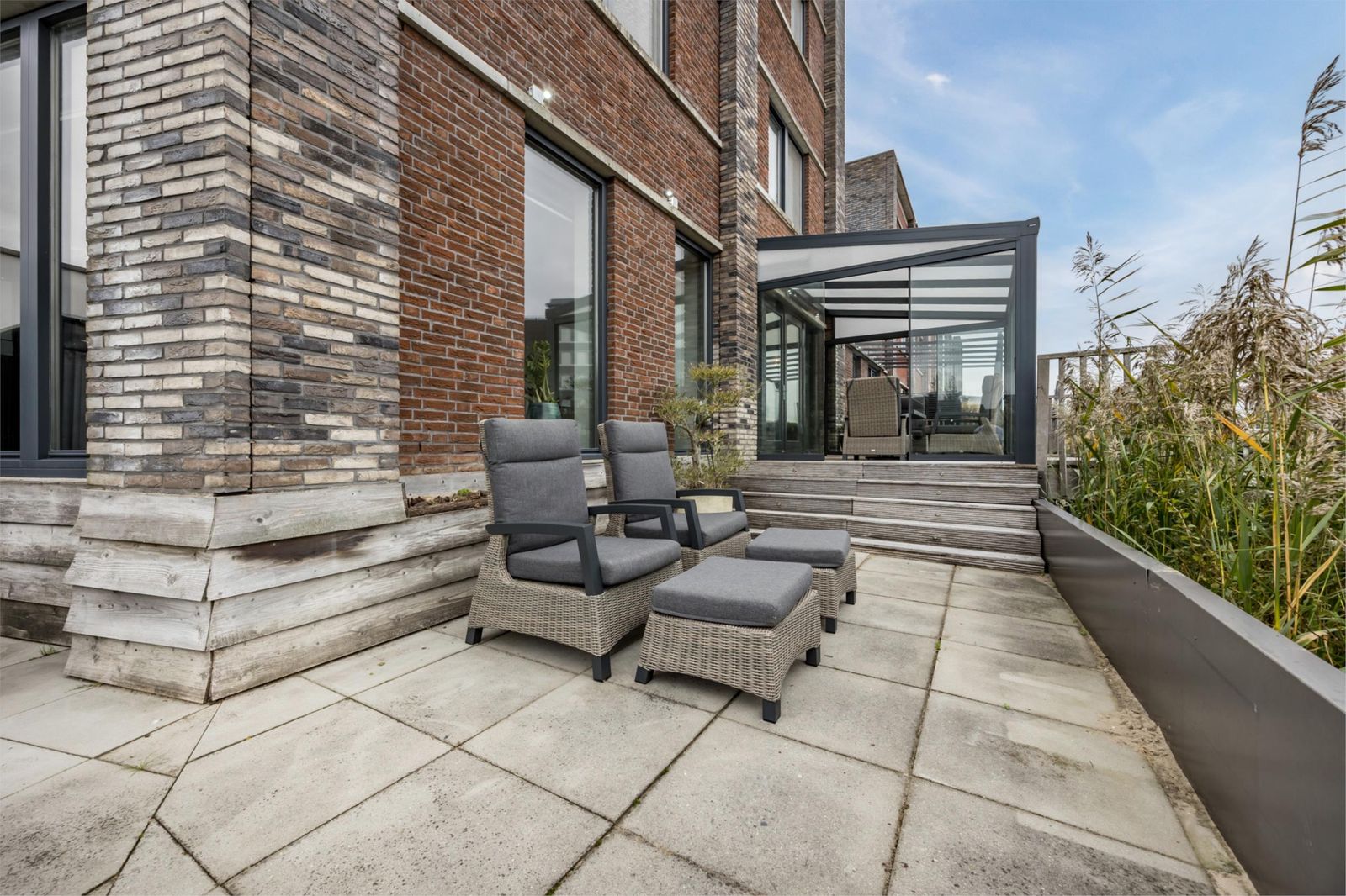 - Buiten: waterrand-terras ca. 60,7 m² met serre | dakterras ca. 27,5 m² met serre (ca. 5×4 m) | extra zonneterras ca. 35 m² (zuid)