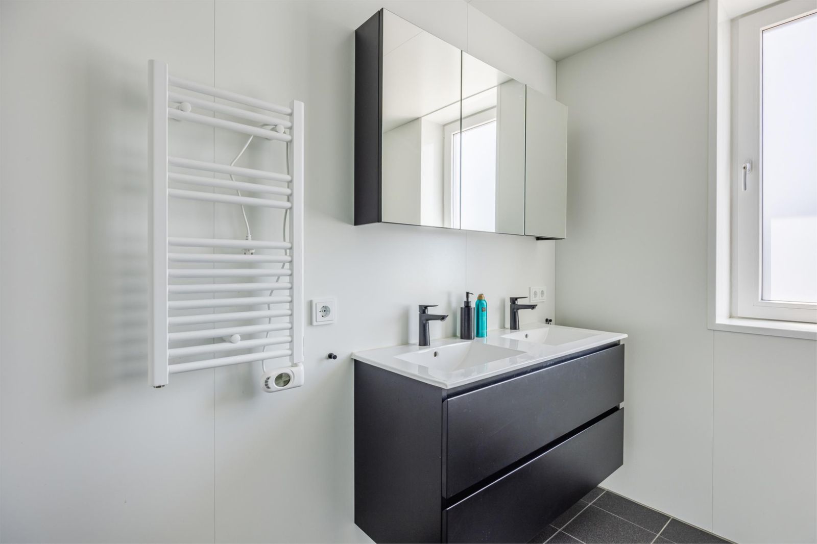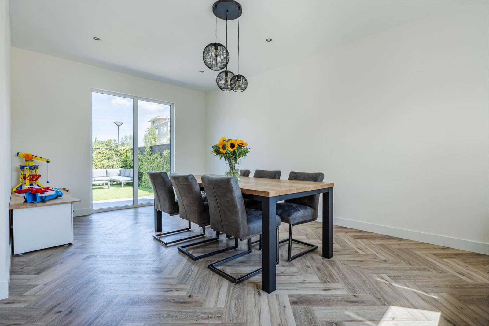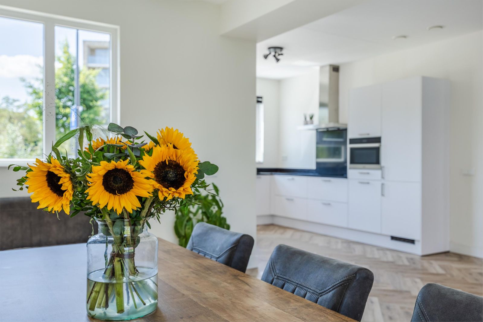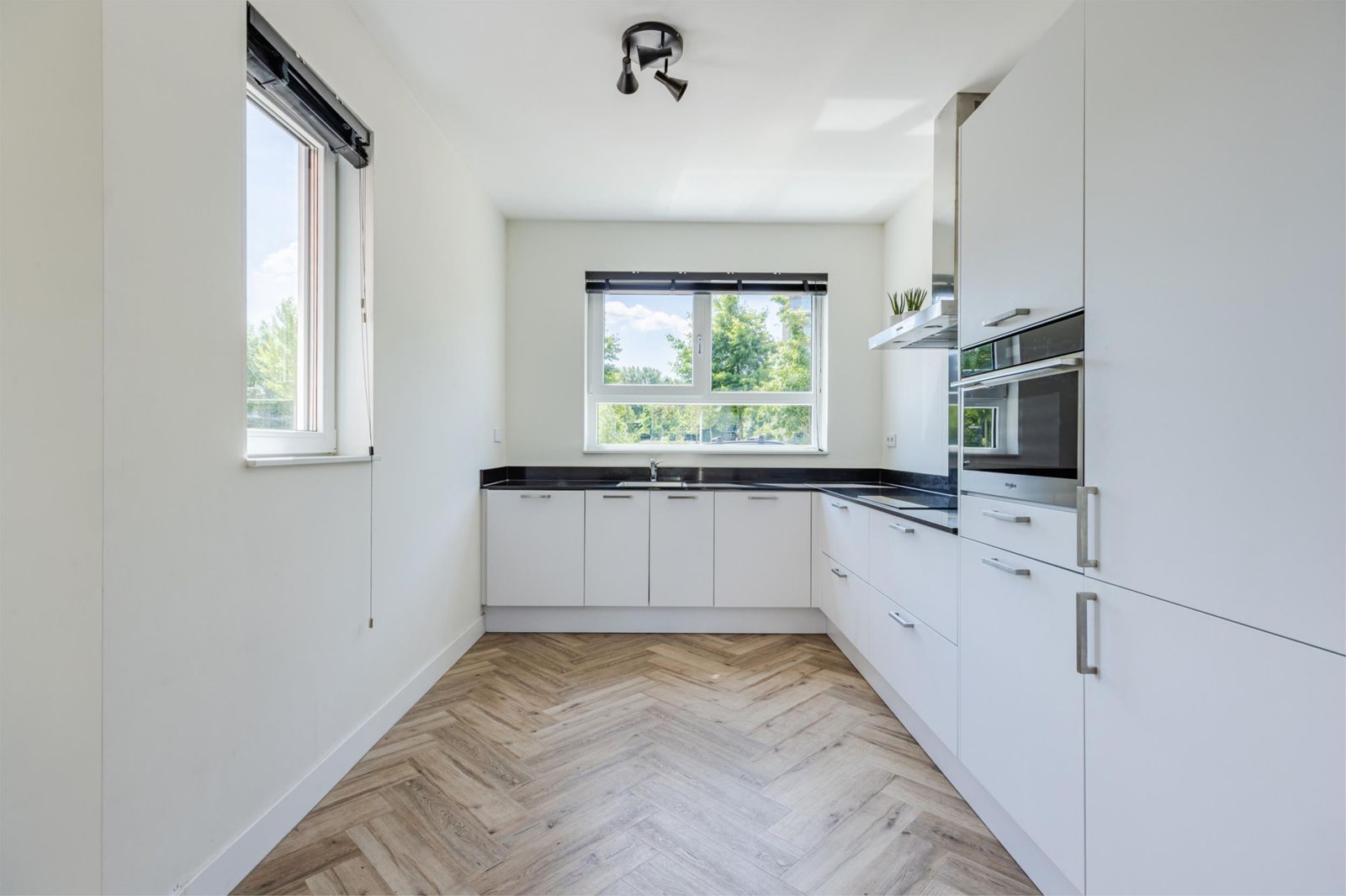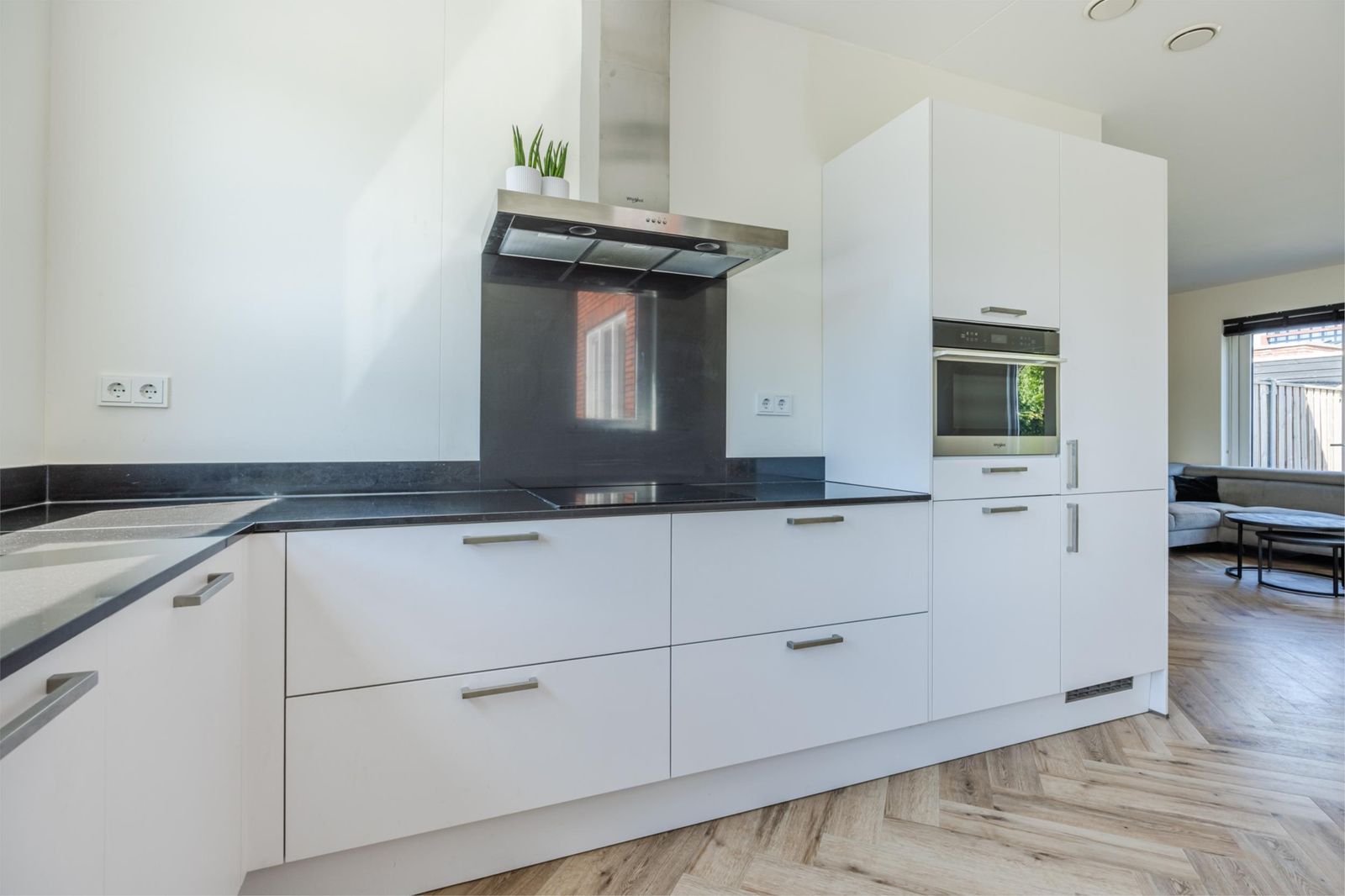 Aan de voorzijde vind je de strakke, witte keuken voorzien van alle gemakken en inbouwapparatuur, waaronder een inductiekookplaat, combi ovenmagnetron, koelkast, vriezer en vaatwasser. Door de hoge raampartijen is de woning bijzonder licht.