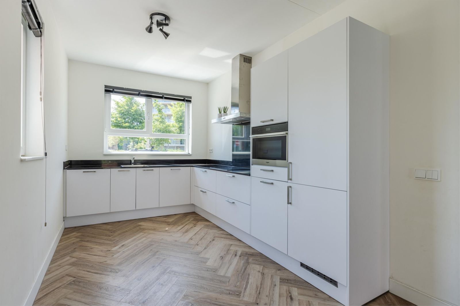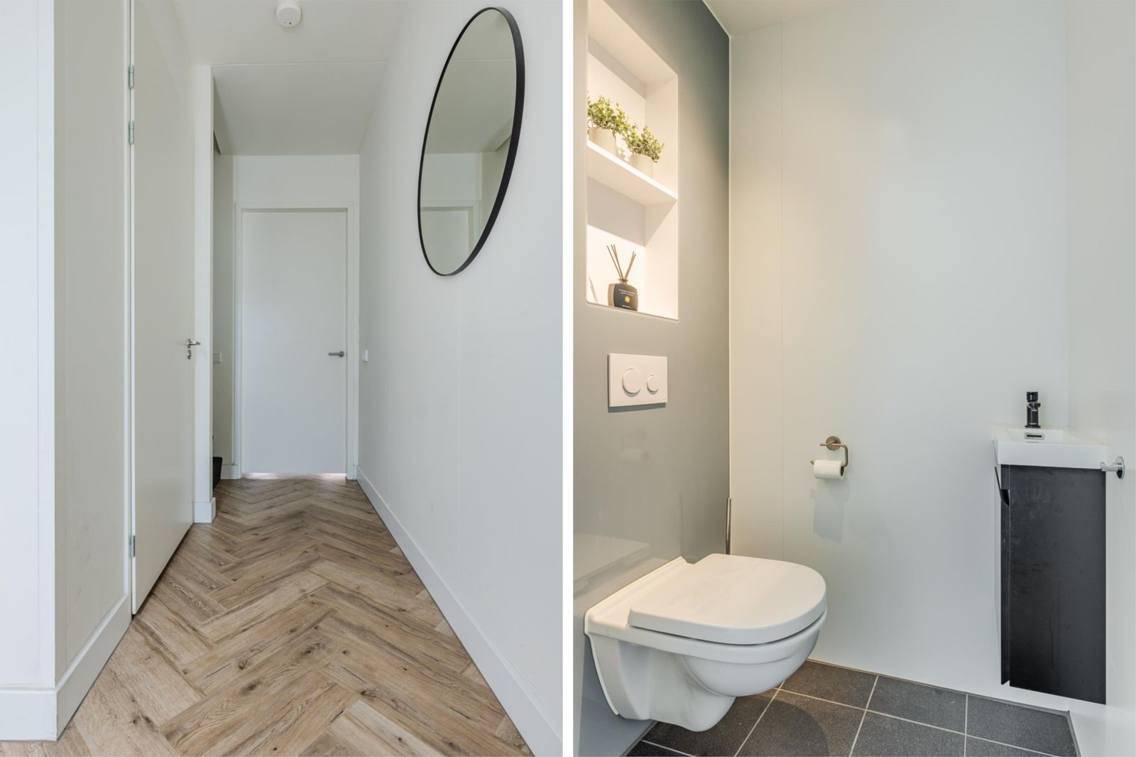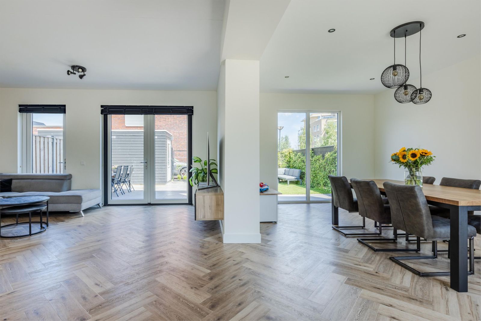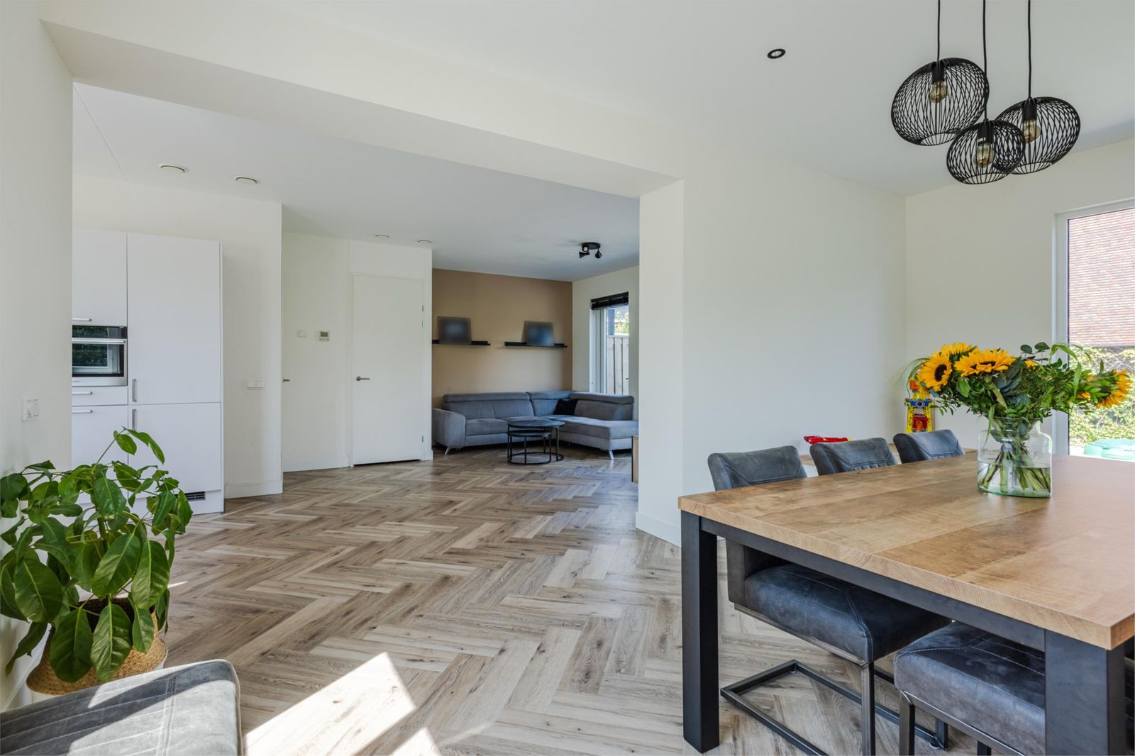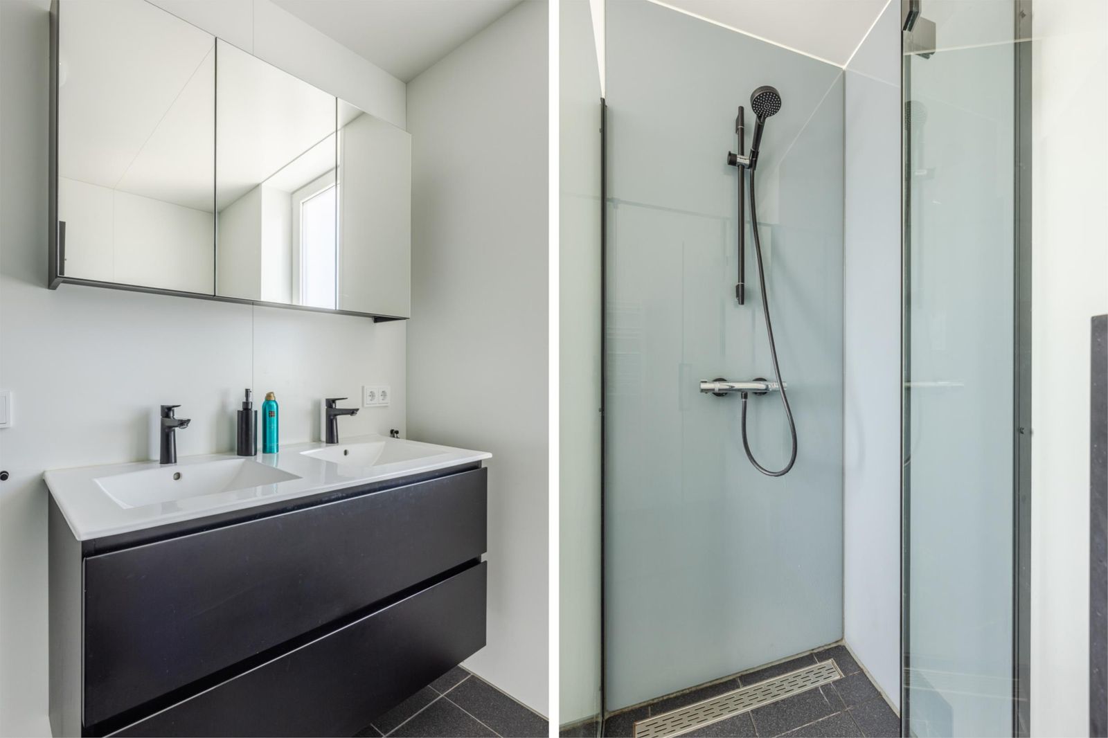 Aan de voorzijde vind je de strakke, witte keuken voorzien van alle gemakken en inbouwapparatuur, waaronder een inductiekookplaat, combi ovenmagnetron, koelkast, vriezer en vaatwasser. Door de hoge raampartijen is de woning bijzonder licht.