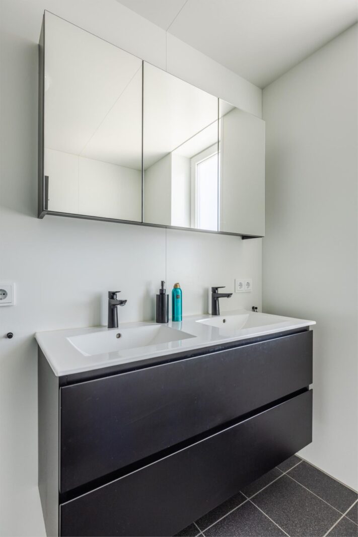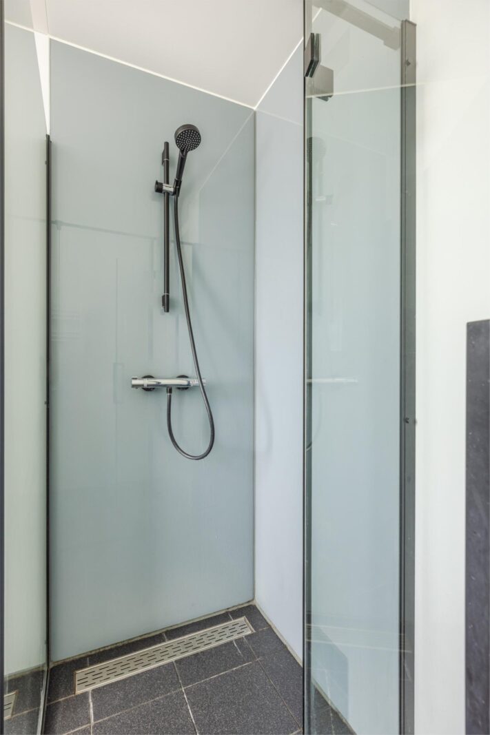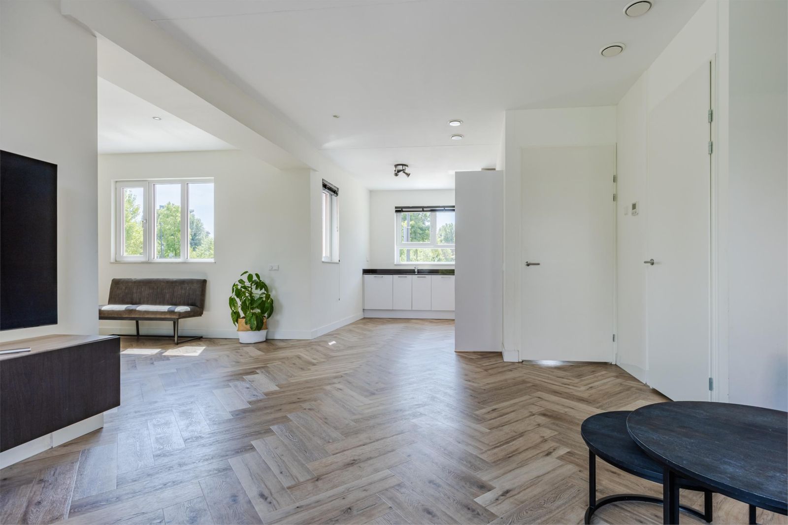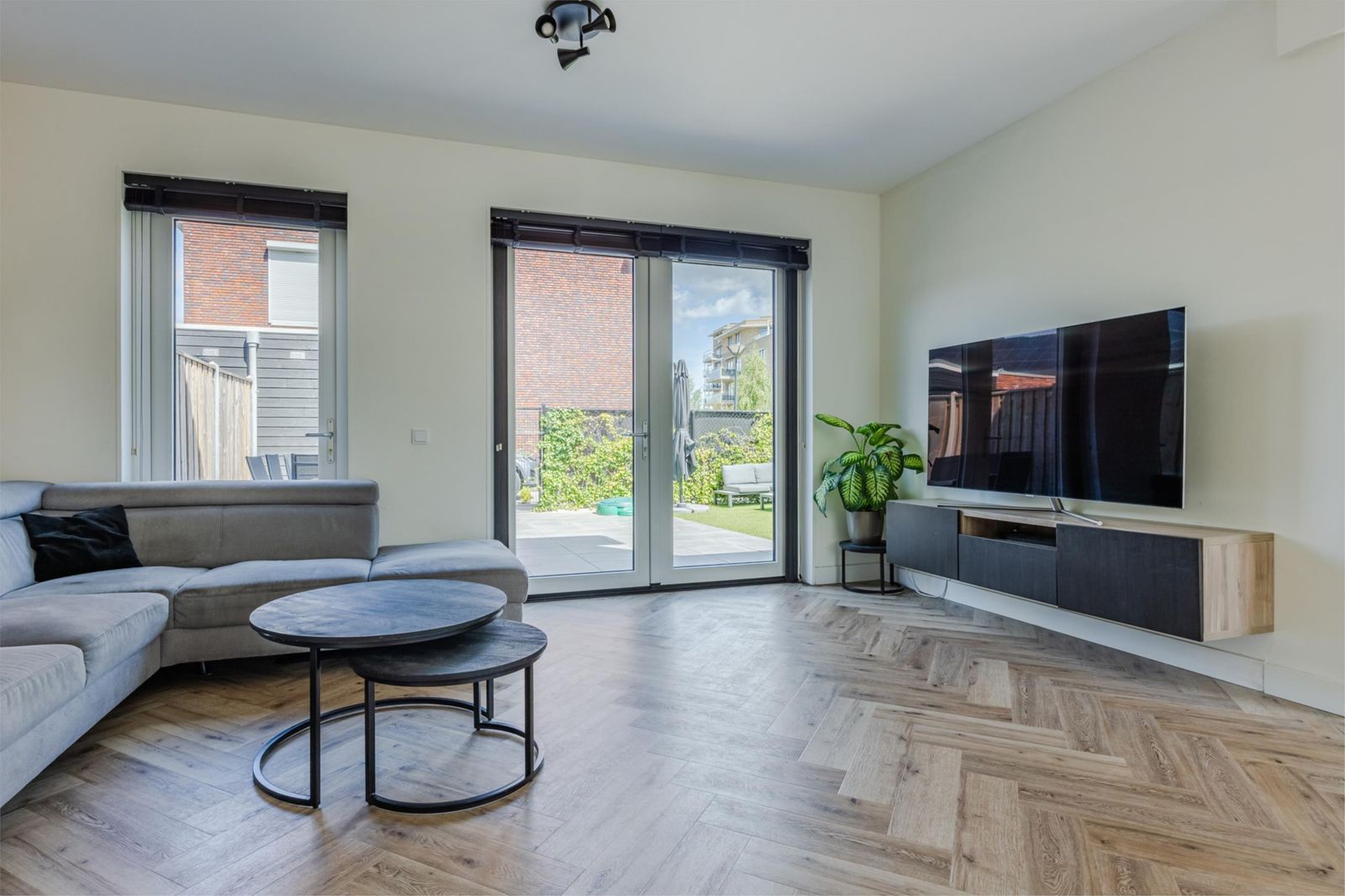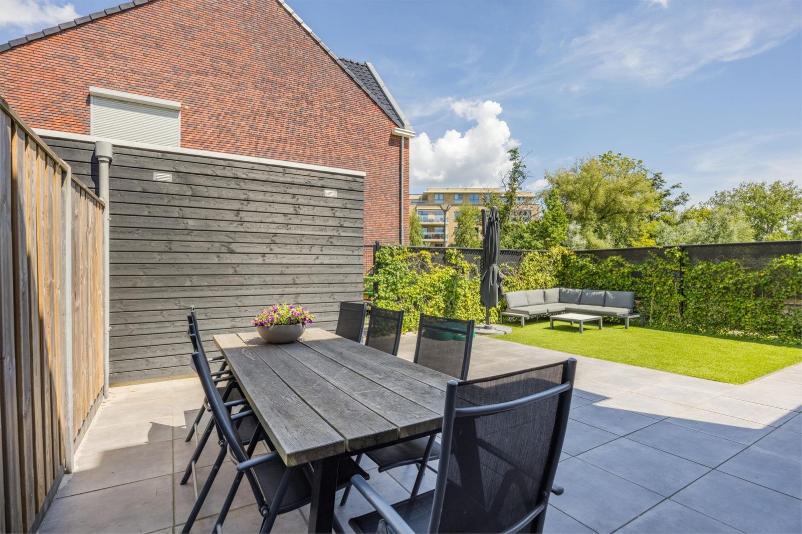 Aan de voorzijde vind je de strakke, witte keuken voorzien van alle gemakken en inbouwapparatuur, waaronder een inductiekookplaat, combi ovenmagnetron, koelkast, vriezer en vaatwasser. Door de hoge raampartijen is de woning bijzonder licht.