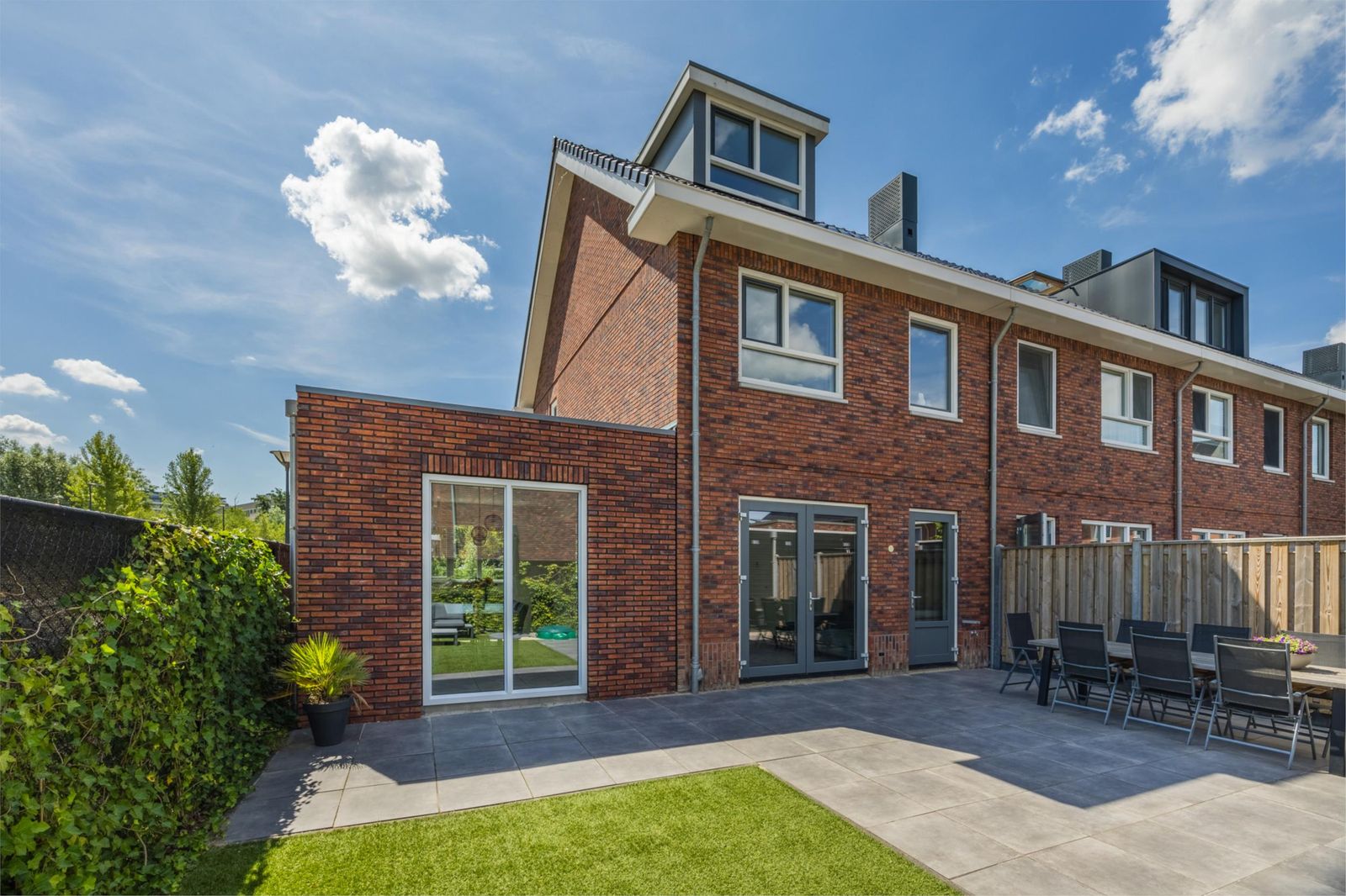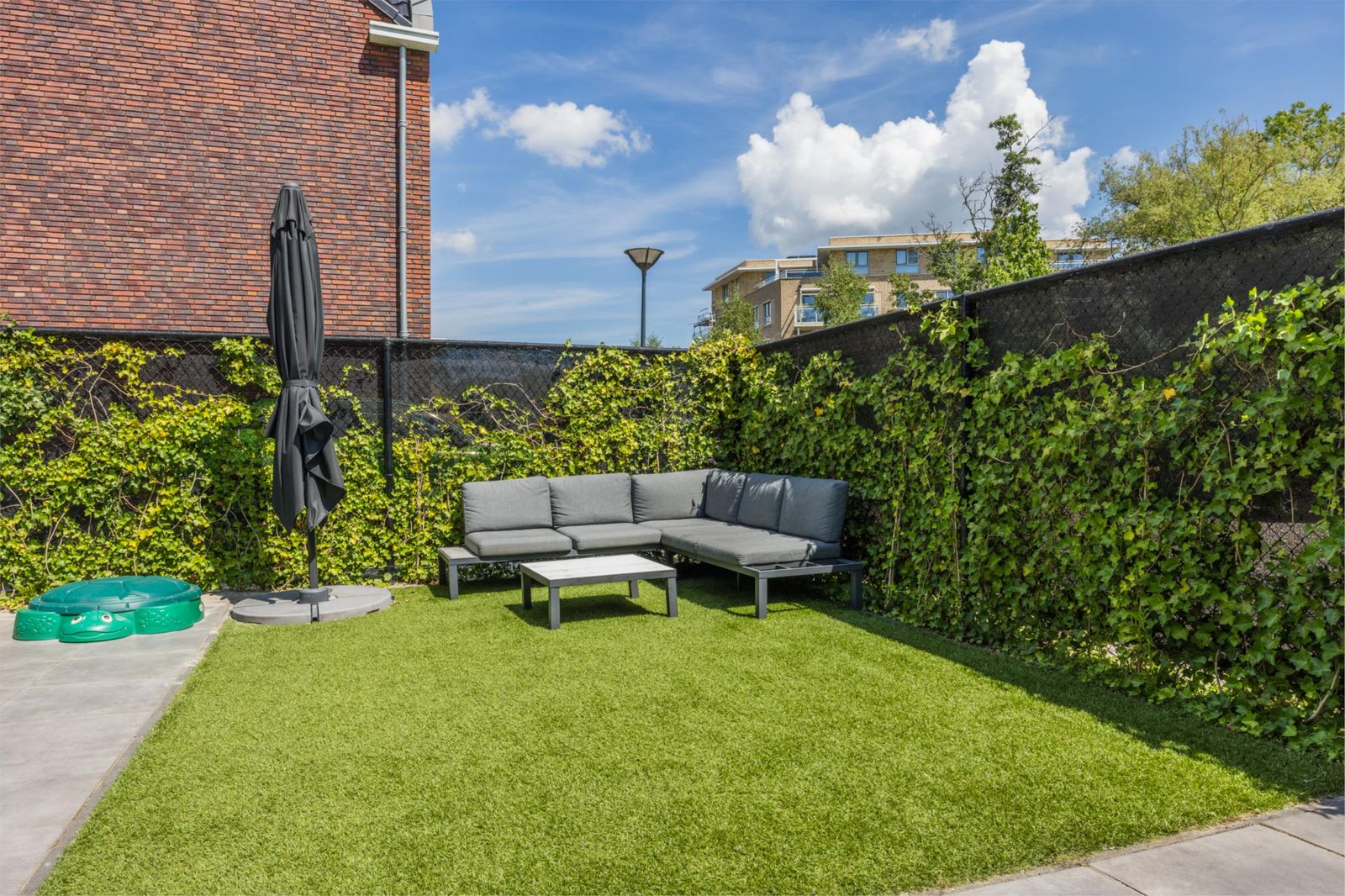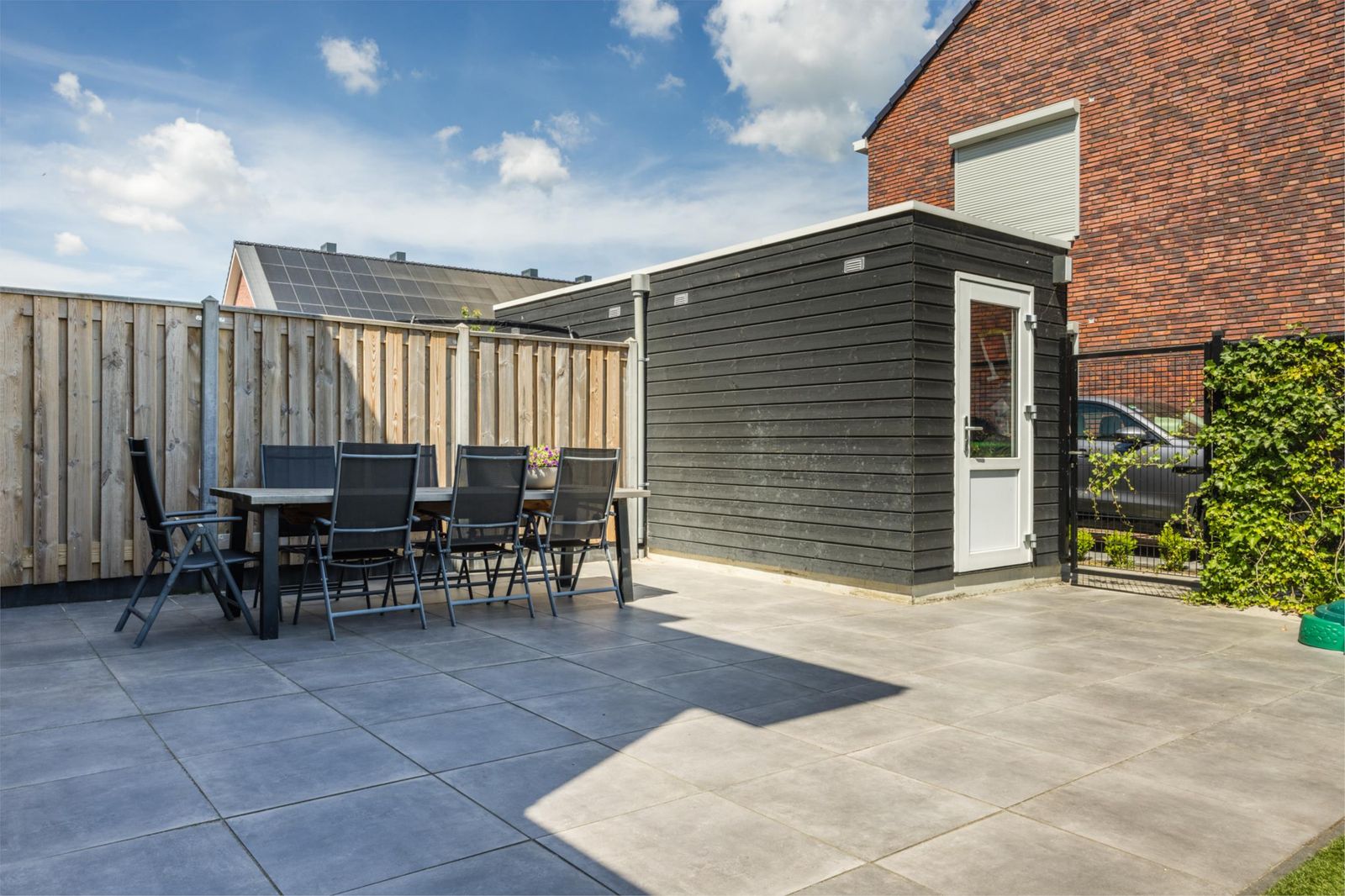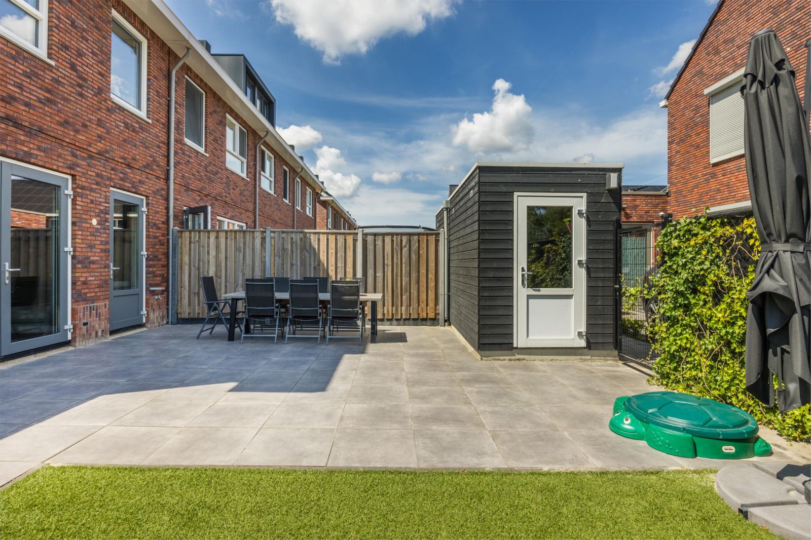 Via de grote openslaande deuren kom je in de zonnige achtertuin, gelegen op het noorden maar door breedte en diepte van het perceel is er altijd wel een plekje in de zon. Met een combinatie van betegeling, hoogwaardig kunstgras, een vrijstaande berging en achterom is het hier heerlijk genieten.
