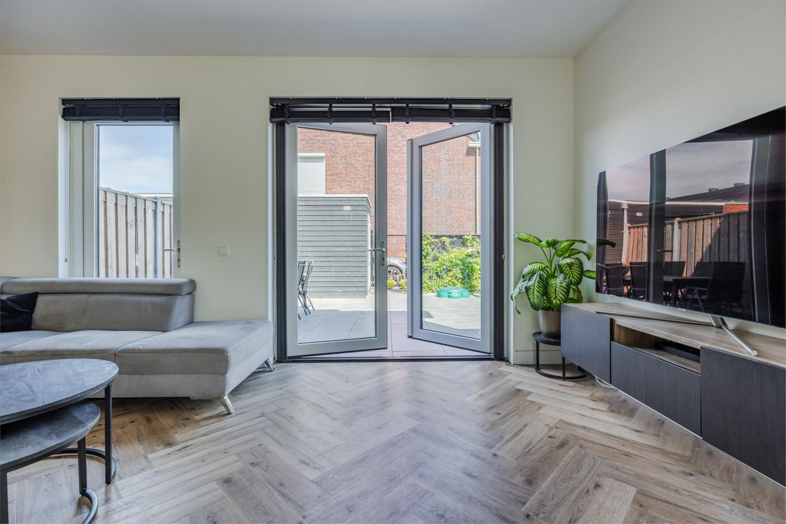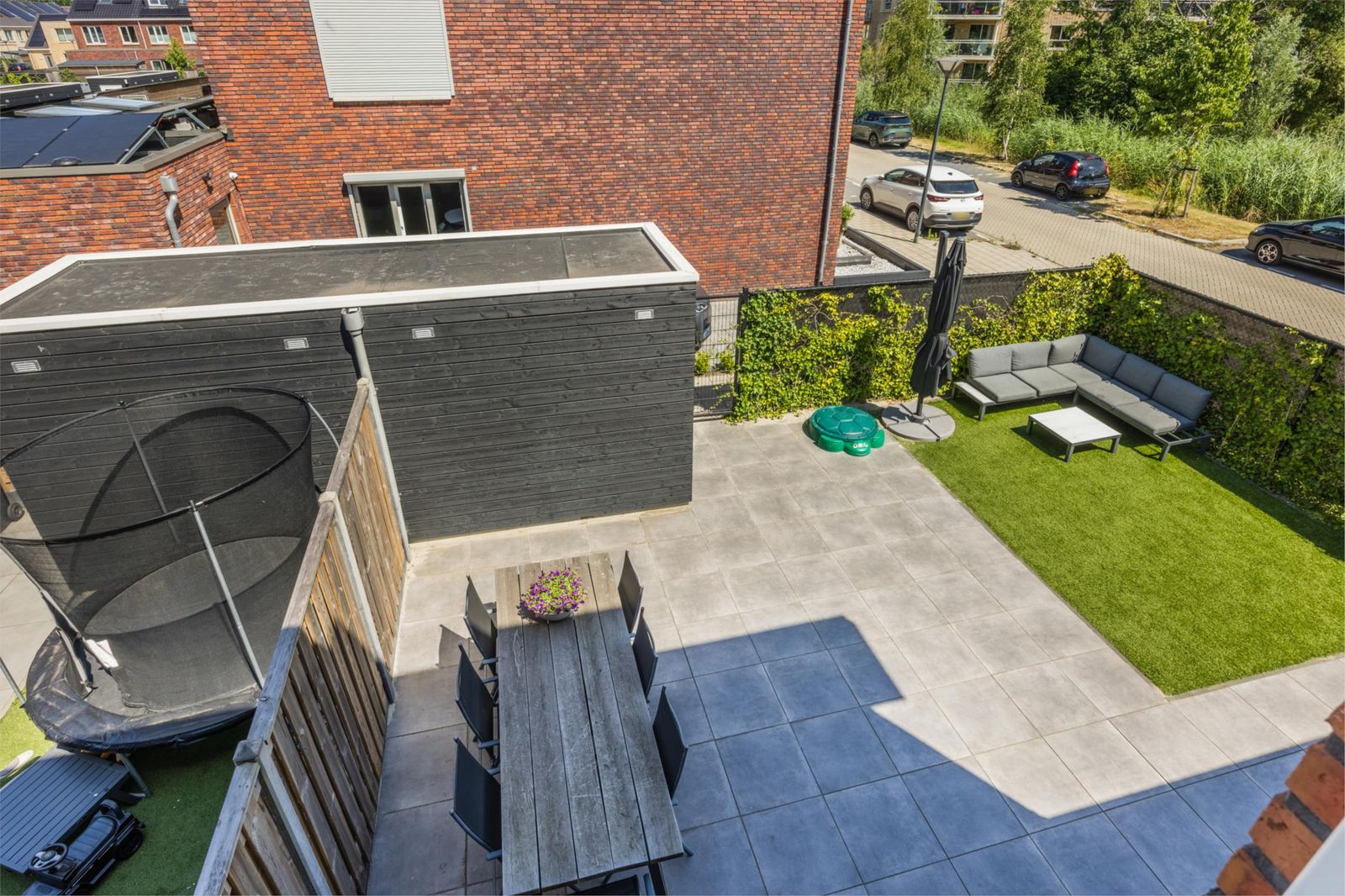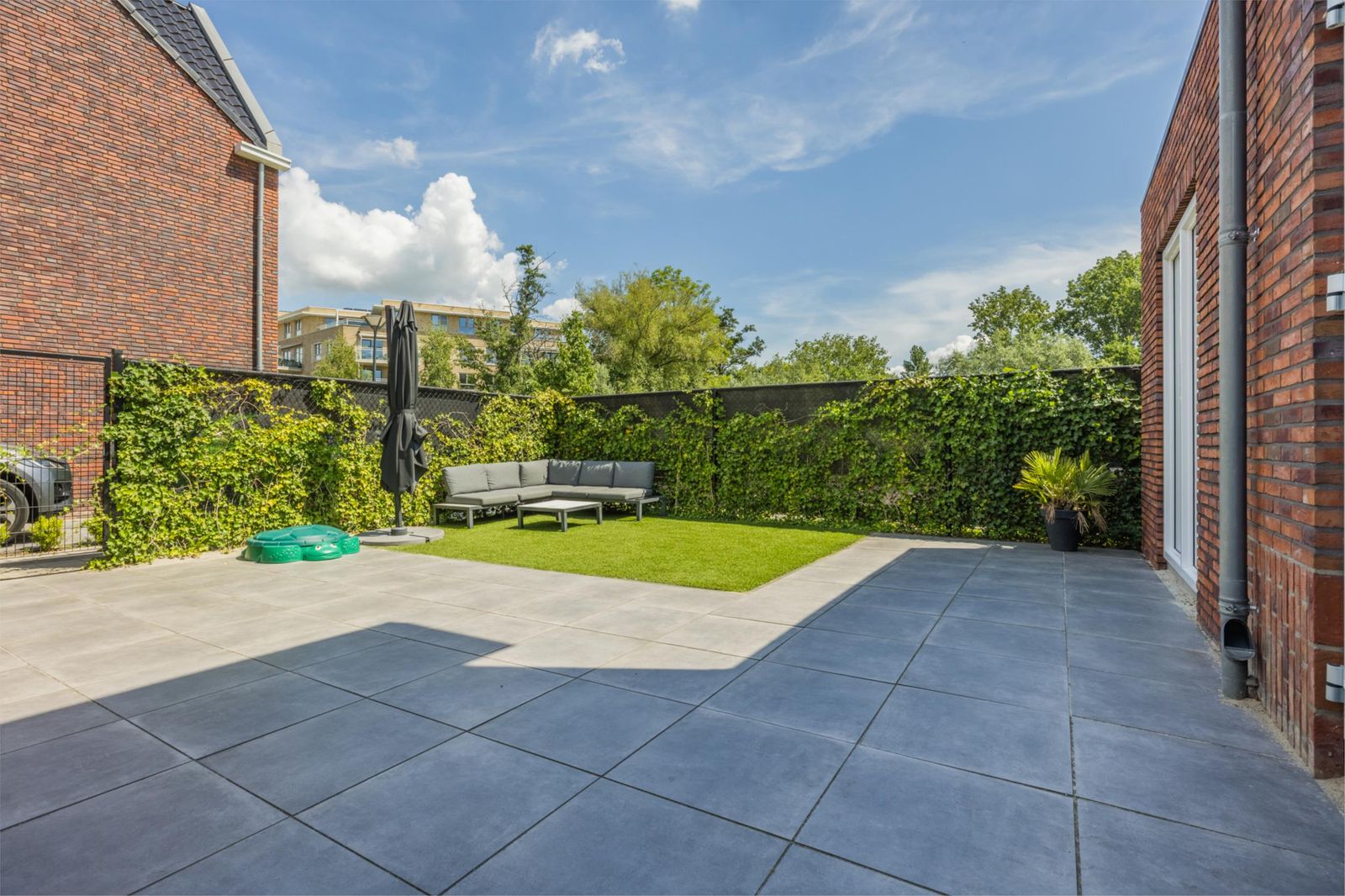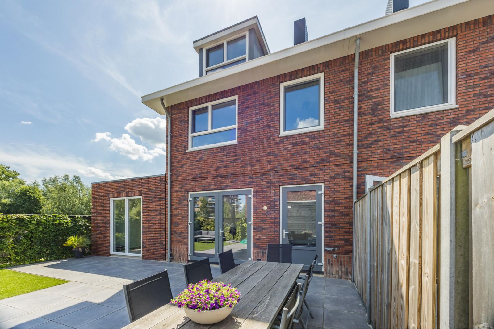Via de grote openslaande deuren kom je in de zonnige achtertuin, gelegen op het noorden maar door breedte en diepte van het perceel is er altijd wel een plekje in de zon. Met een combinatie van betegeling, hoogwaardig kunstgras, een vrijstaande berging en achterom is het hier heerlijk genieten.