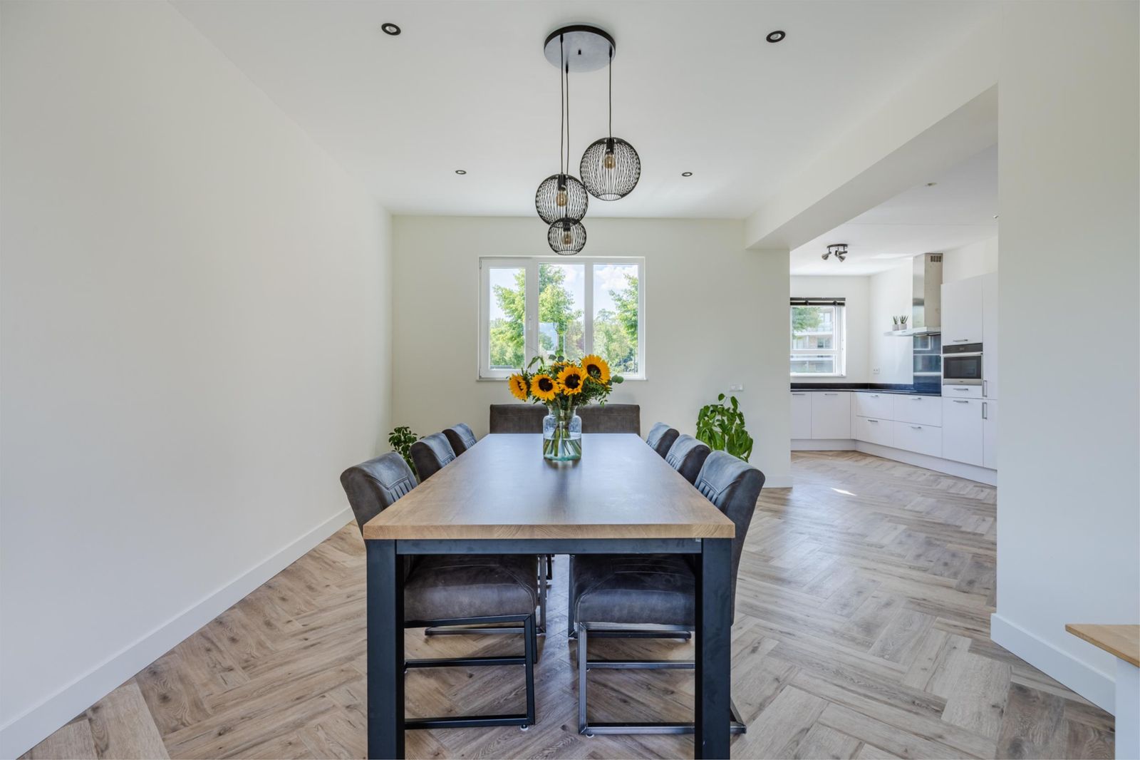 Bij binnenkomst tref je een ruime hal met meterkast, separaat modern toilet en de betonnen geluidloze trapopgang. Door de uitbouw van ruim 21m2 stap je vanuit de hal in een verassend ruime woonkamer met een plafond hoogte van maar liefst 274cm. De woonkamer is voorzien van trapkast en openslaande deuren naar de tuin. De uitbouw verdeelt de woonkamer in twee delen, waardoor er ook een groot eetgedeelte is ontstaan.