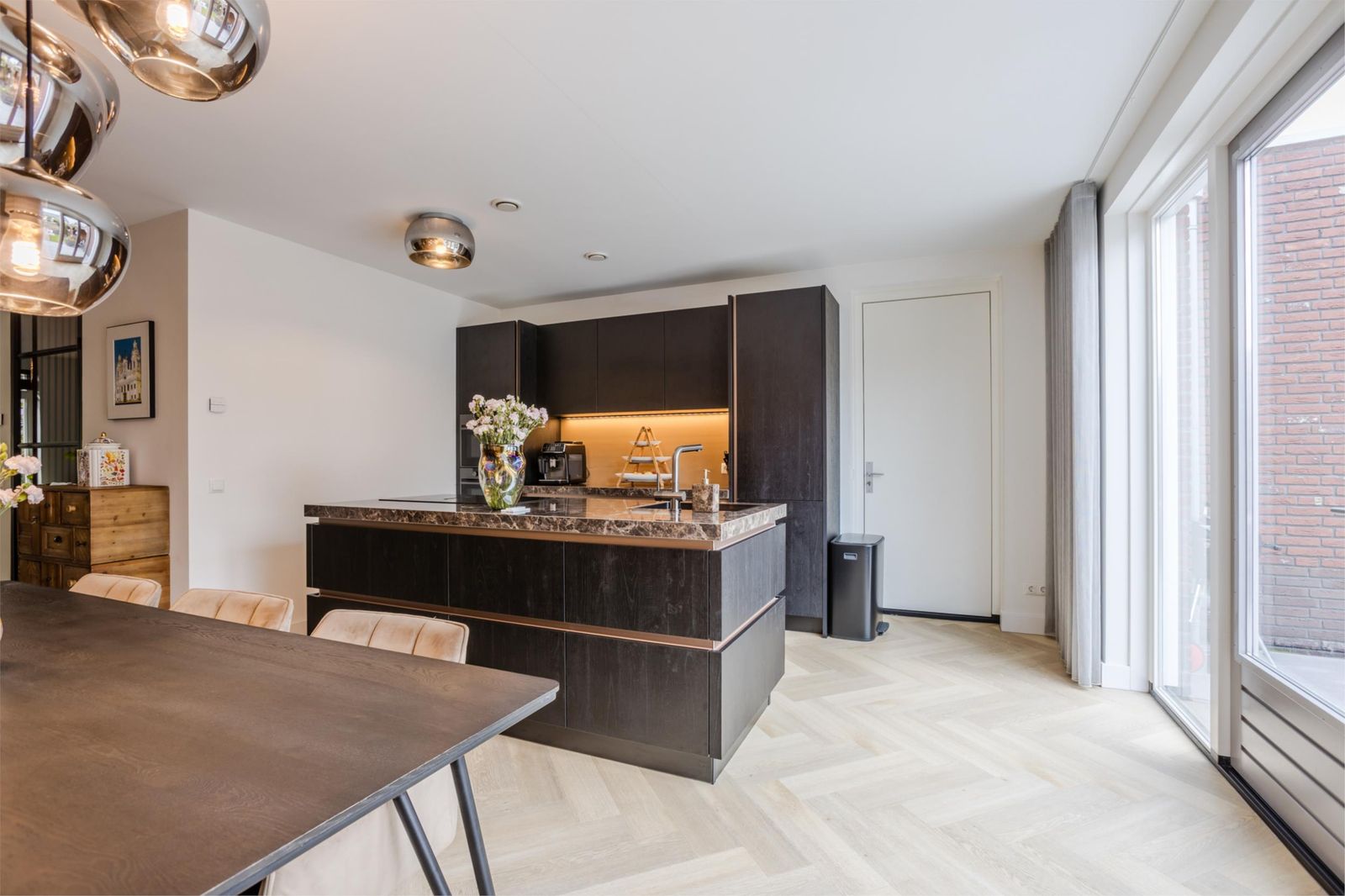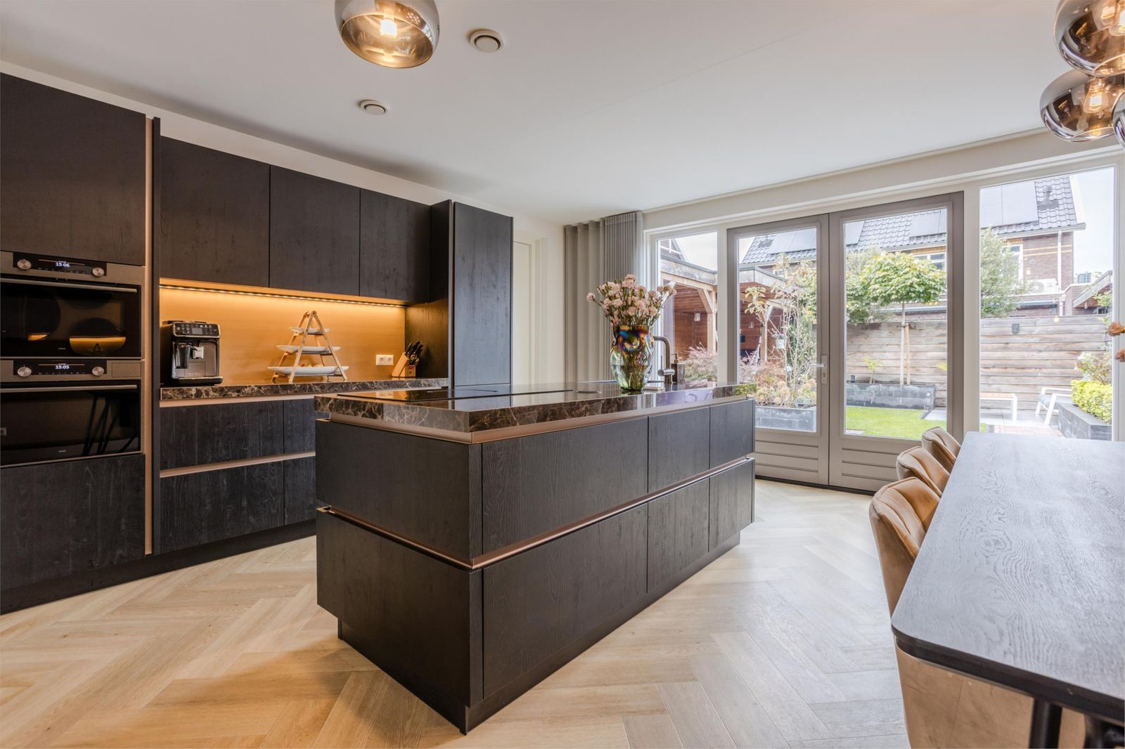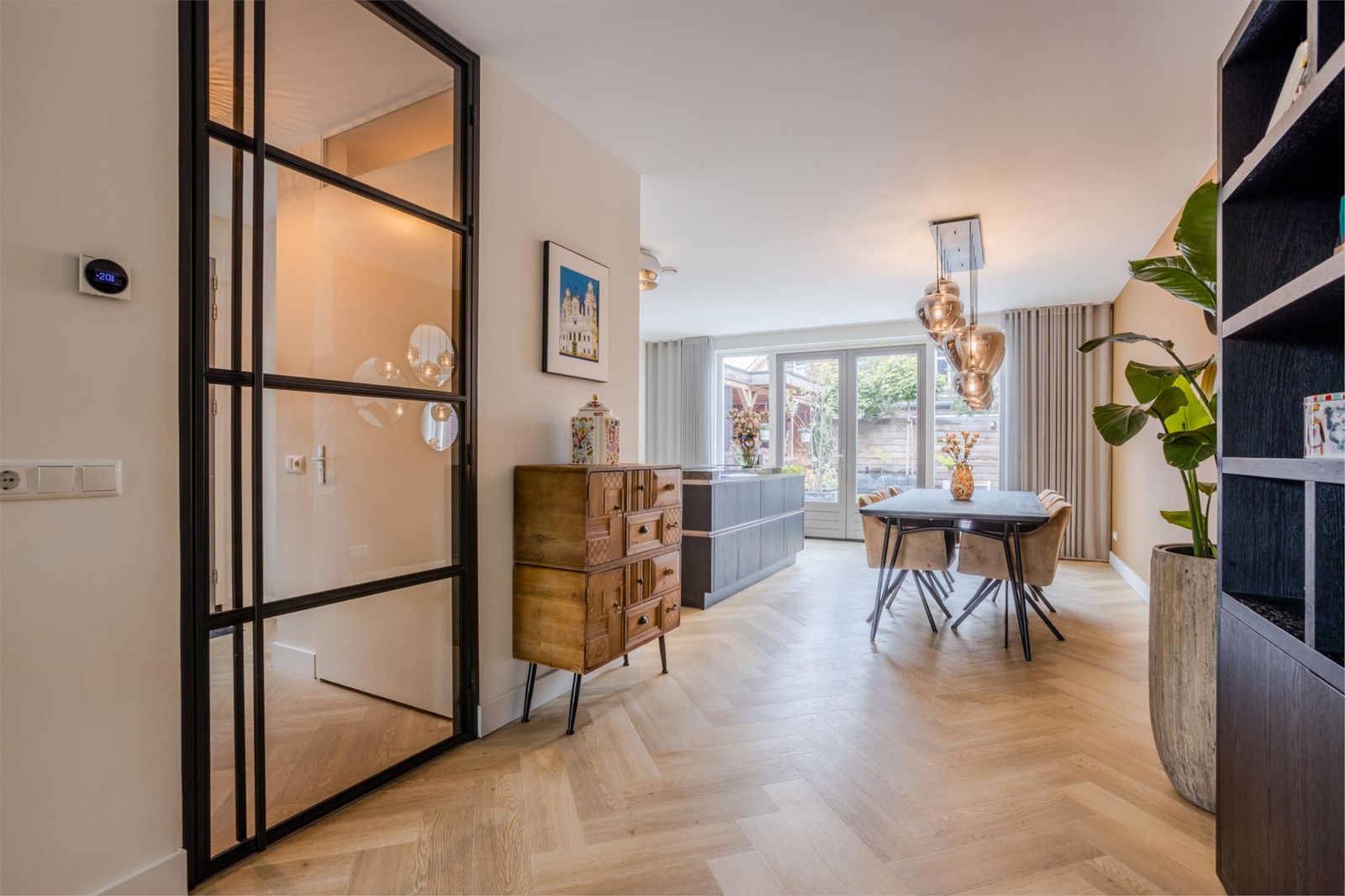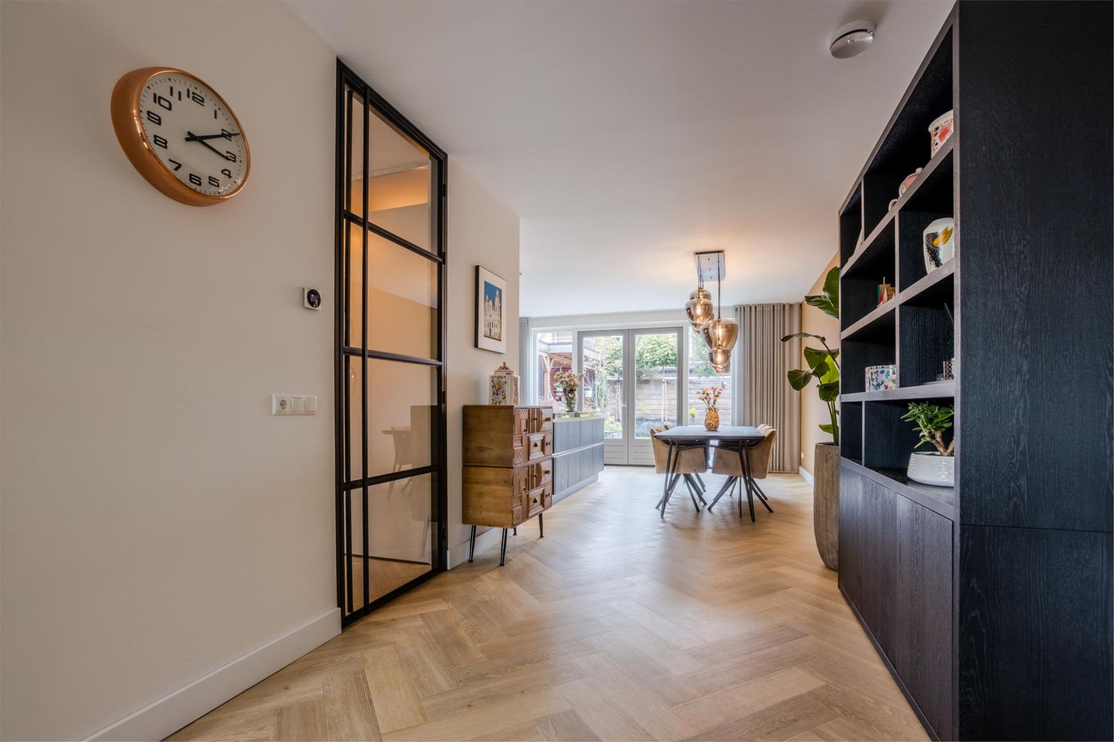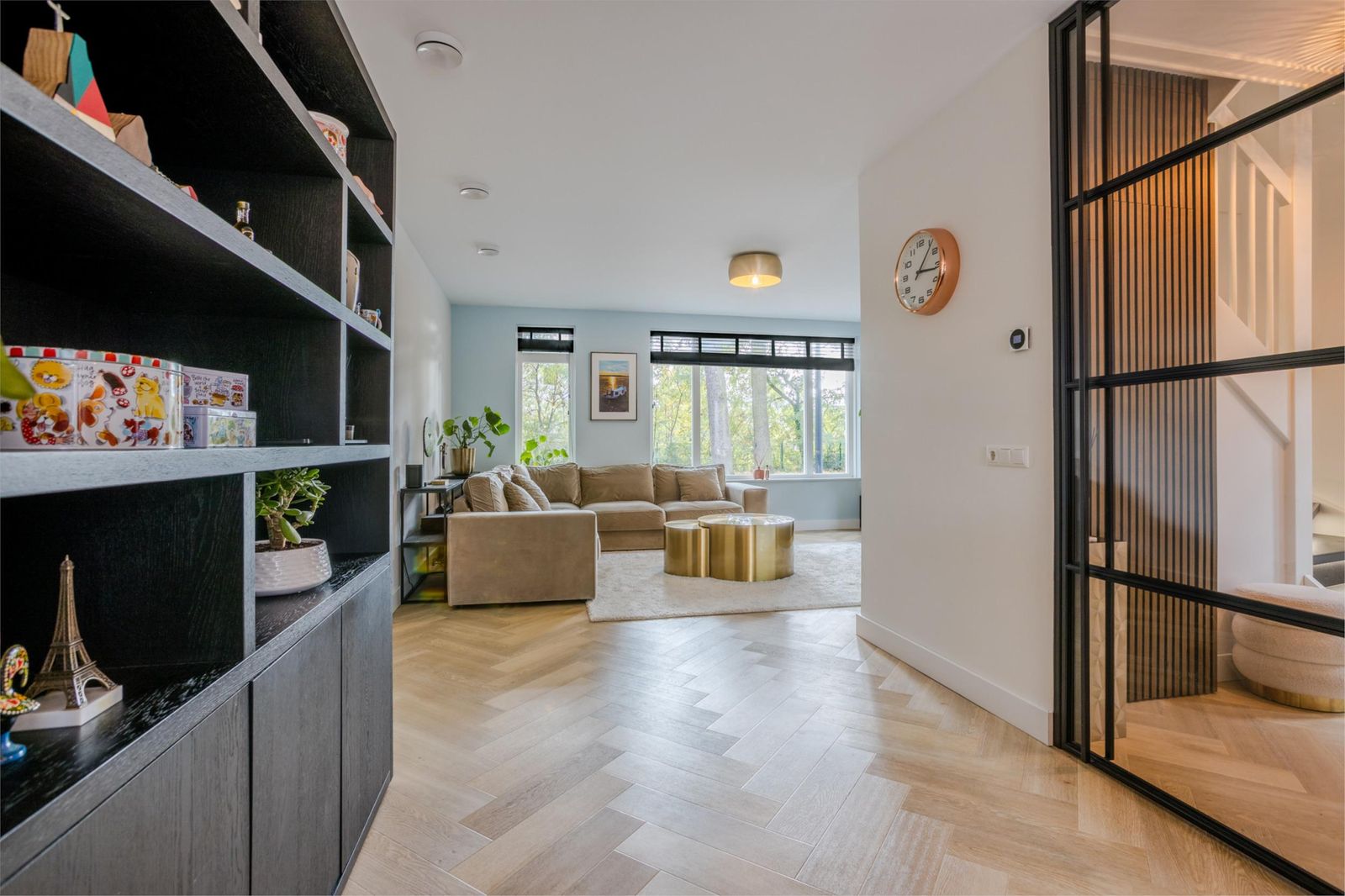 Bij binnenkomst valt meteen de ruime hal op met verlichte trap, maatwerk garderobe en luxe toilet. Via een kamerhoge zwartstalen deur kom je in de lichte woon- en eetkamer met moderne open keuken.