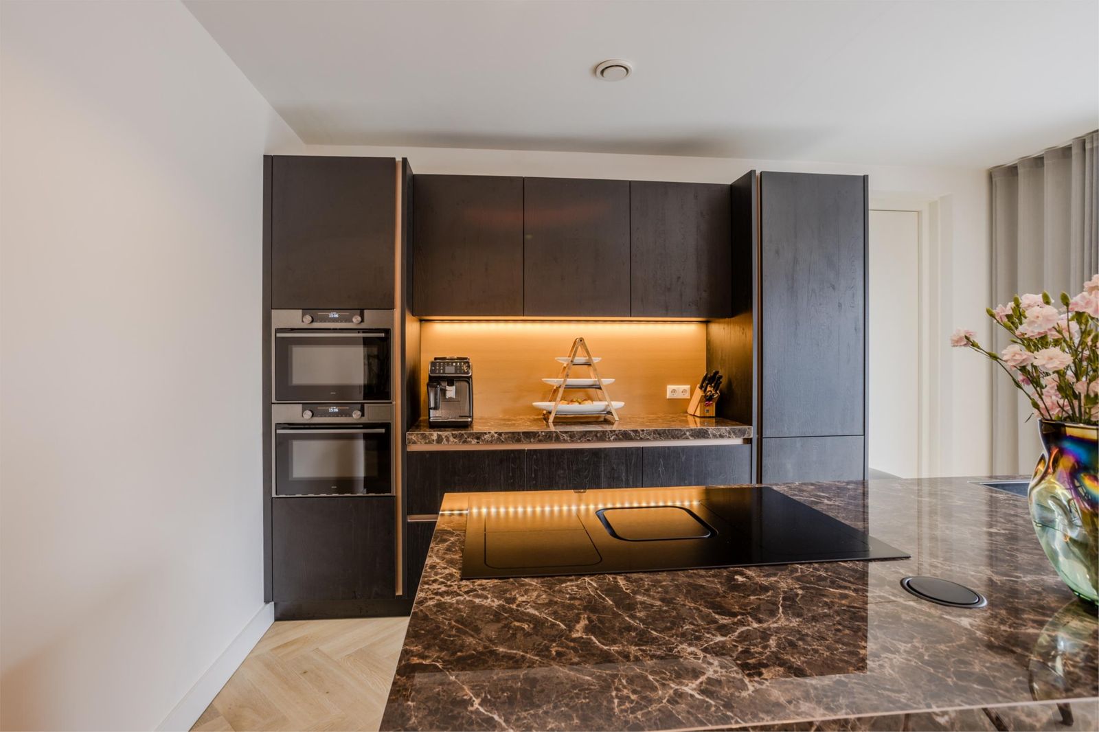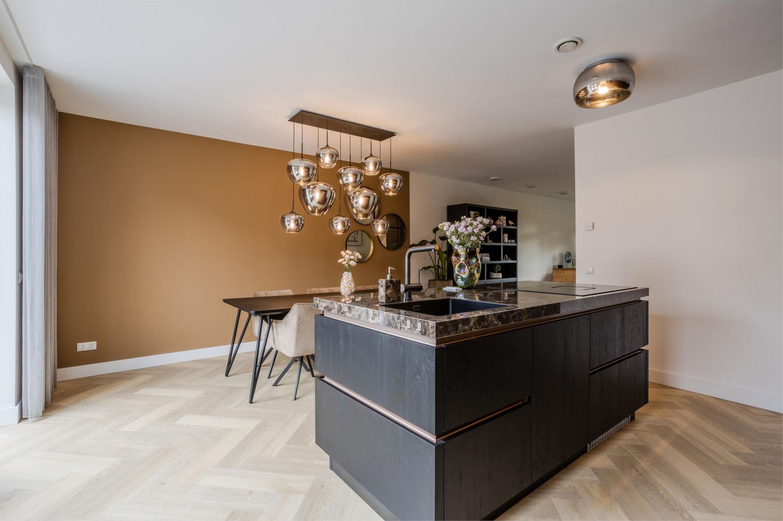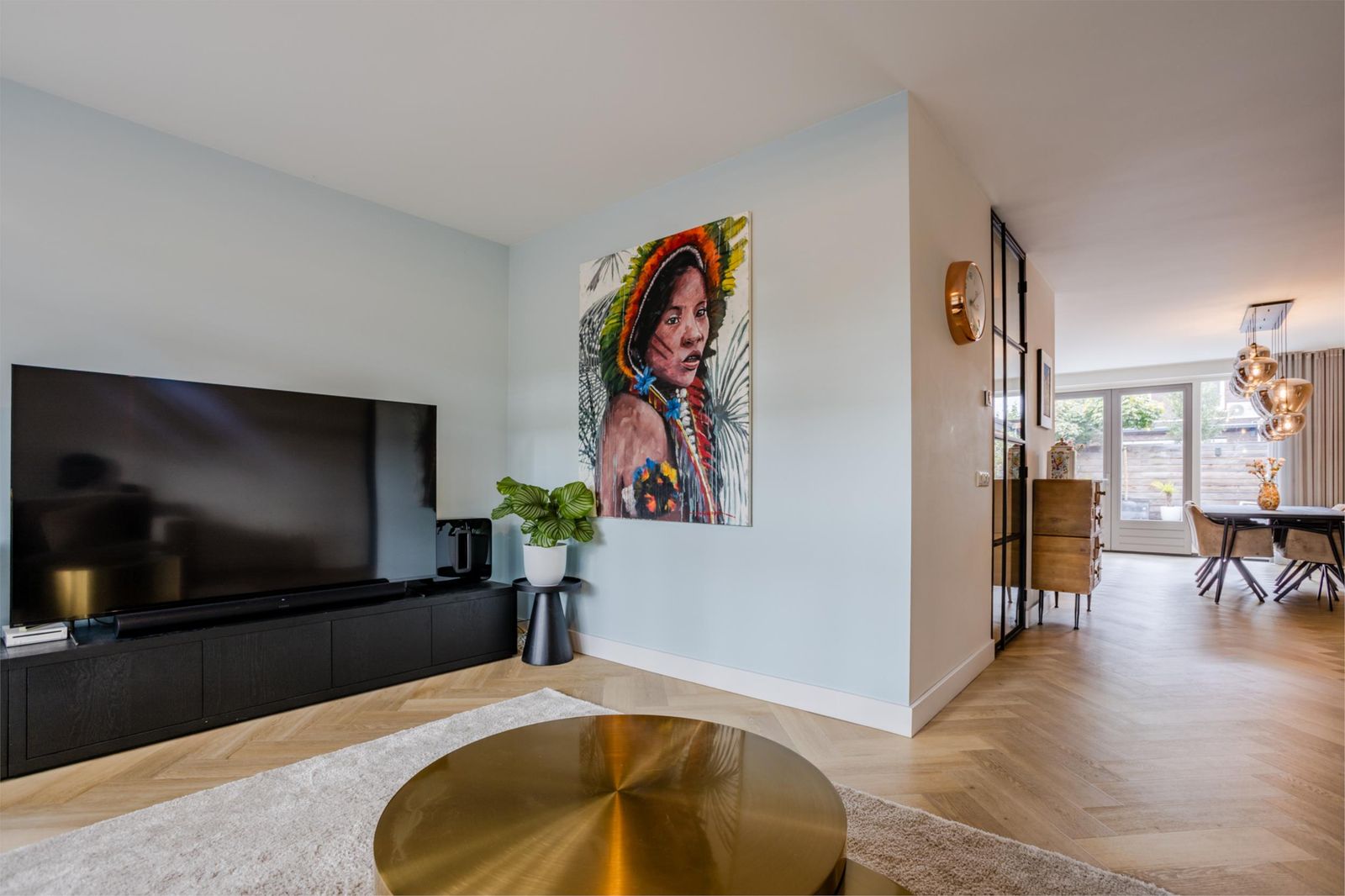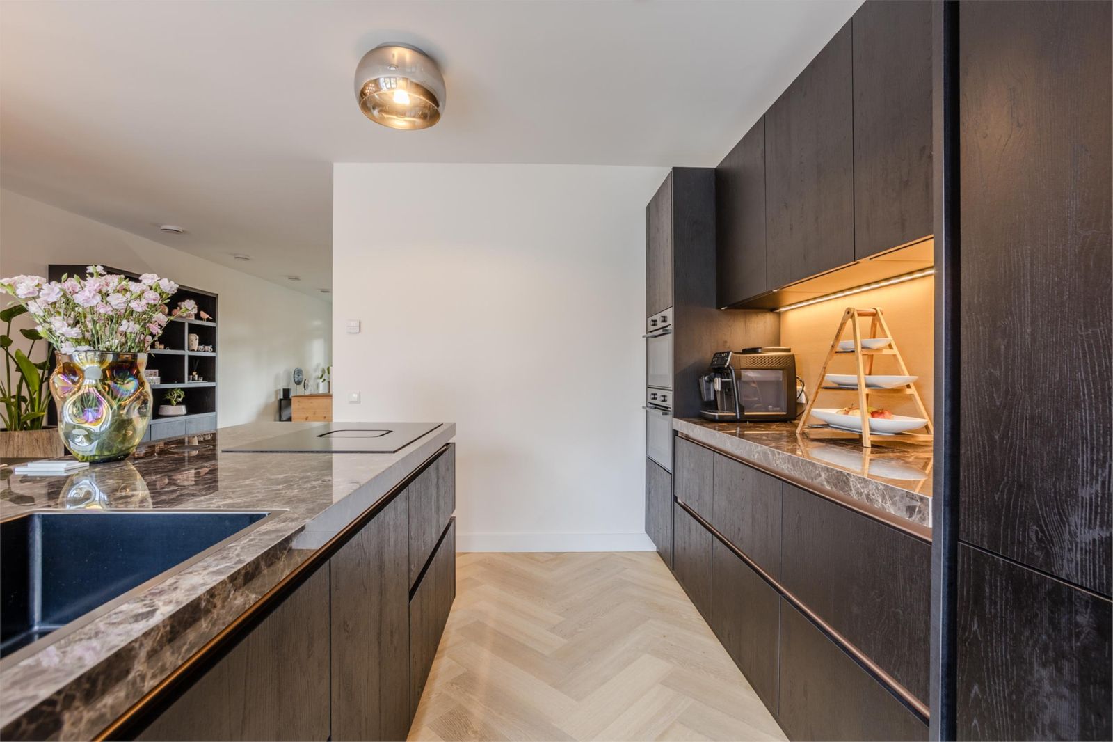 Bij binnenkomst valt meteen de ruime hal op met verlichte trap, maatwerk garderobe en luxe toilet. Via een kamerhoge zwartstalen deur kom je in de lichte woon- en eetkamer met moderne open keuken.