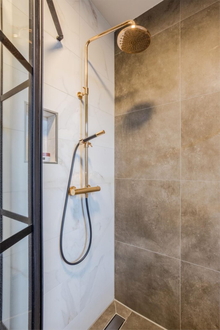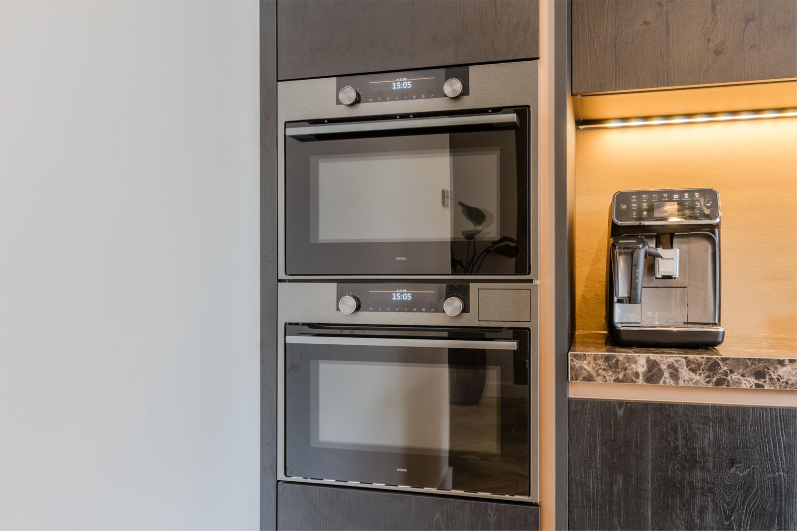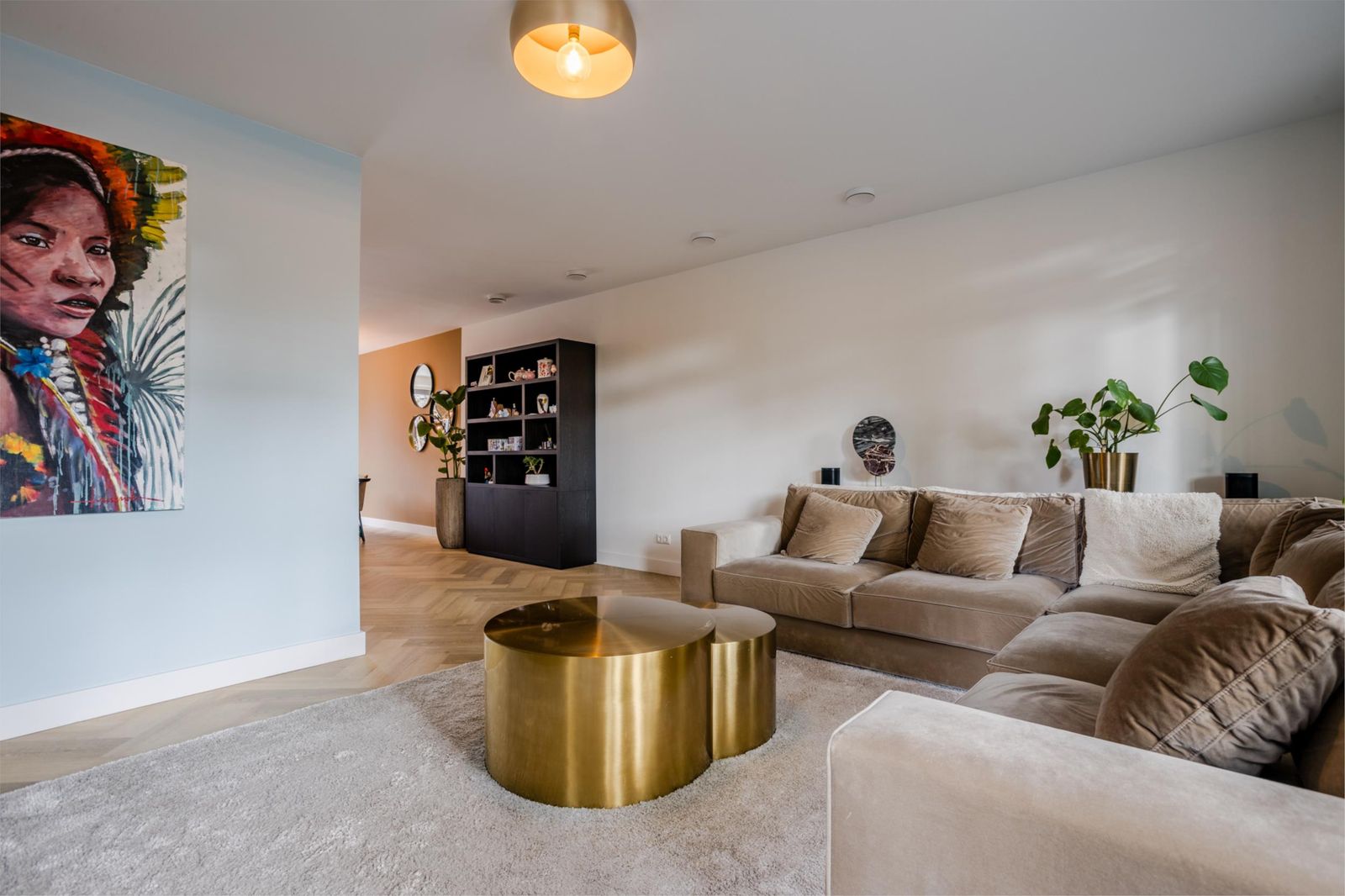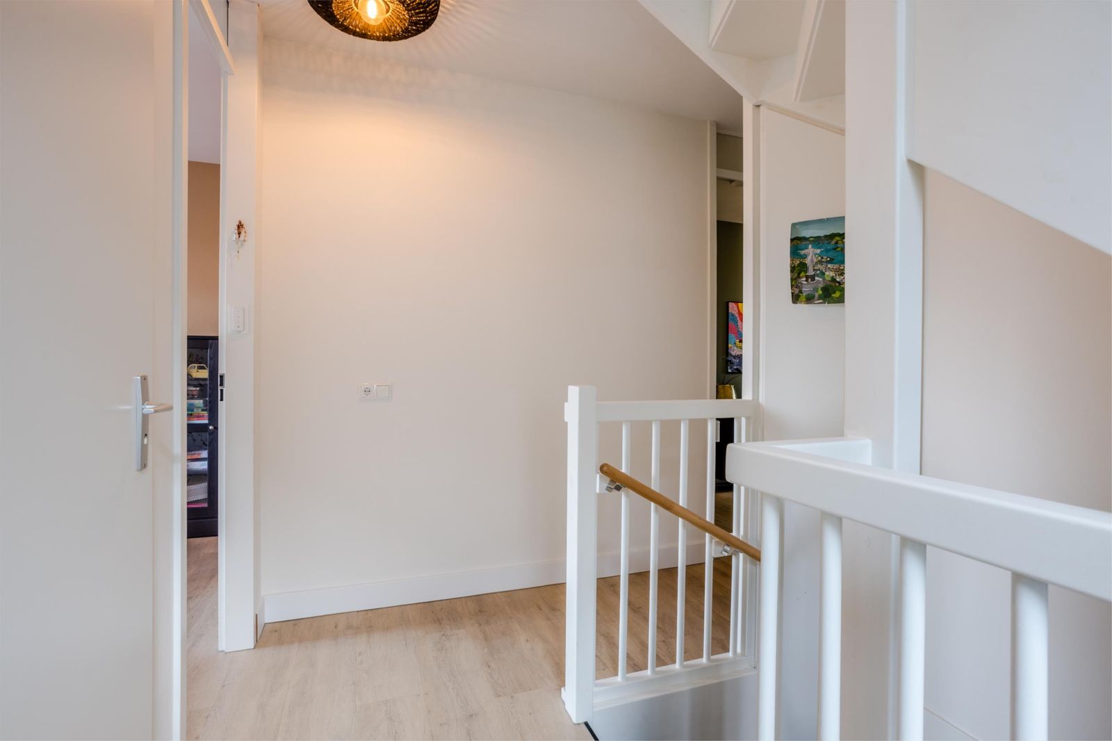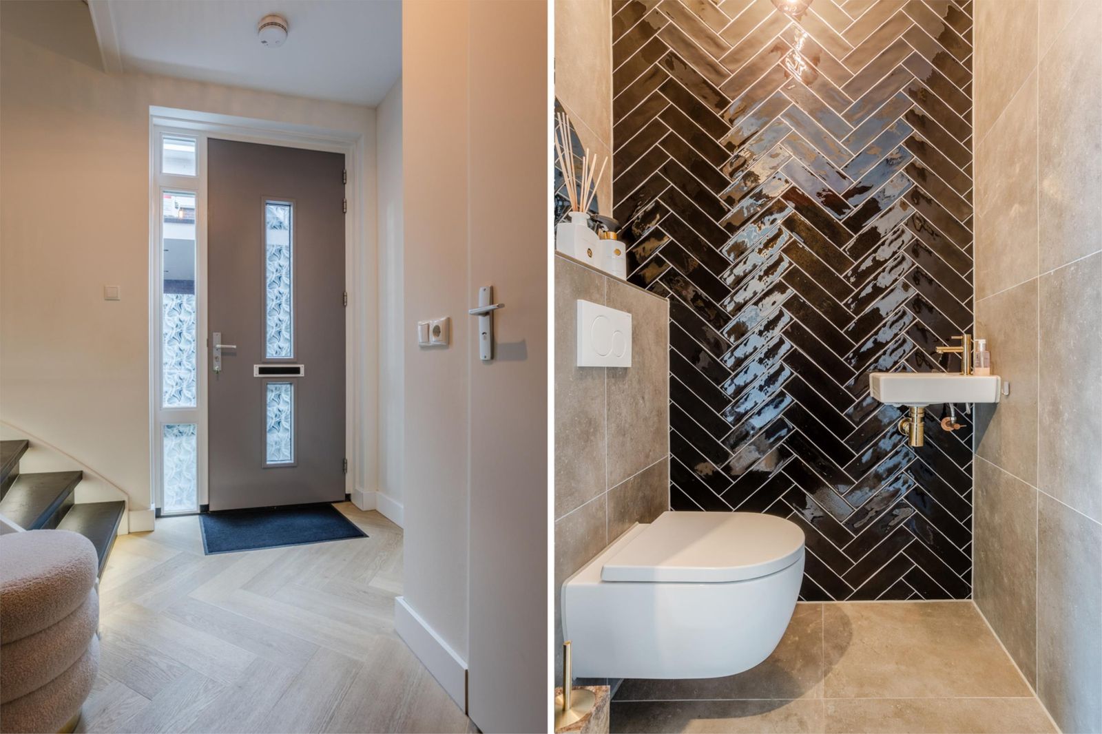 Bij binnenkomst valt meteen de ruime hal op met verlichte trap, maatwerk garderobe en luxe toilet. Via een kamerhoge zwartstalen deur kom je in de lichte woon- en eetkamer met moderne open keuken.