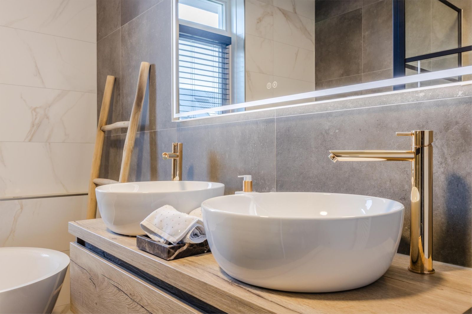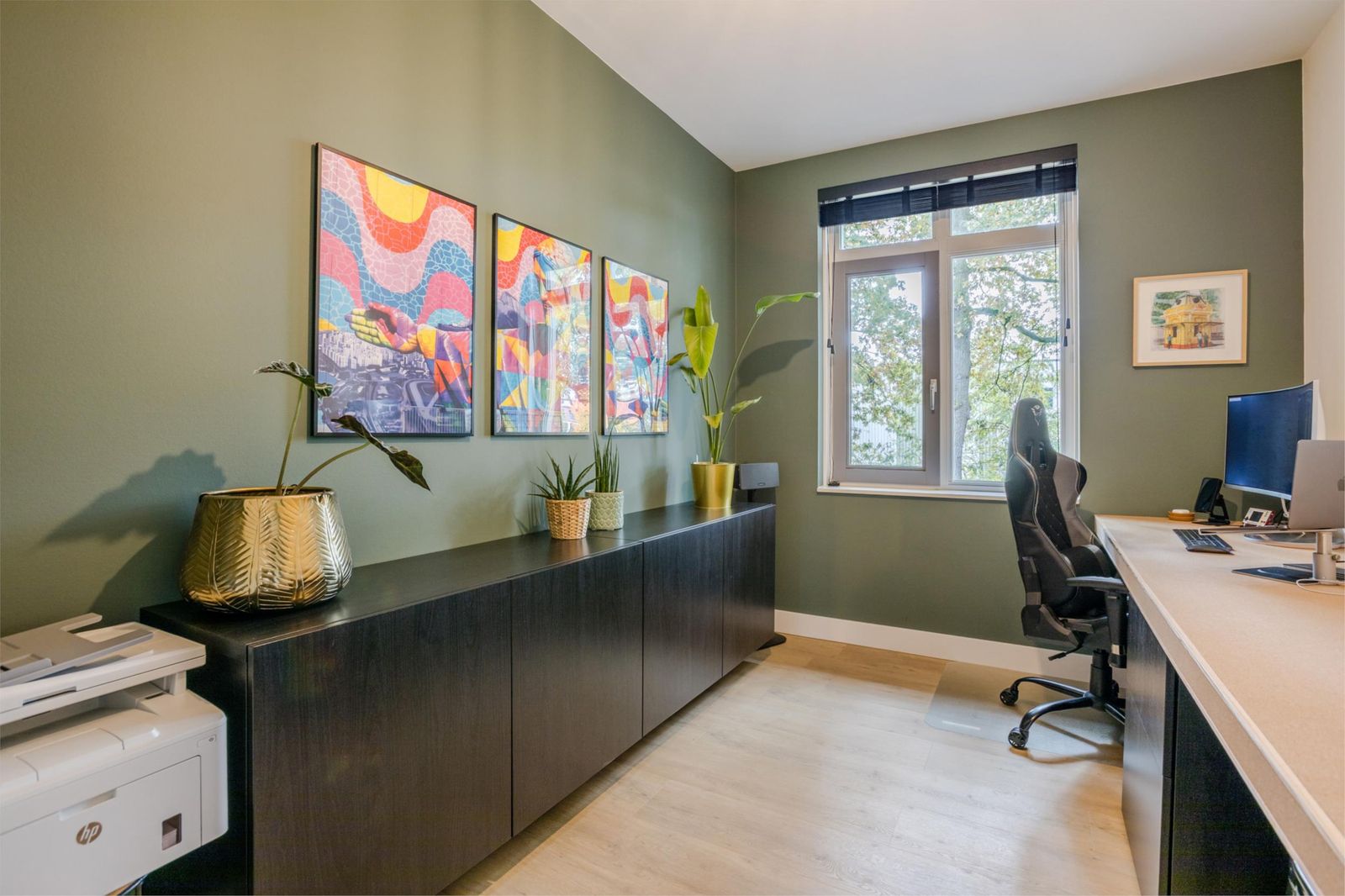 De eerste verdieping telt drie slaapkamers, waarvan één momenteel in gebruik is als thuiswerkplek. De luxe badkamer beschikt over een vrijstaand bad, dubbele wastafel en tweede toilet.