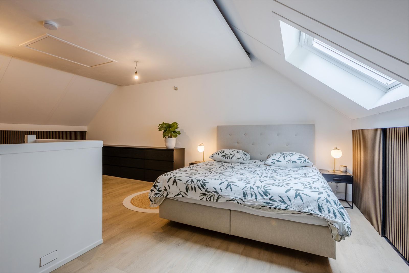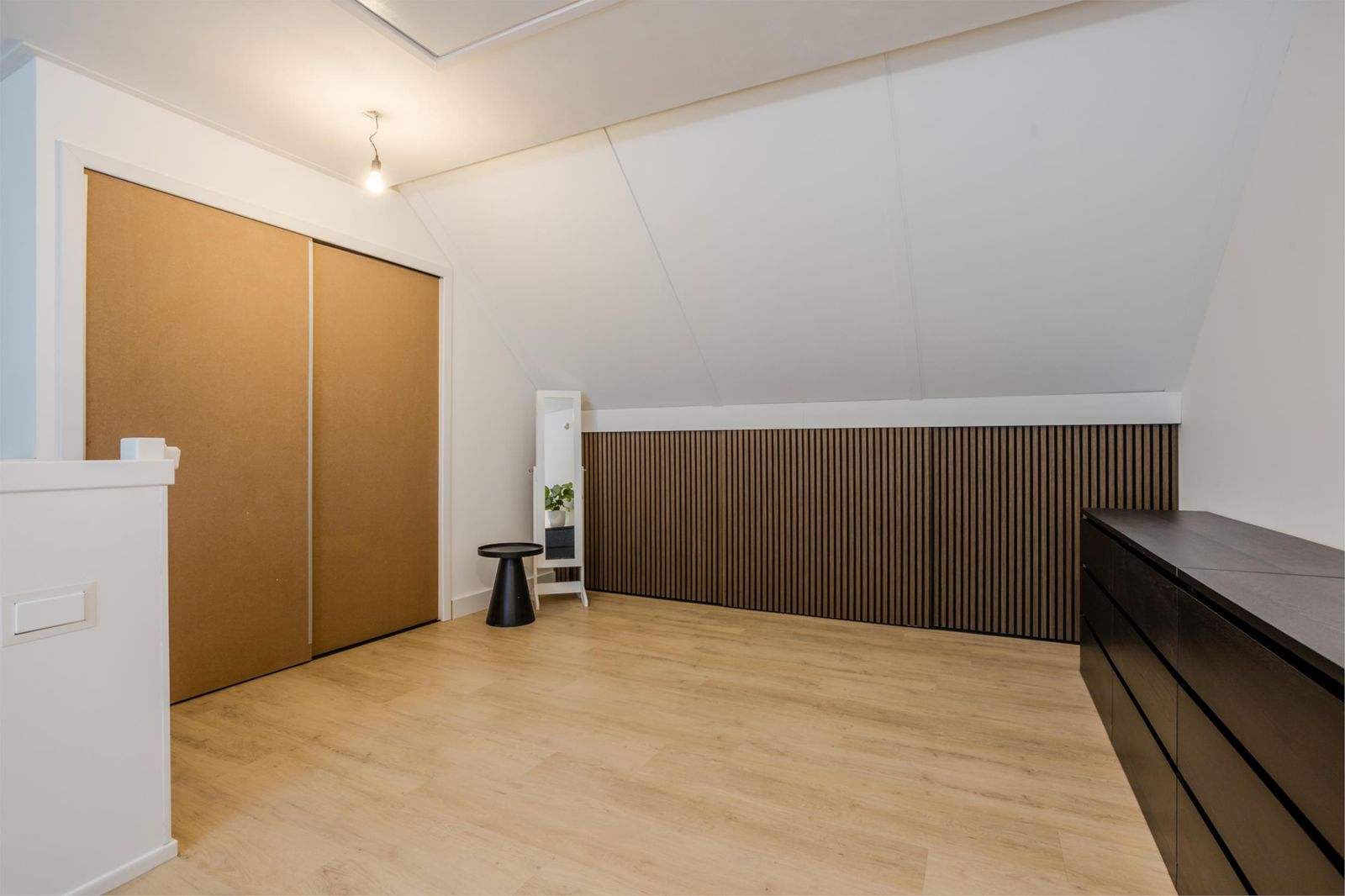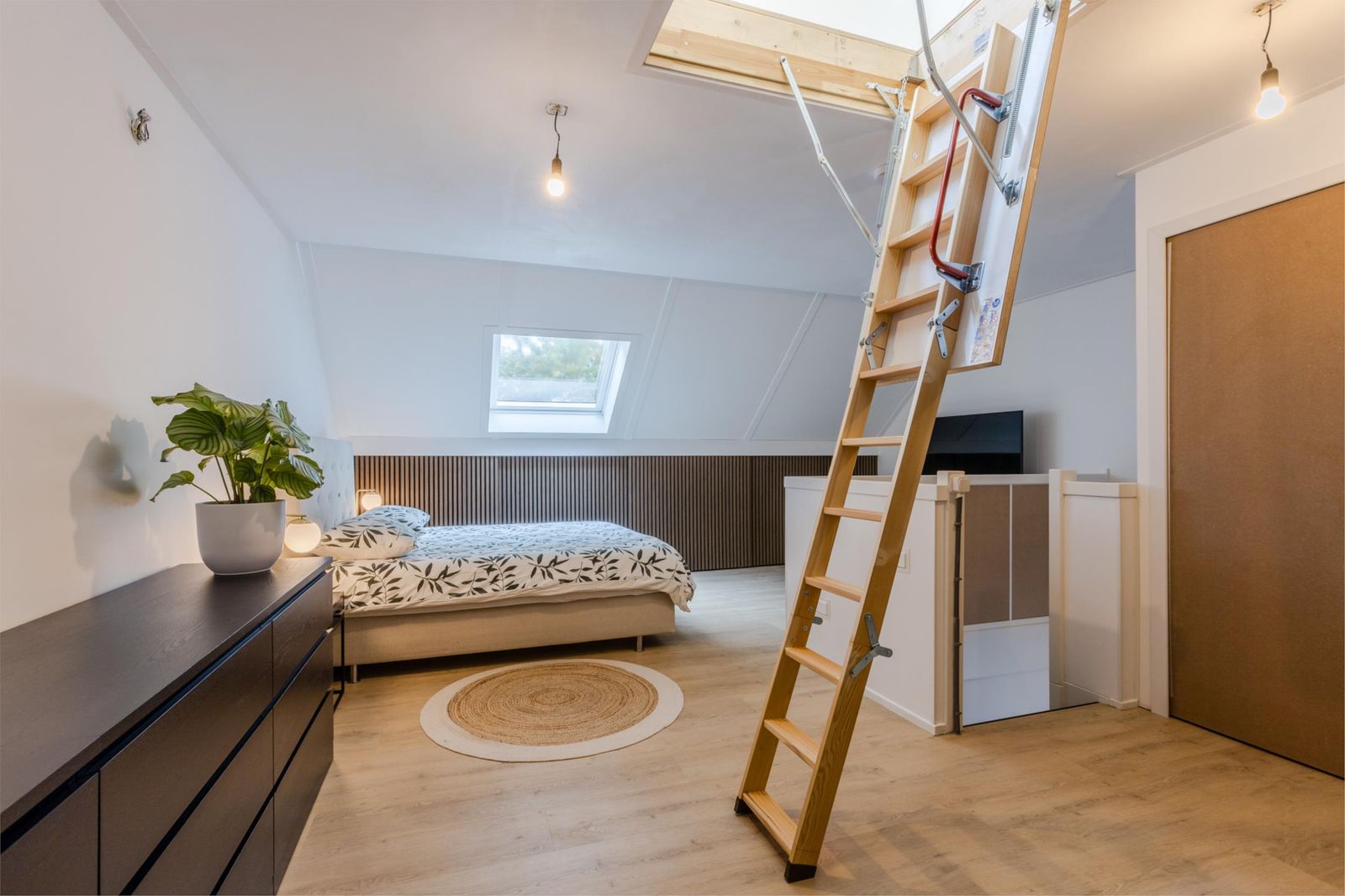 De zolderverdieping is ingericht als royale ouderslaapkamer met knieschotkasten, vliering en een nette, uit het zicht, technische ruimte met plek voor witgoed, omvormer, warmtepomp en wtw-unit.