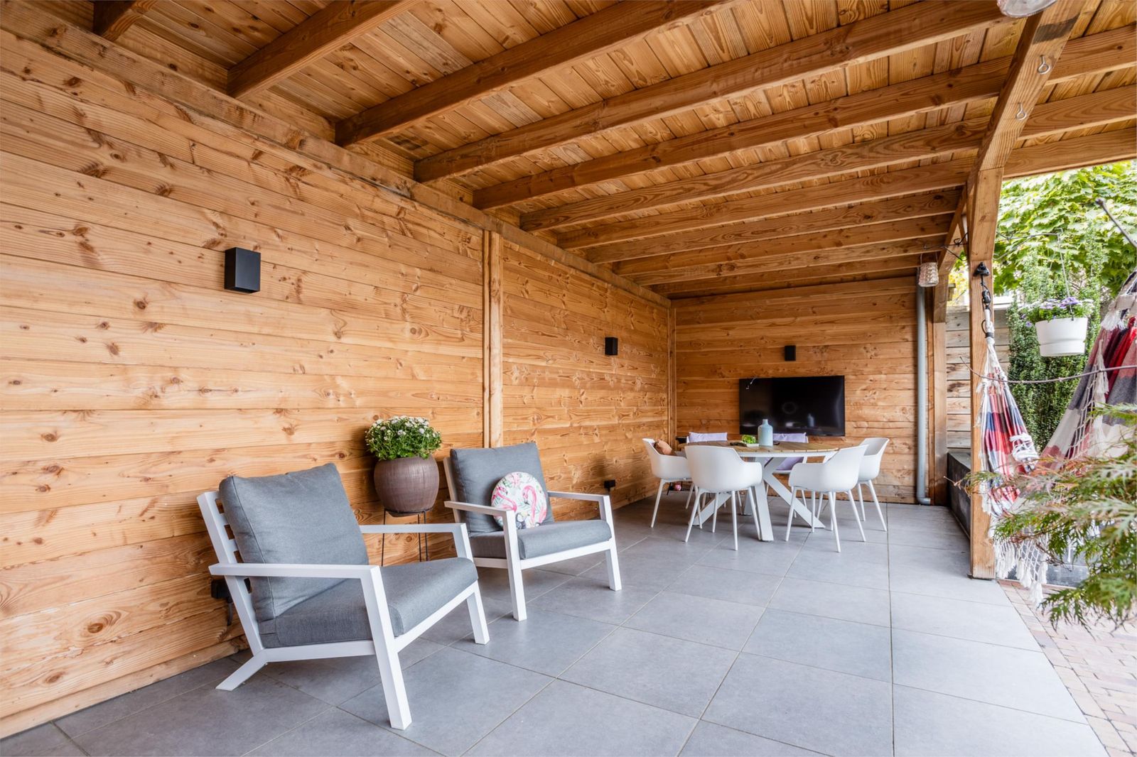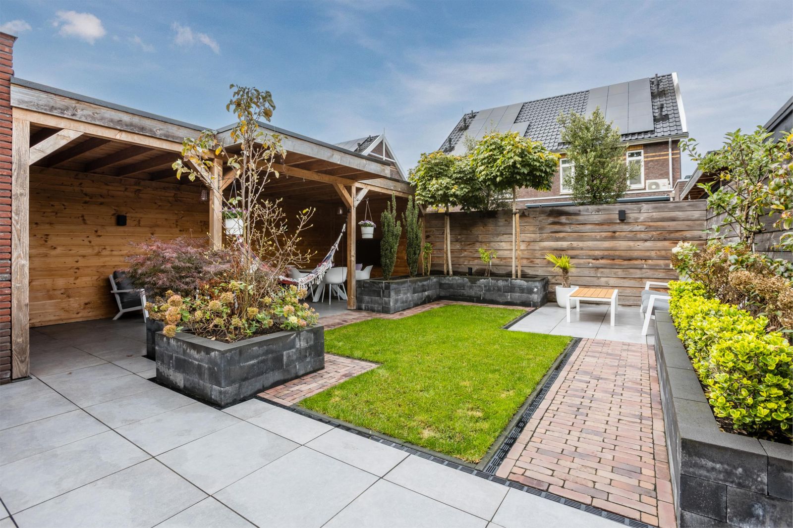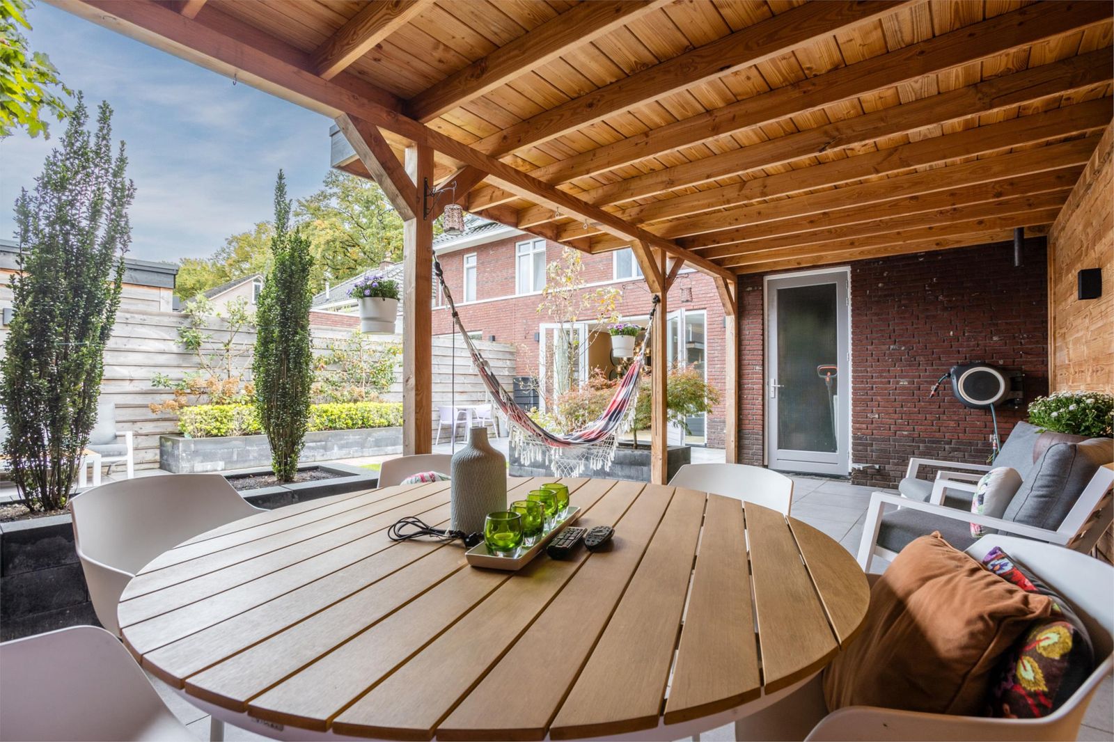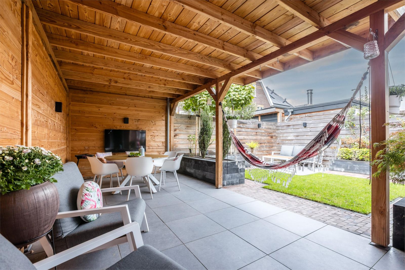De openslaande deuren leiden naar een royale stadstuin met een speelse grote overkapping voorzien van internet en televisie. Dankzij de vele elektrapunten is dit de perfecte plek voor een buitenkeuken, verlichting of een heater – hier geniet je het hele jaar door.