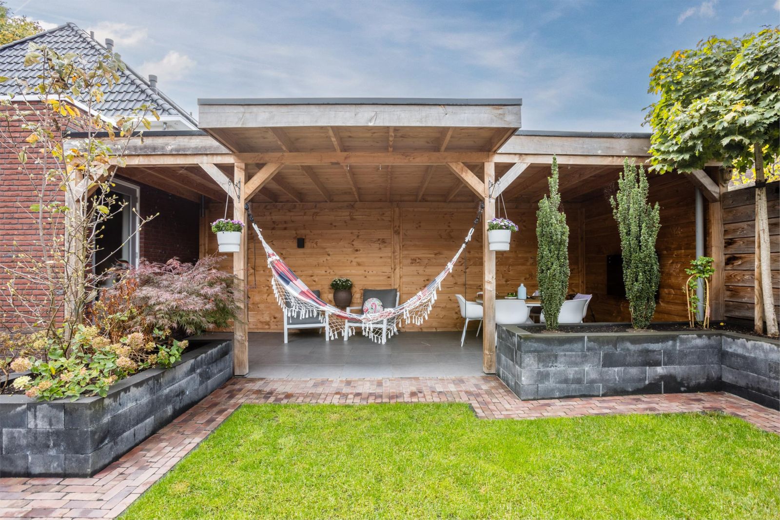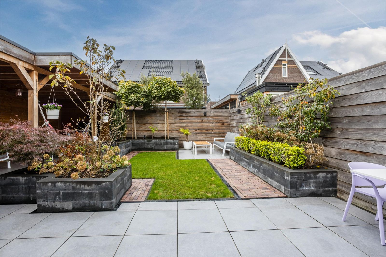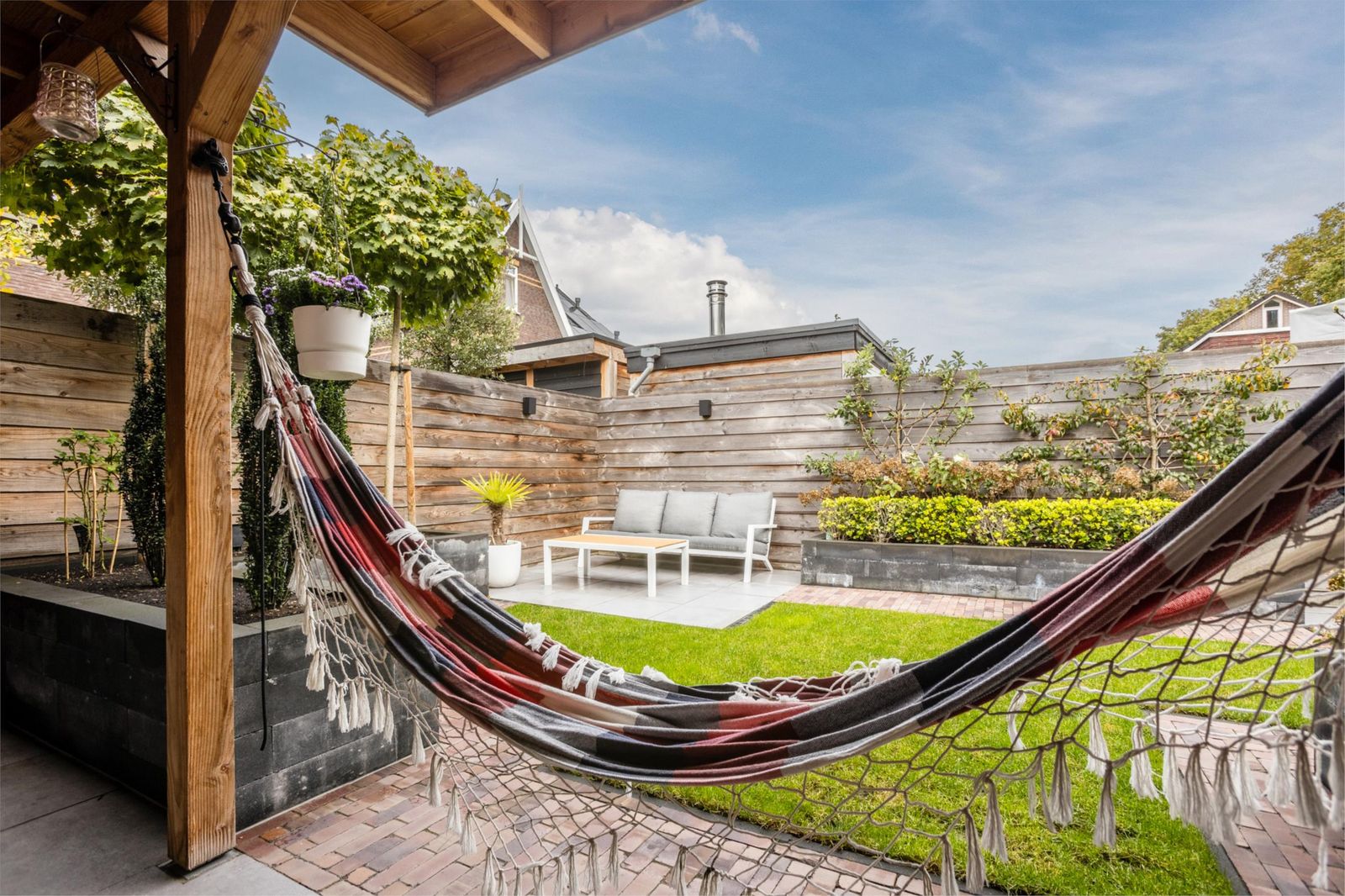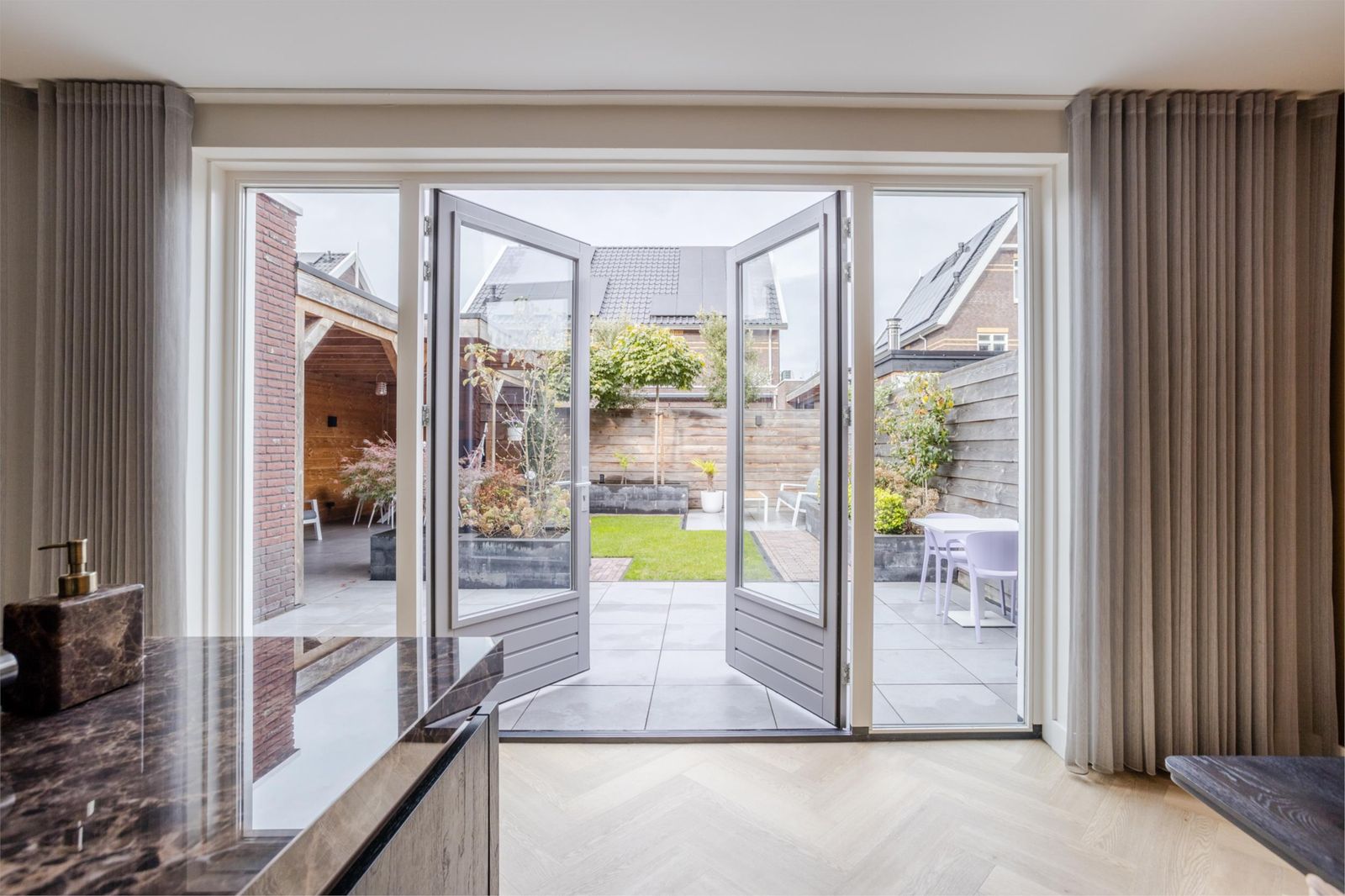 De openslaande deuren leiden naar een royale stadstuin met een speelse grote overkapping voorzien van internet en televisie. Dankzij de vele elektrapunten is dit de perfecte plek voor een buitenkeuken, verlichting of een heater – hier geniet je het hele jaar door.