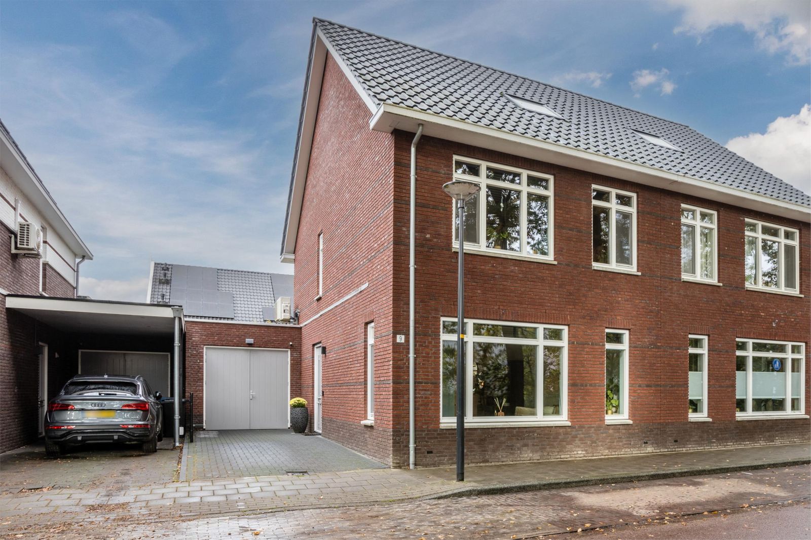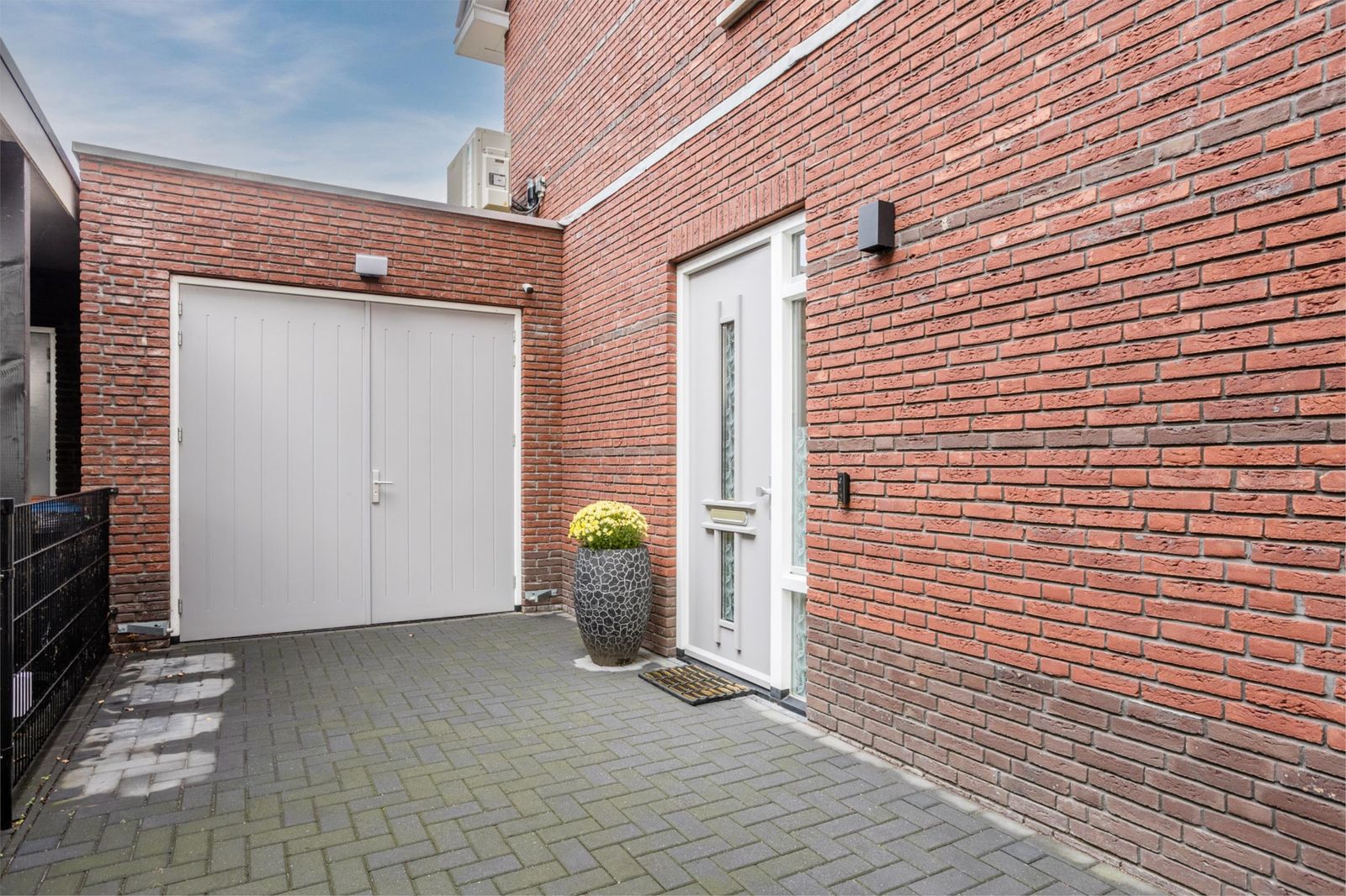 De woning beschikt over een eigen oprit en parkeergelegenheid met vergunning. Aan de oprit ligt de gemetselde berging met geïsoleerde wanden en plafond. Vanuit hier kun je direct de keuken inlopen – ideaal voor dagelijks gebruik.