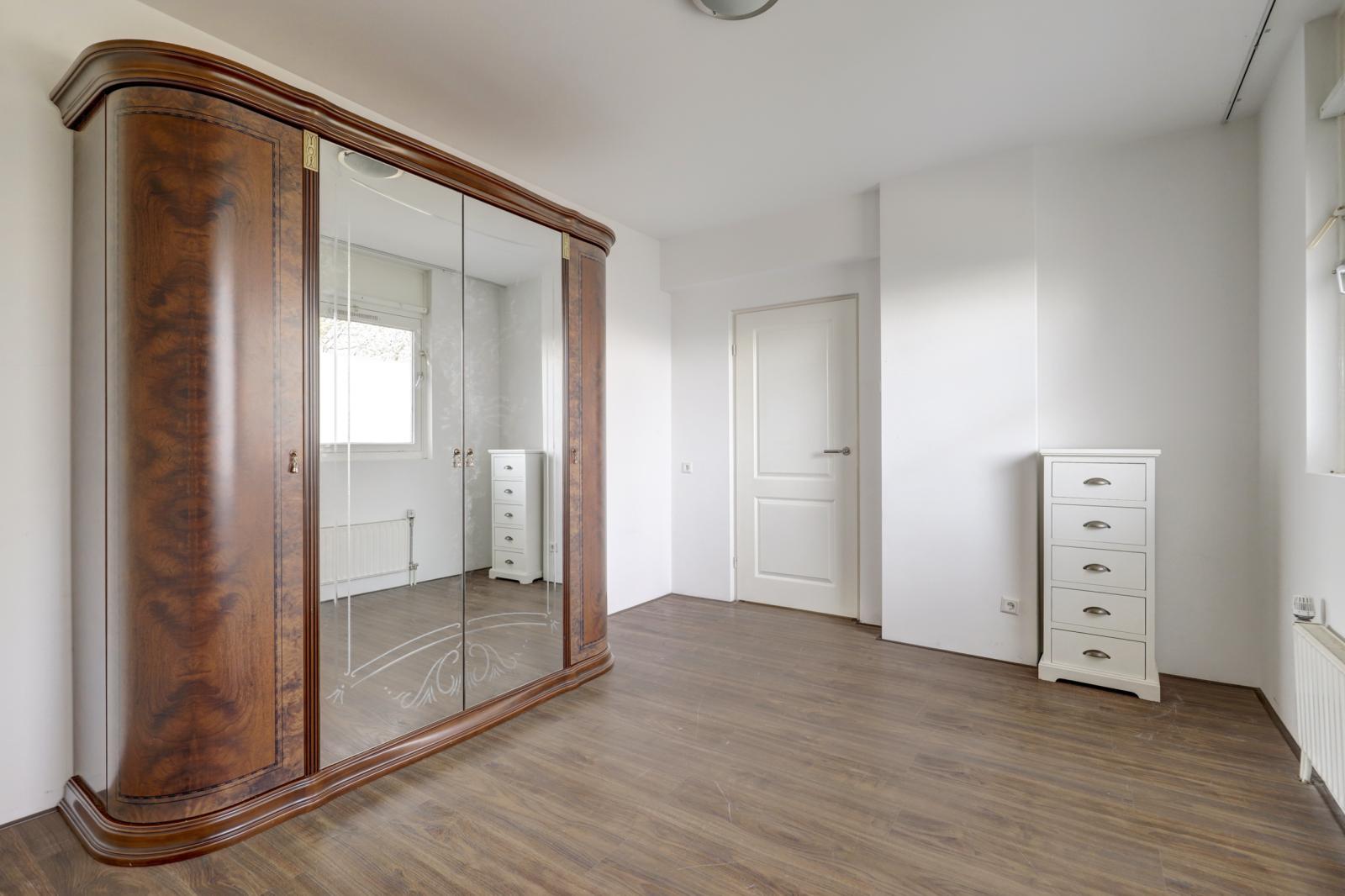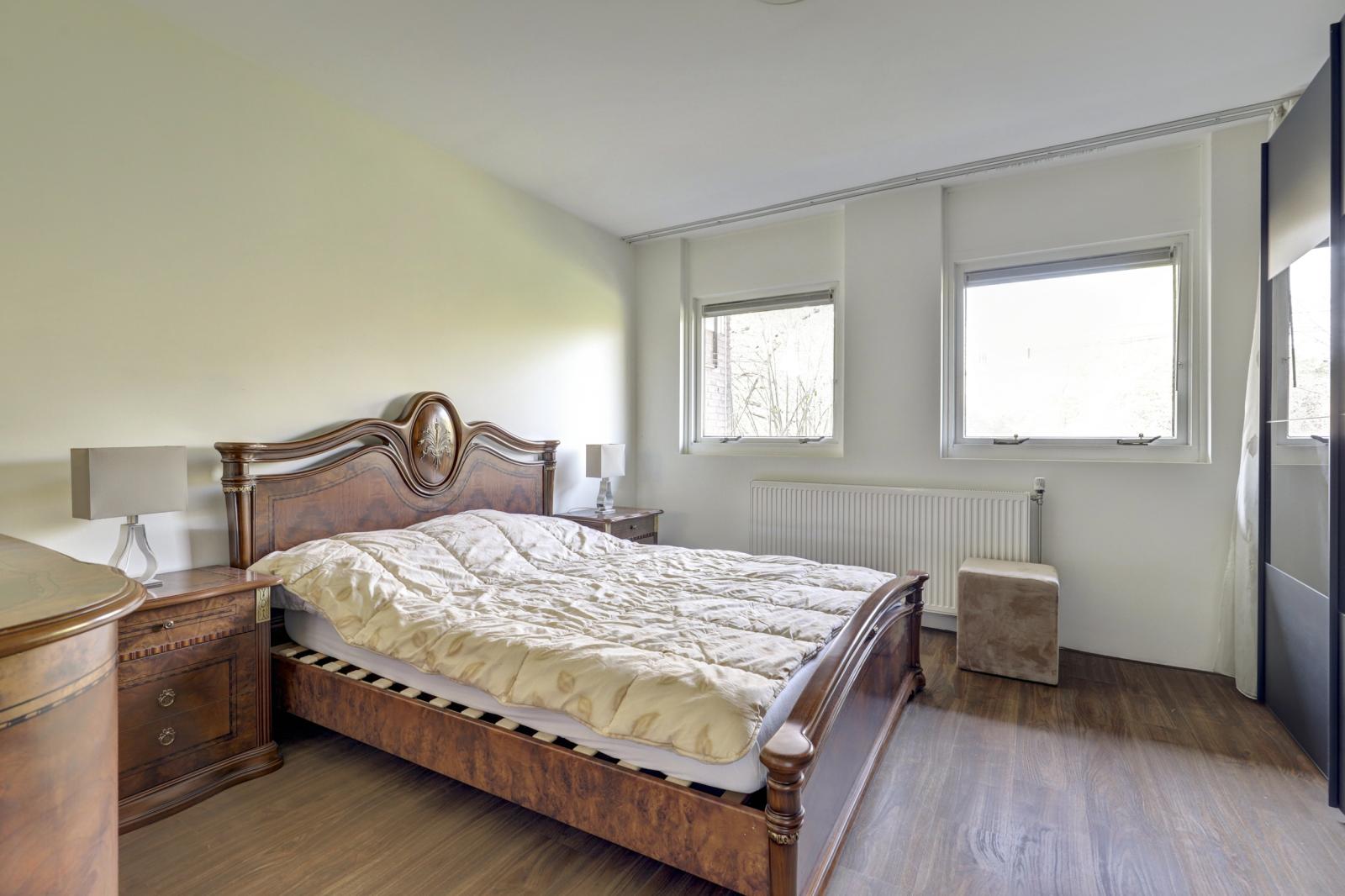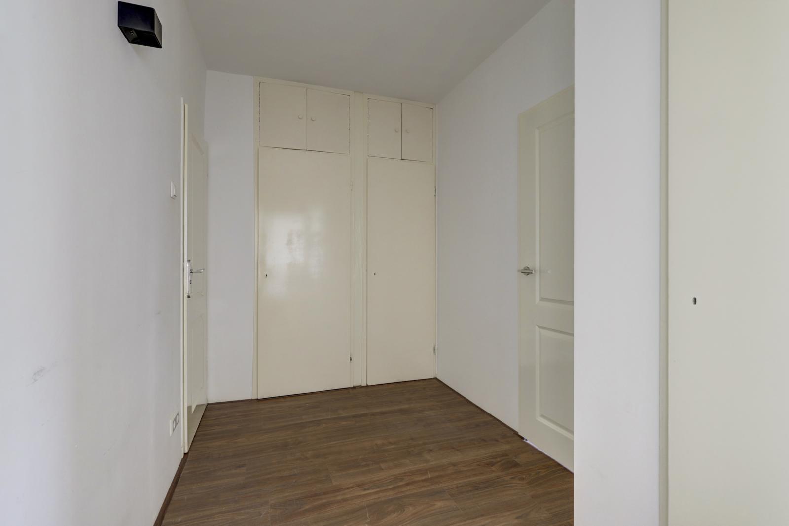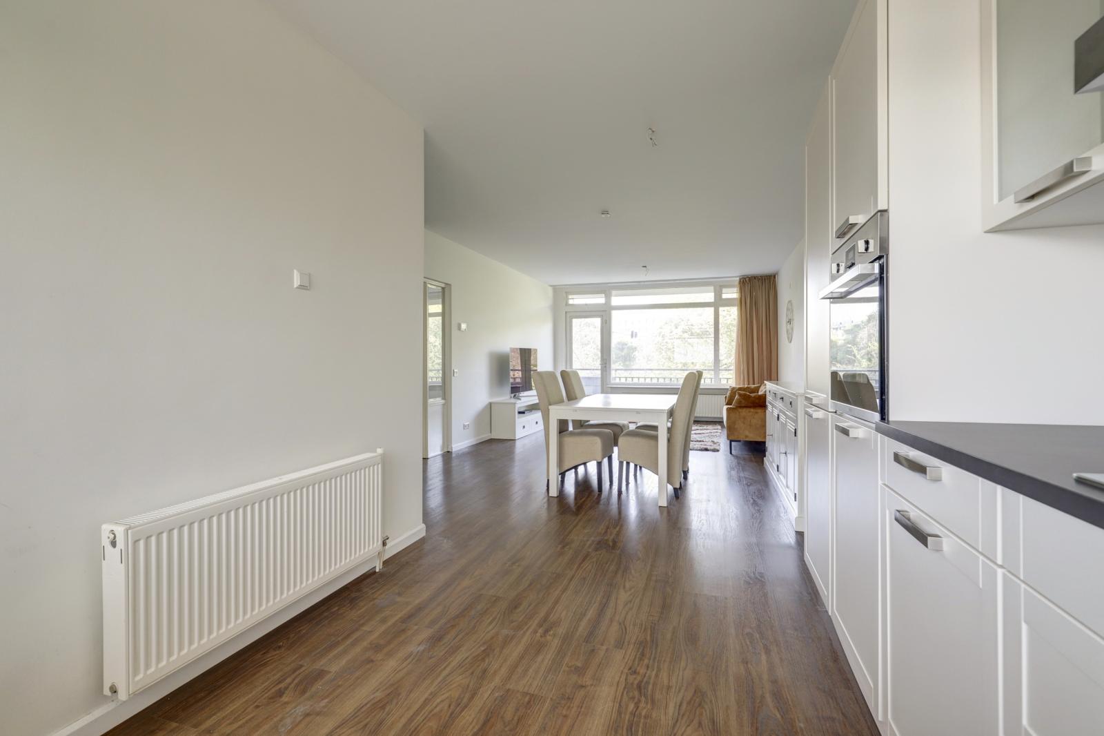 De woonkamer met open keuken strekt zich uit over de volledige dieping van het appartement en vormt het hart van de woning. Grote raampartijen zorgen voor een lichte en open sfeer en via de deur stap je het balkon op van 15 m². De halfopen moderne keuken, uitgevoerd in hoekopstelling en voorzien van diverse inbouwapparatuur, waaronder een 5-pits gasstel, koelkast, vriezer vaatwasser, oven en afzuigkap. Het appartement beschikt over twee ruime slaapkamers, waarvan de grootste aan de achterzijde ligt en voldoende ruimte biedt voor een bed en kledingkast. De andere slaapkamer ligt aan de voorzijde en is ook geschikt als werkkamer.