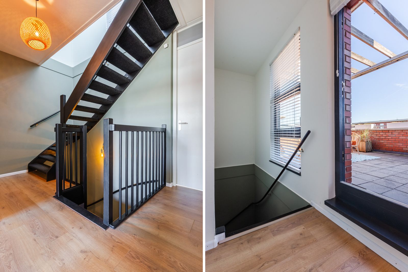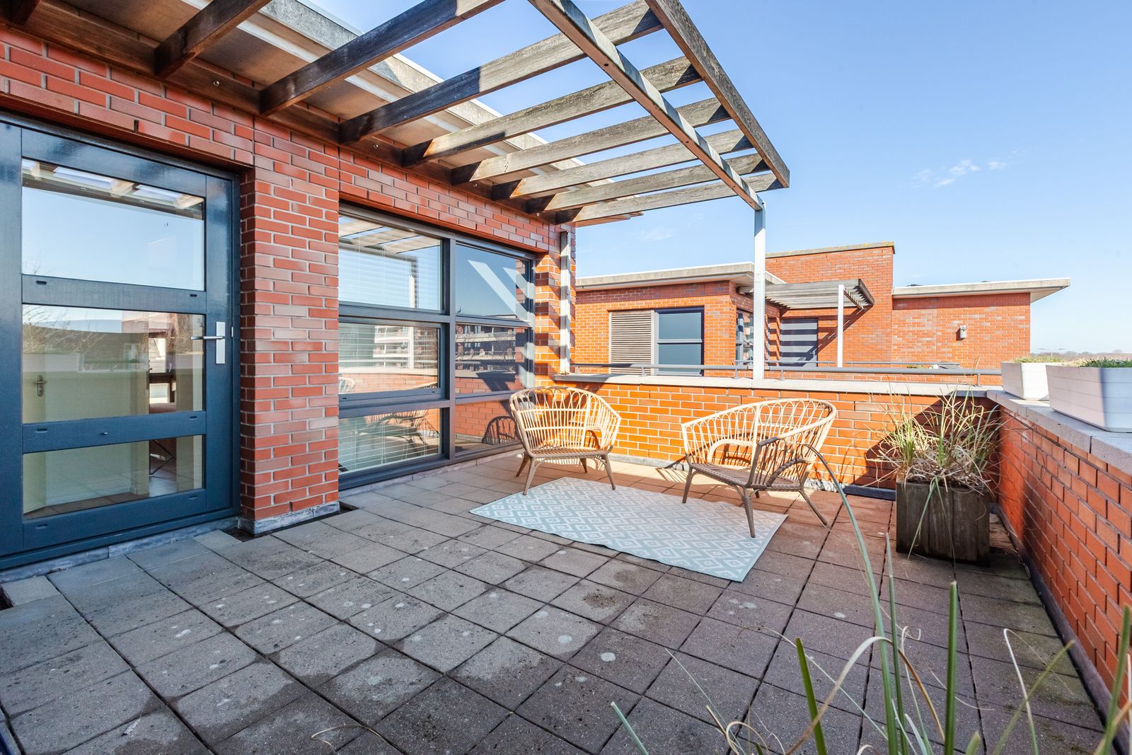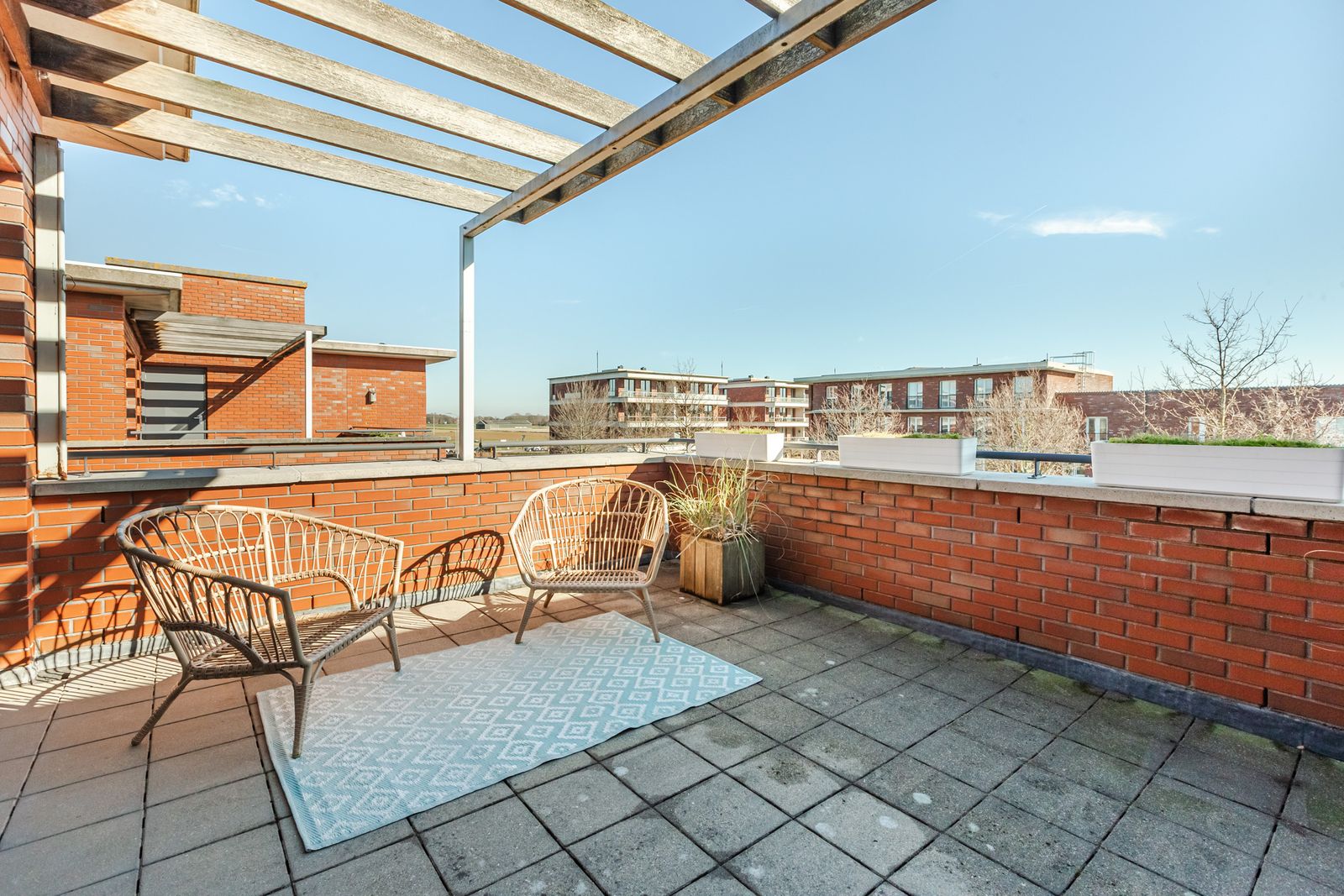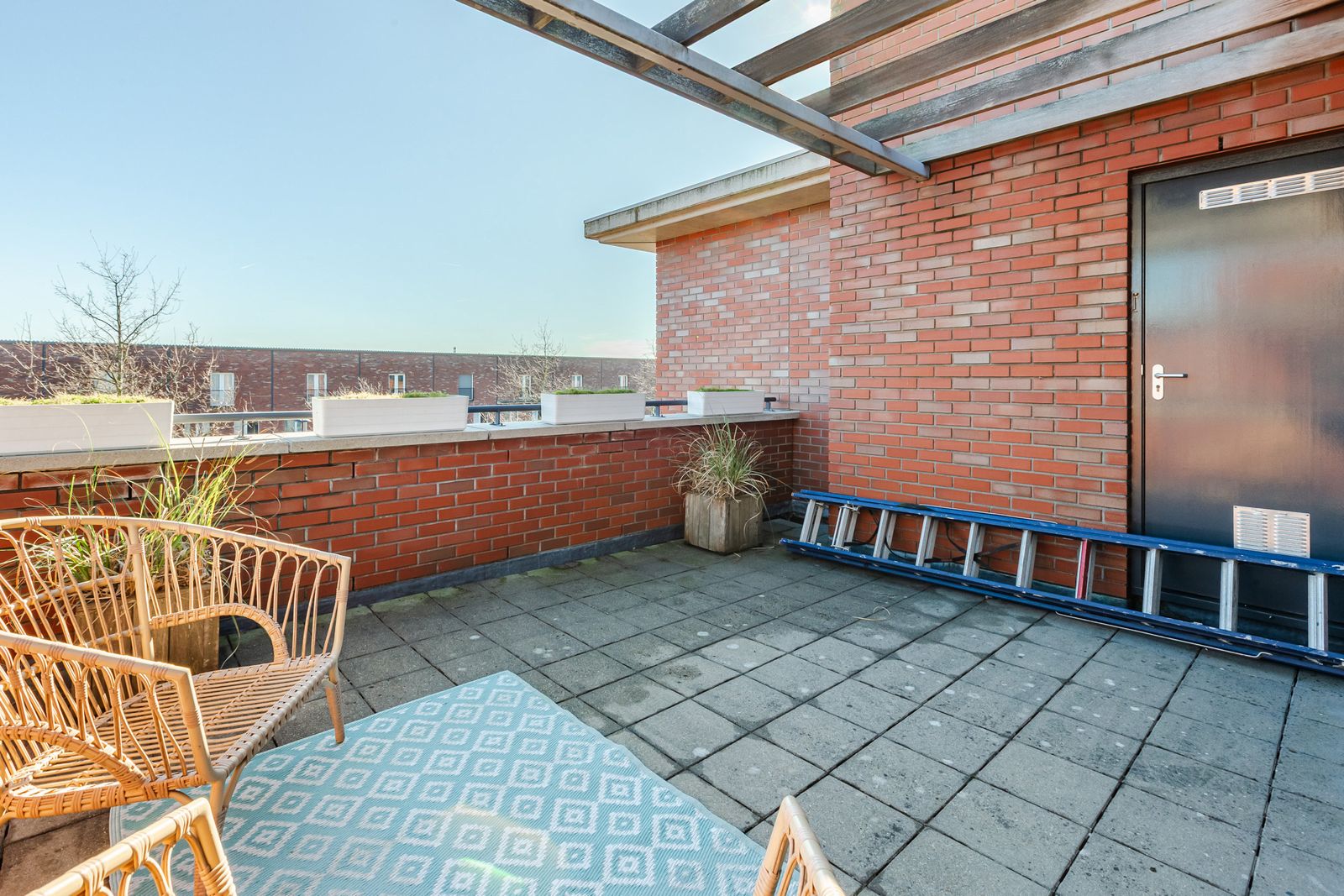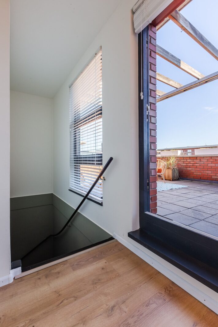 Dakterras met ochtendzon en extra berging met wateraansluiting.