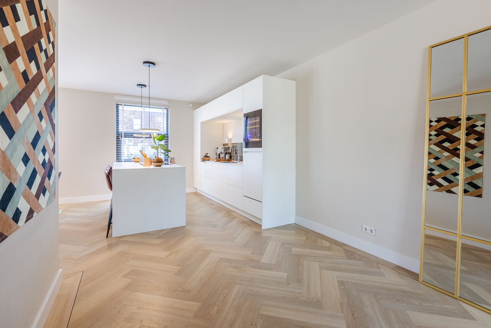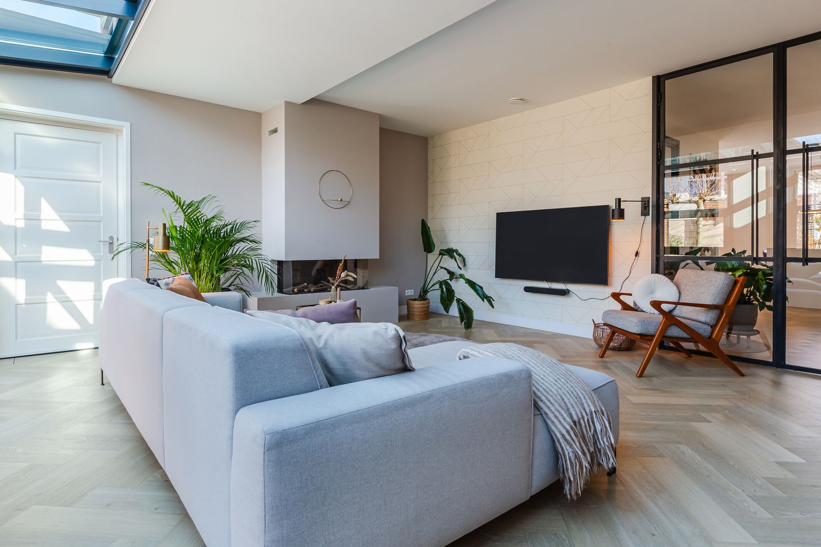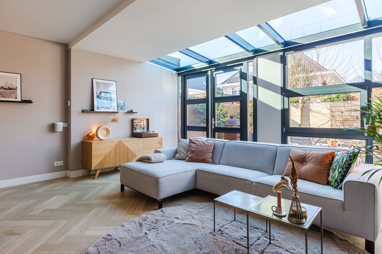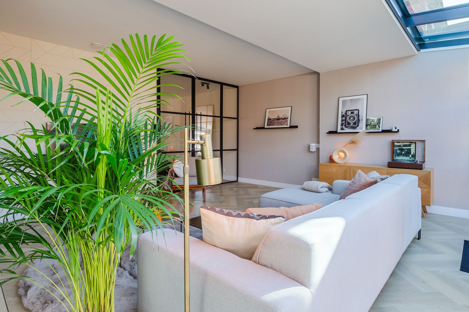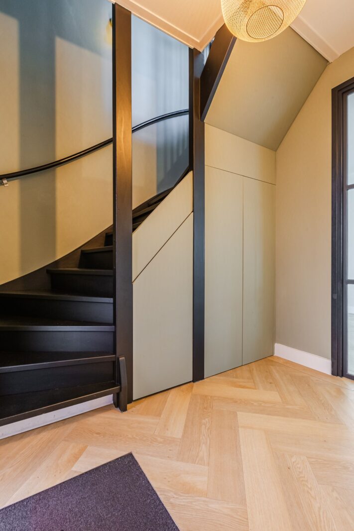 De visgraatvloer met vloerverwarming en zwarte bies geeft de begane grond een mooi afgewerkte uitstraling.