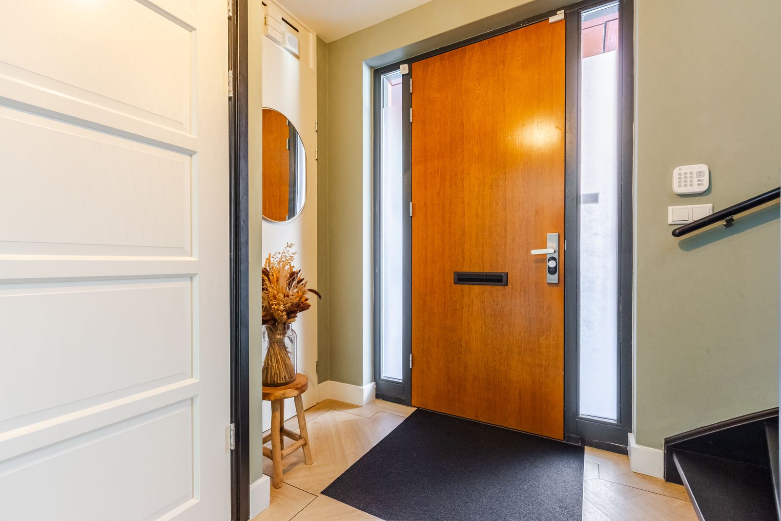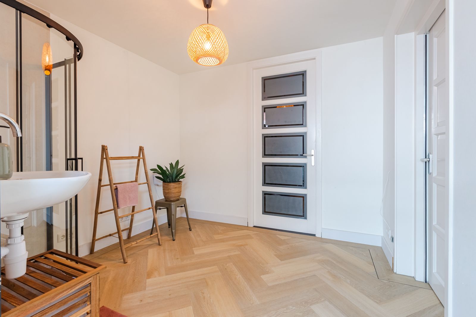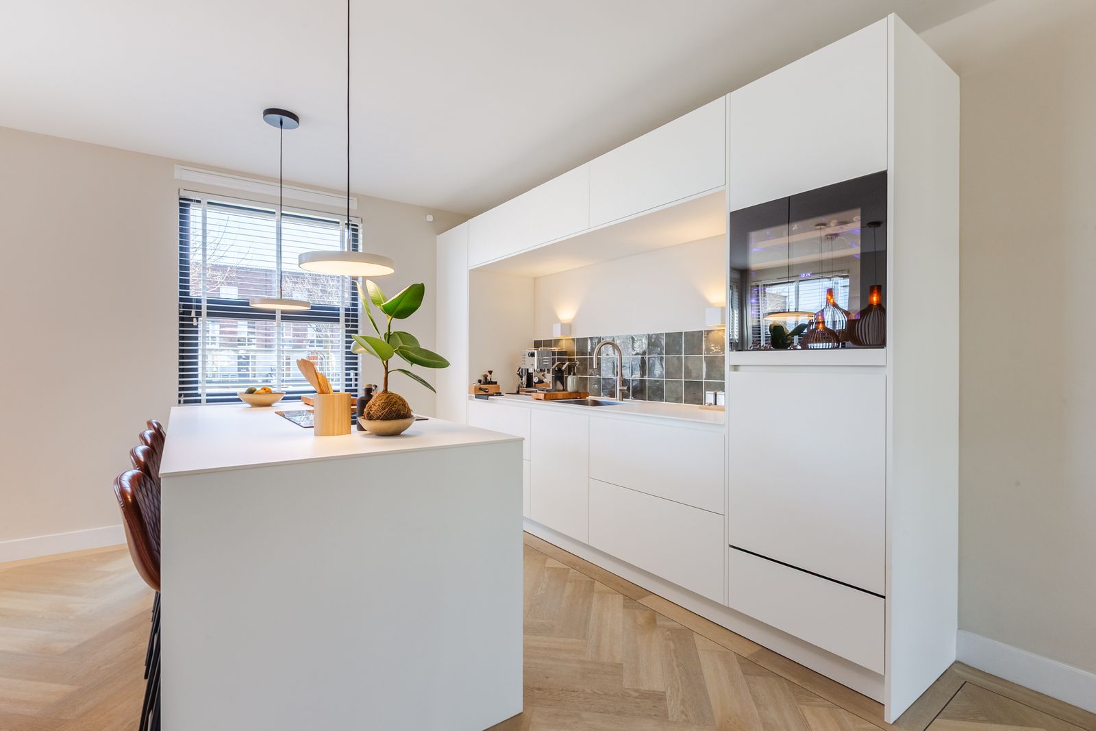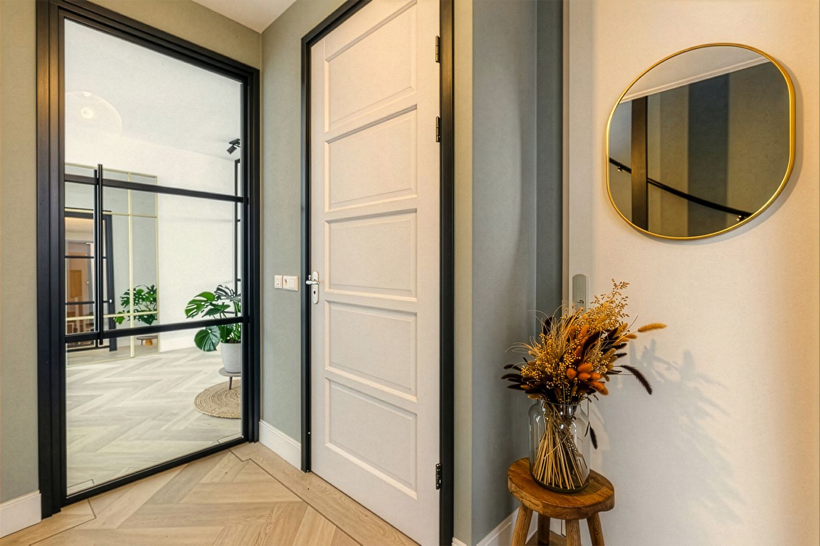 De visgraatvloer met vloerverwarming en zwarte bies geeft de begane grond een mooi afgewerkte uitstraling.