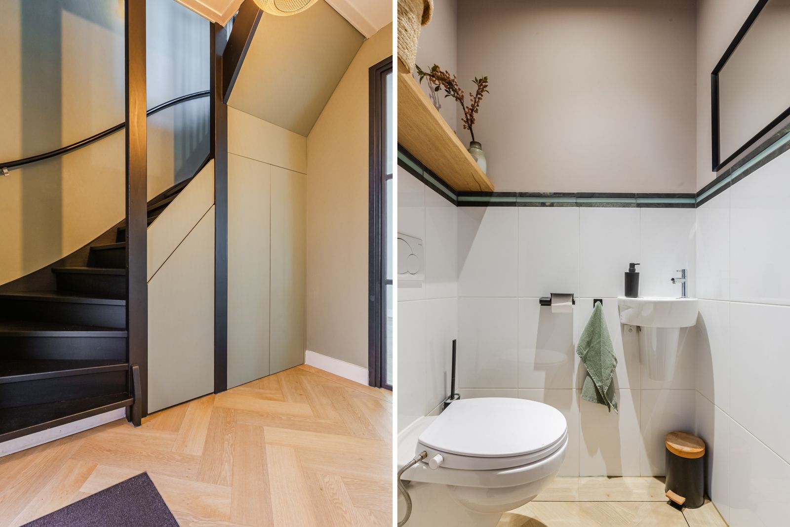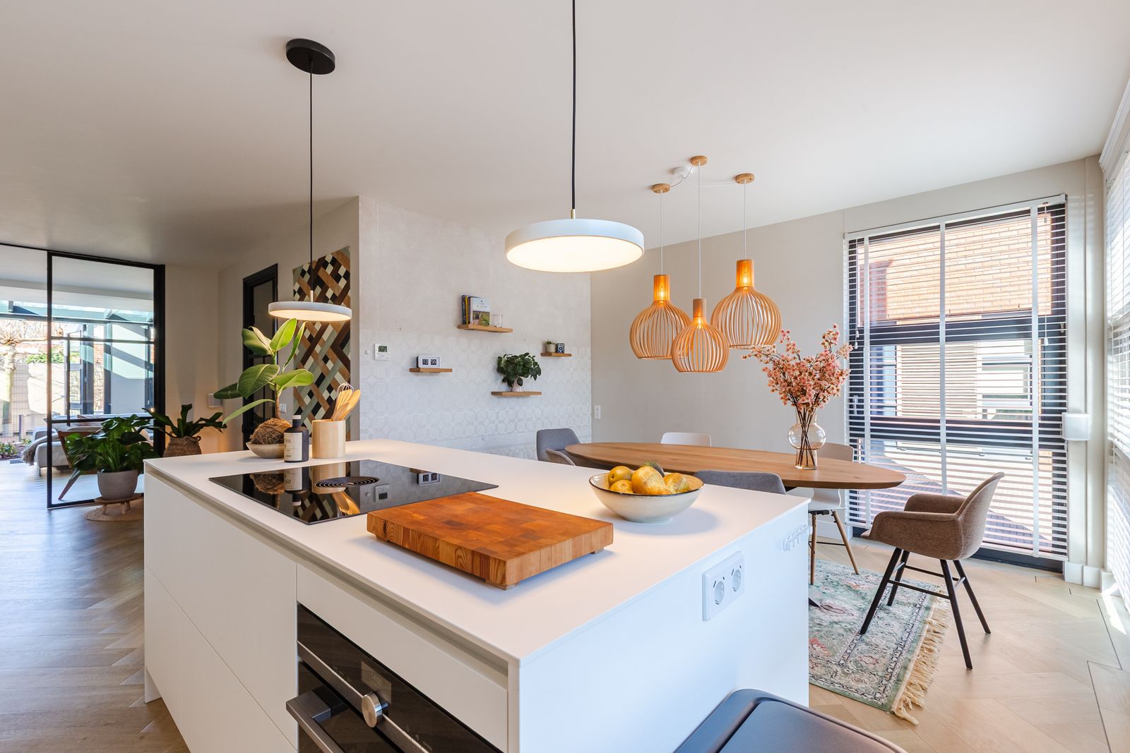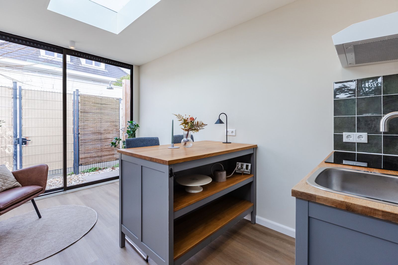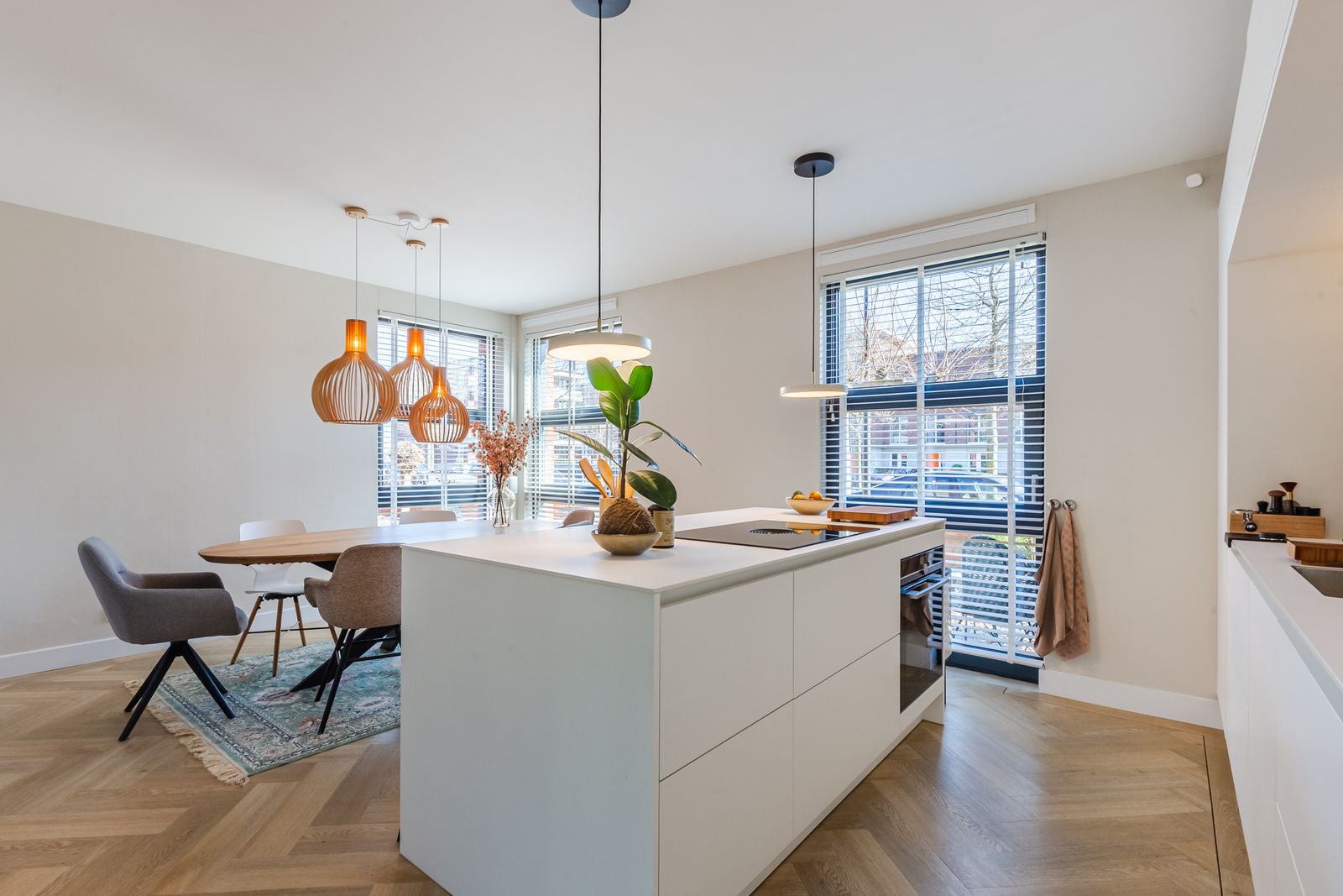 De visgraatvloer met vloerverwarming en zwarte bies geeft de begane grond een mooi afgewerkte uitstraling.