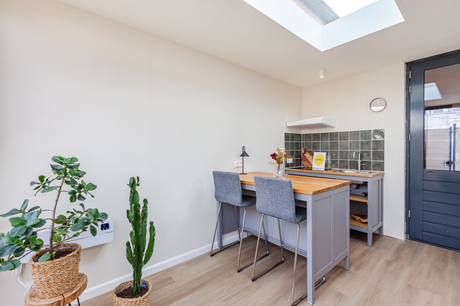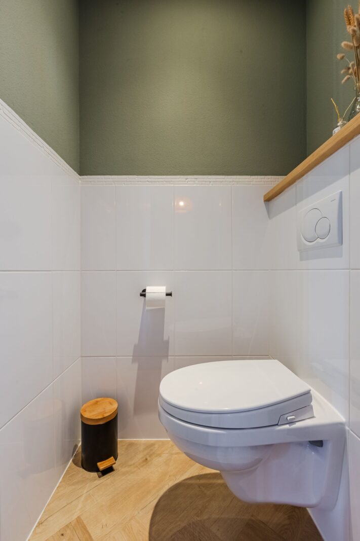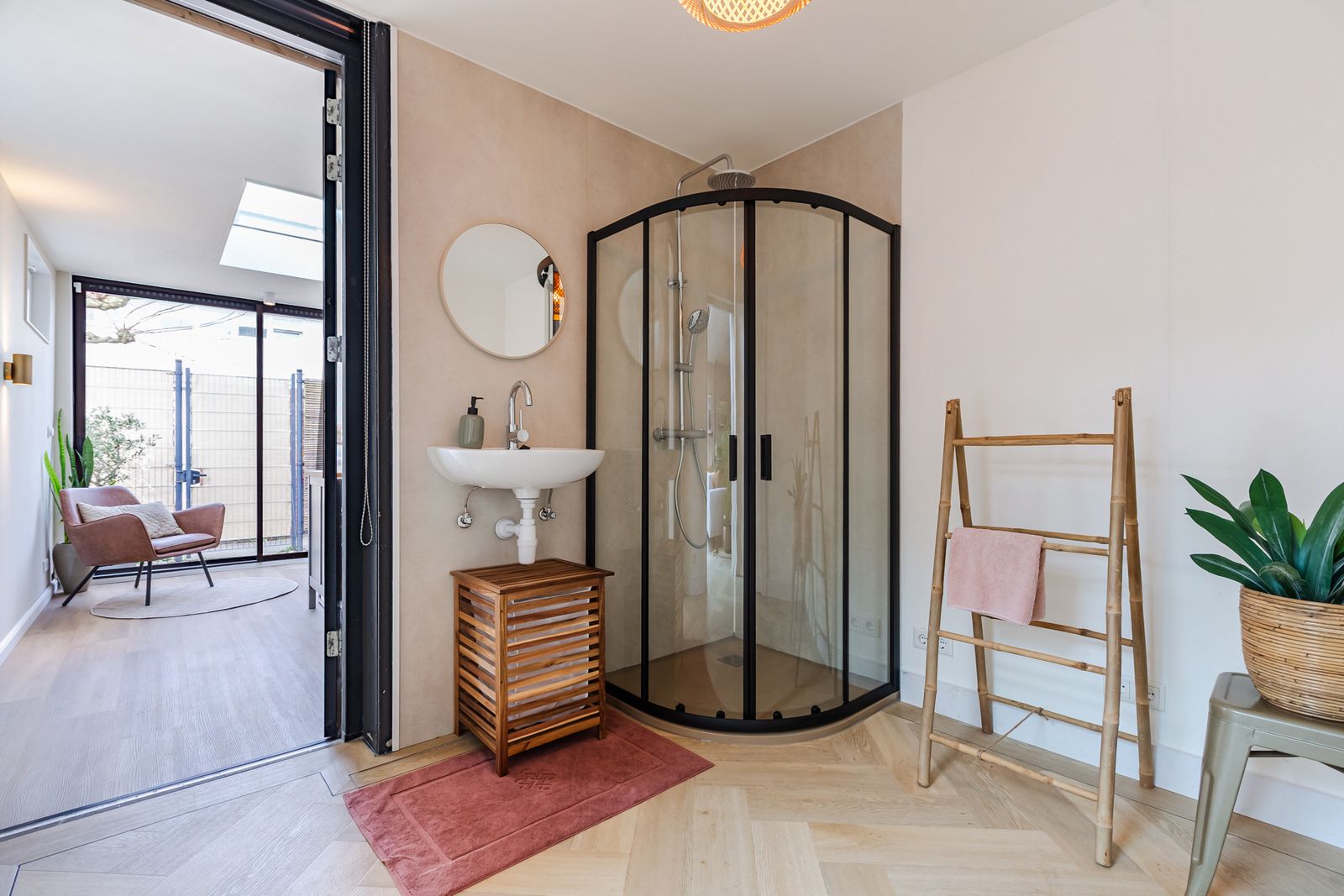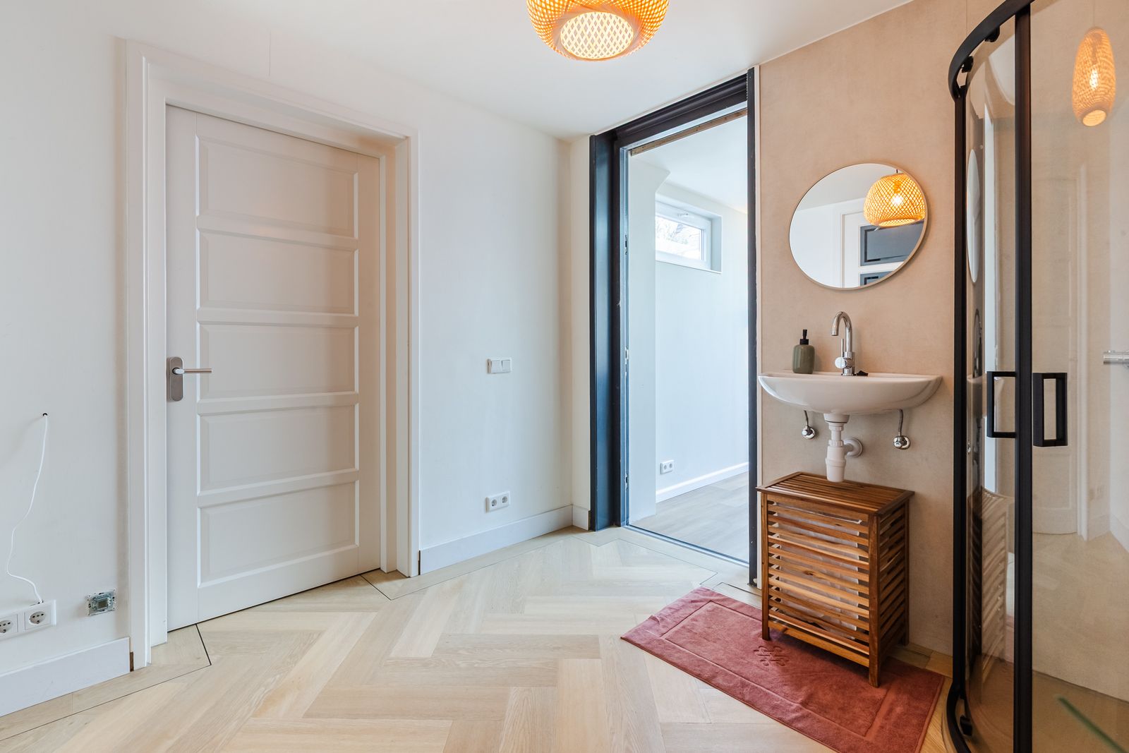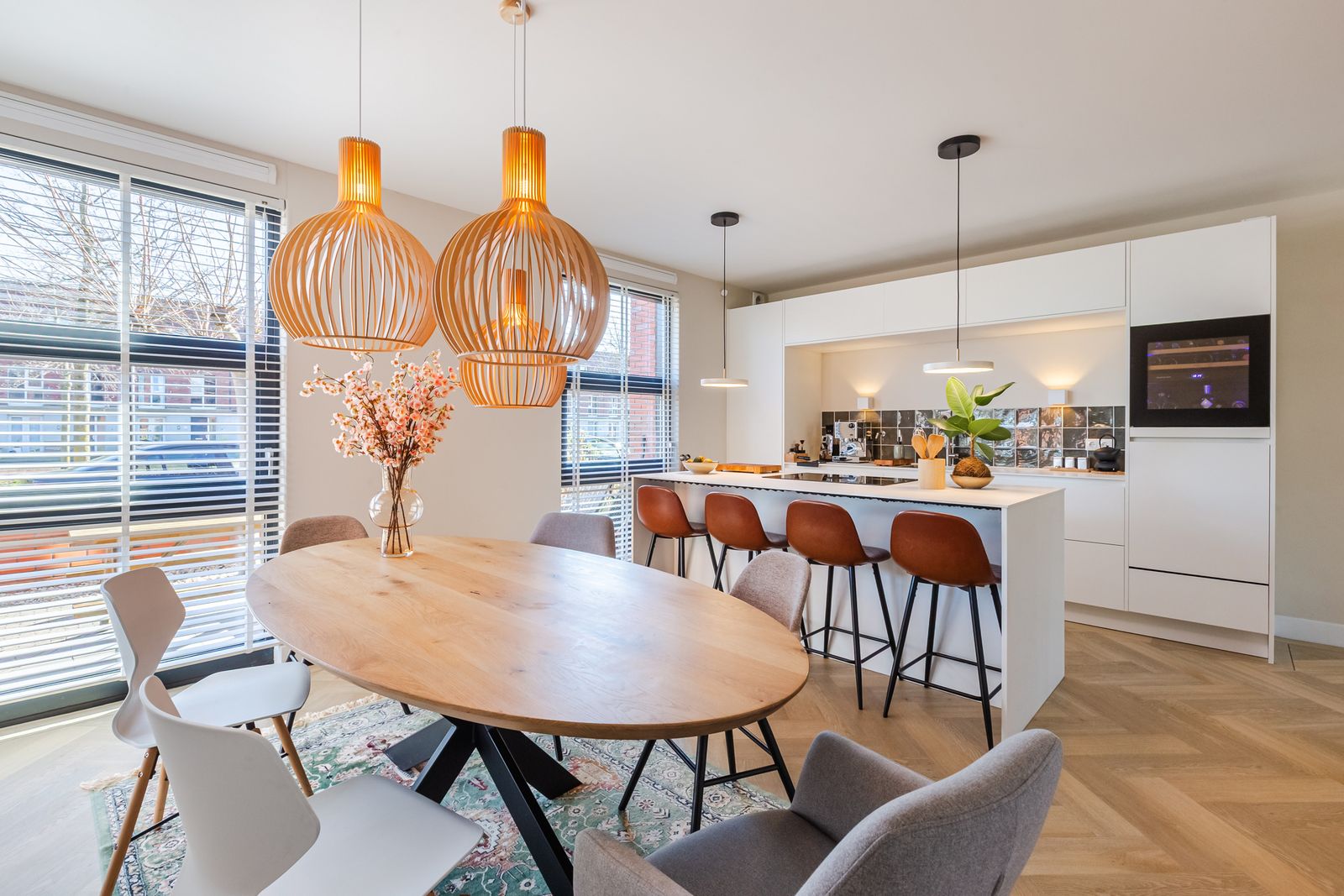 De visgraatvloer met vloerverwarming en zwarte bies geeft de begane grond een mooi afgewerkte uitstraling.