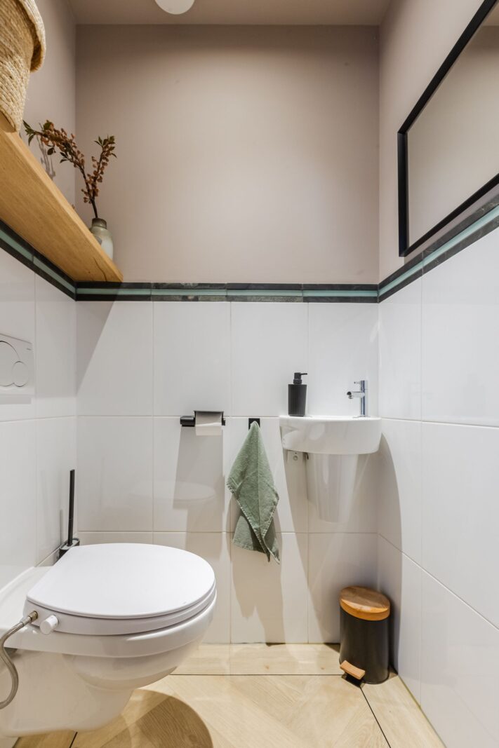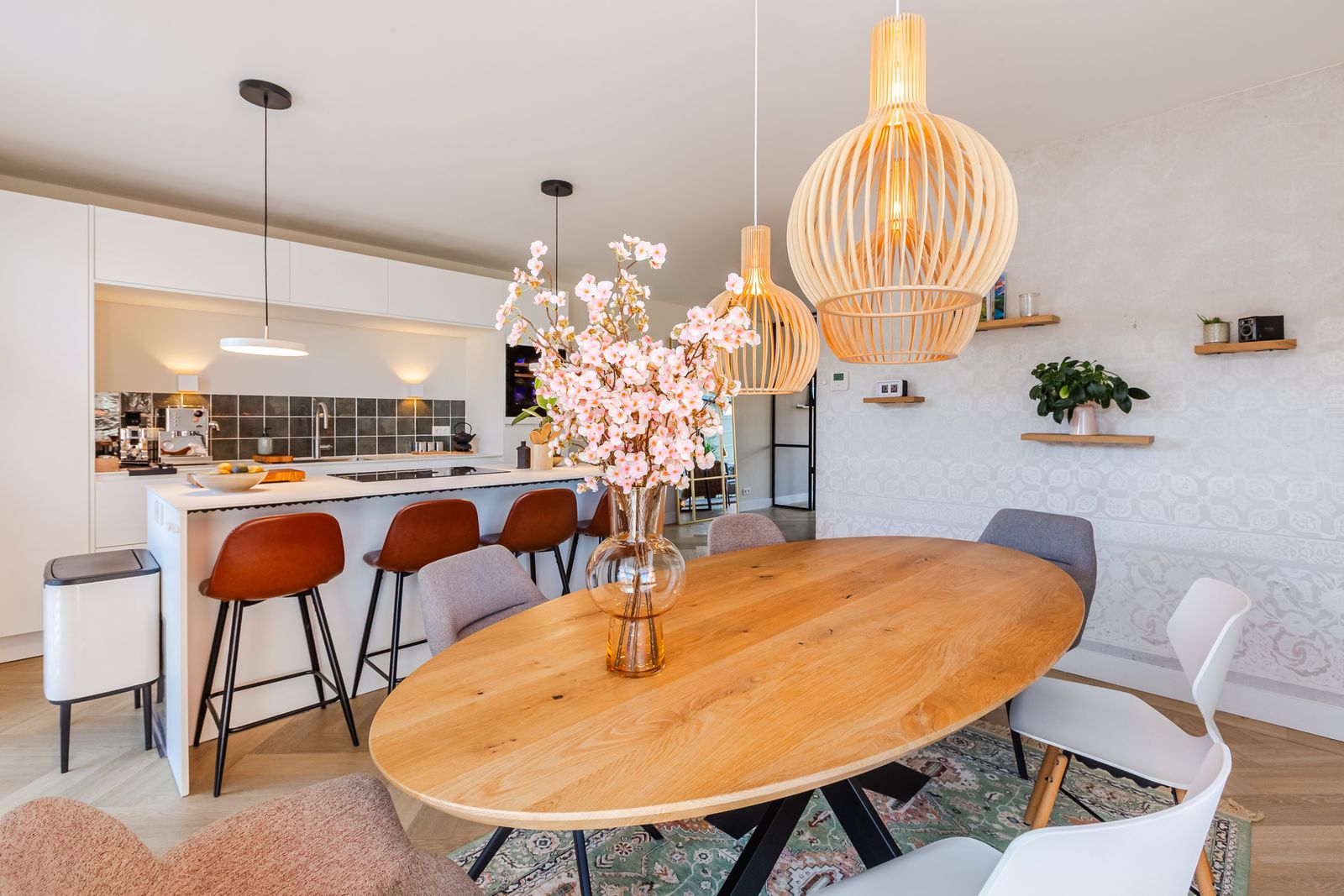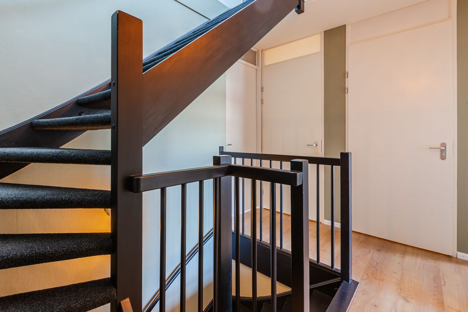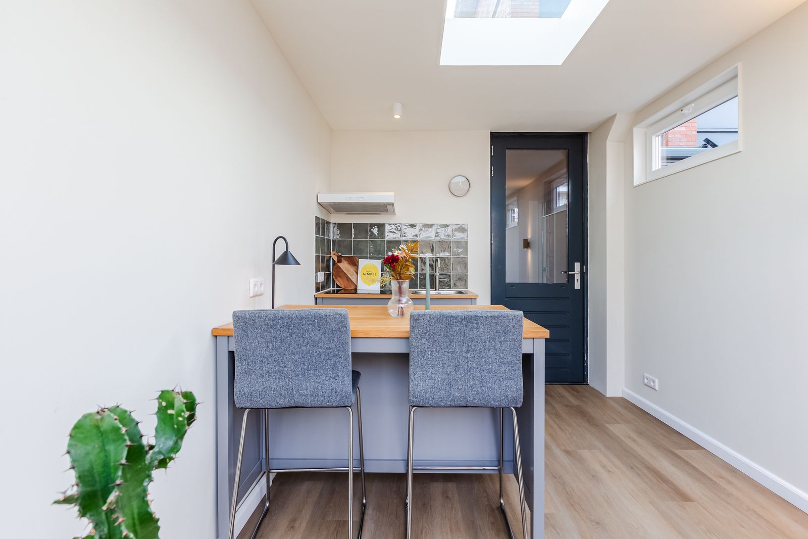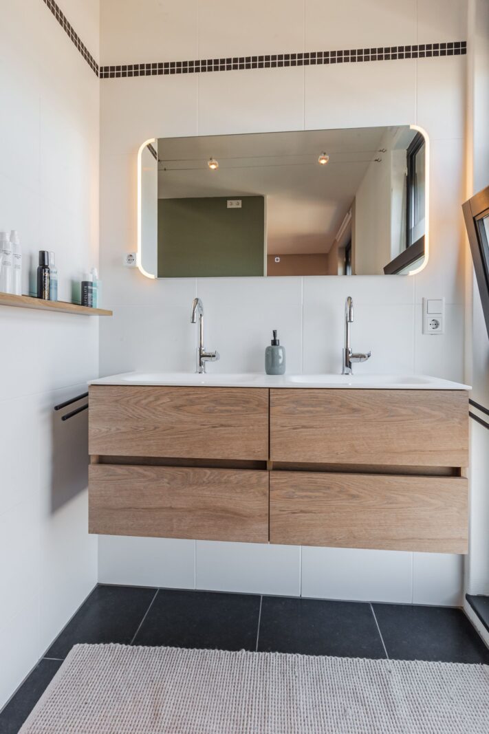 De visgraatvloer met vloerverwarming en zwarte bies geeft de begane grond een mooi afgewerkte uitstraling.