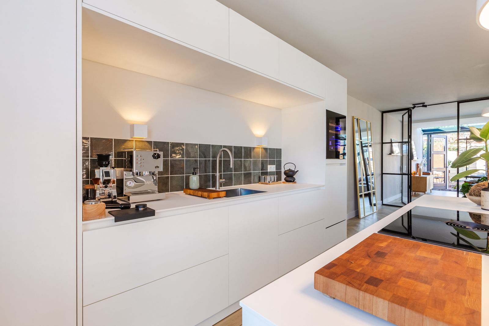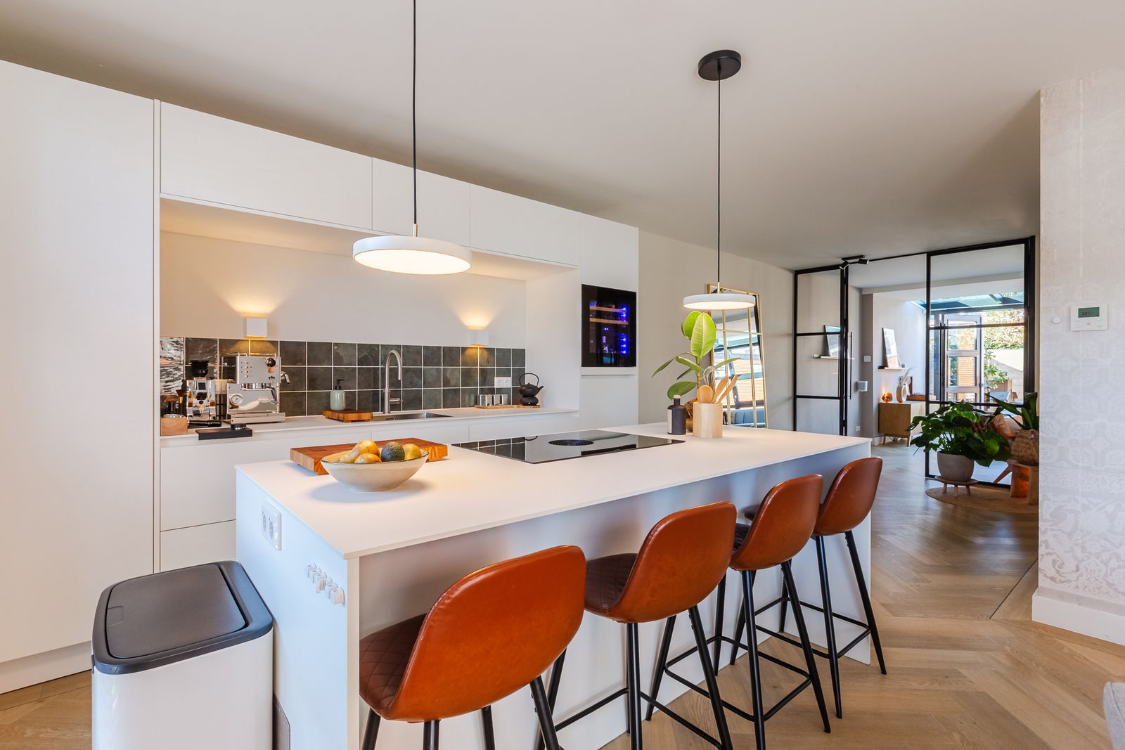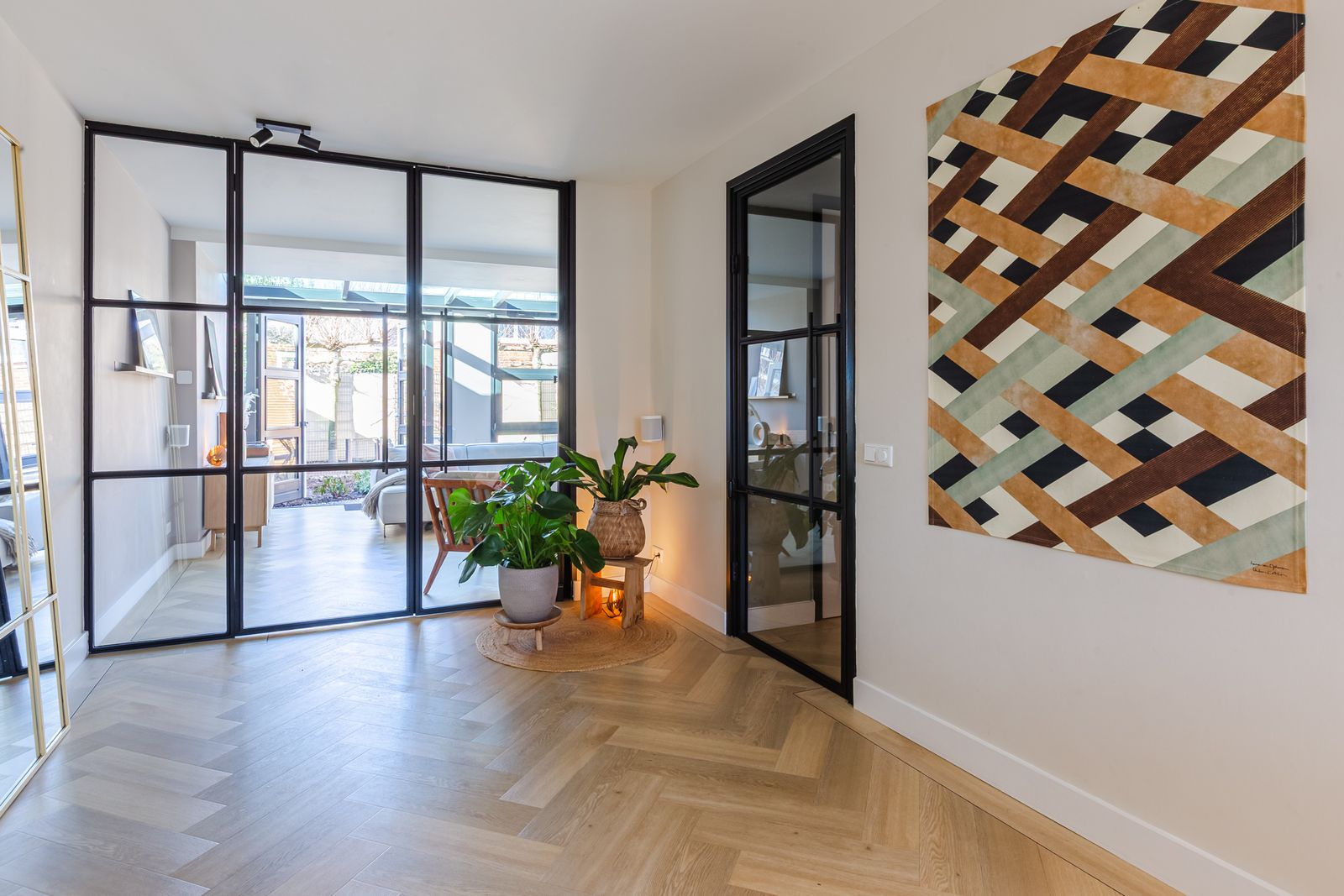 Via de hal met maatwerkkasten onder de trap en een stijlvolle stalen/glazen deur kom je in de leefruimte.