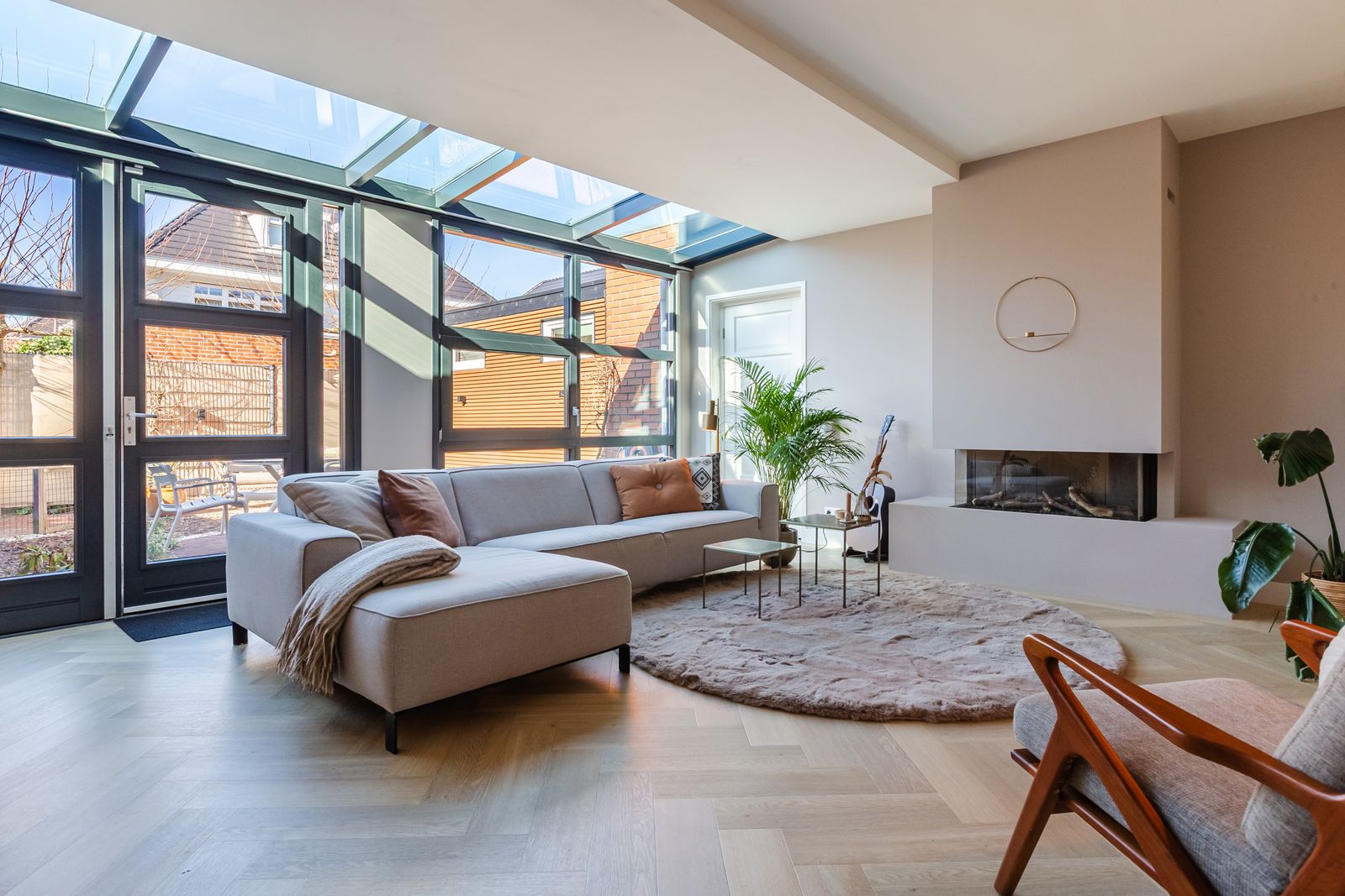 De woonkamer is bewust aan de achterzijde geplaatst voor rust en stilte. De uitbouw met lichtstraat zorgt voor een prachtige lichtinval. De gashaard (met afstandsbediening) maakt het geheel compleet. Stalen/glazen deuren zorgen voor een stijlvolle en praktische afscheiding tussen keuken en woonkamer.