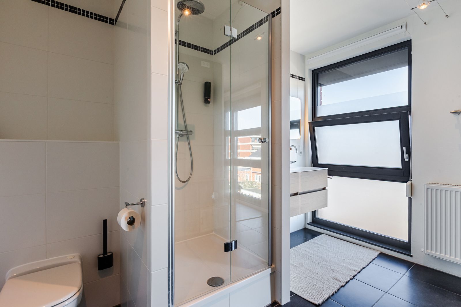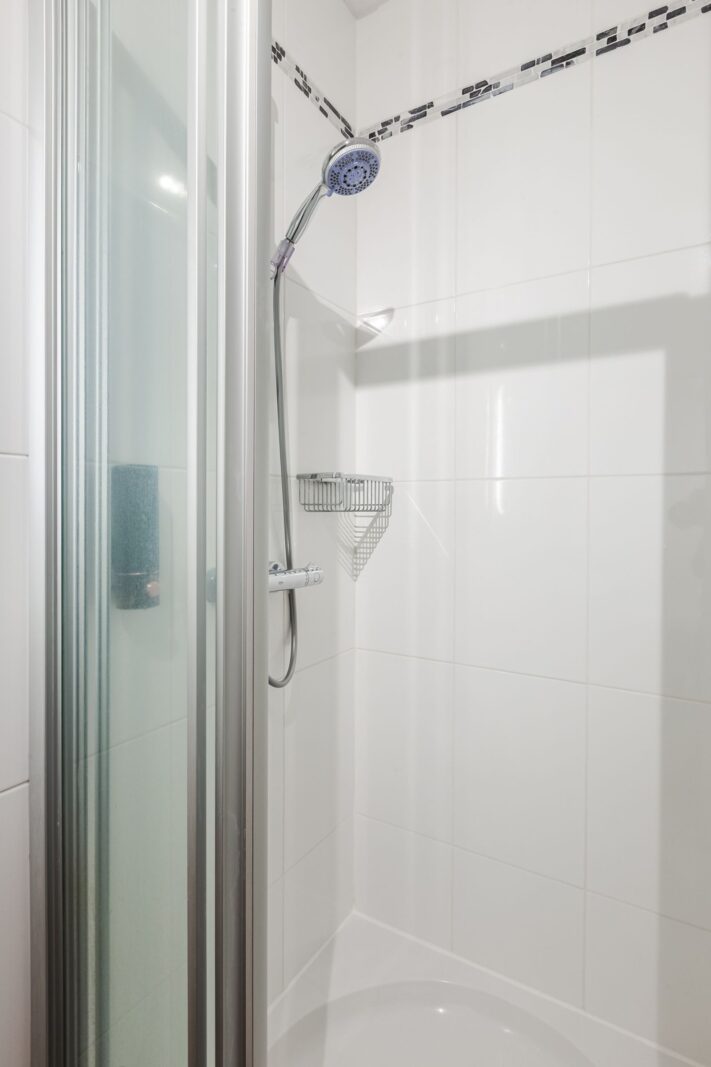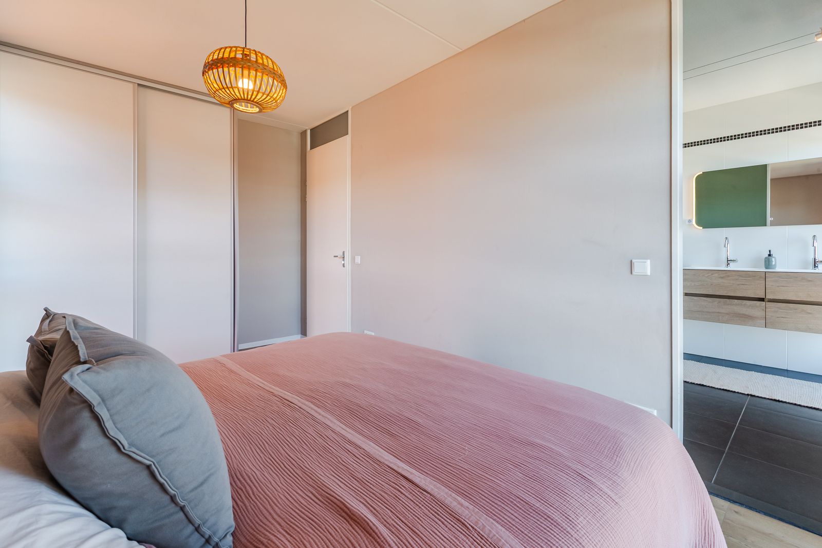 Ruime slaapkamer met een vaste inbouwkast en eigen badkamer voorzien van douche, Broyeur toilet en dubbel wastafelmeubel.
