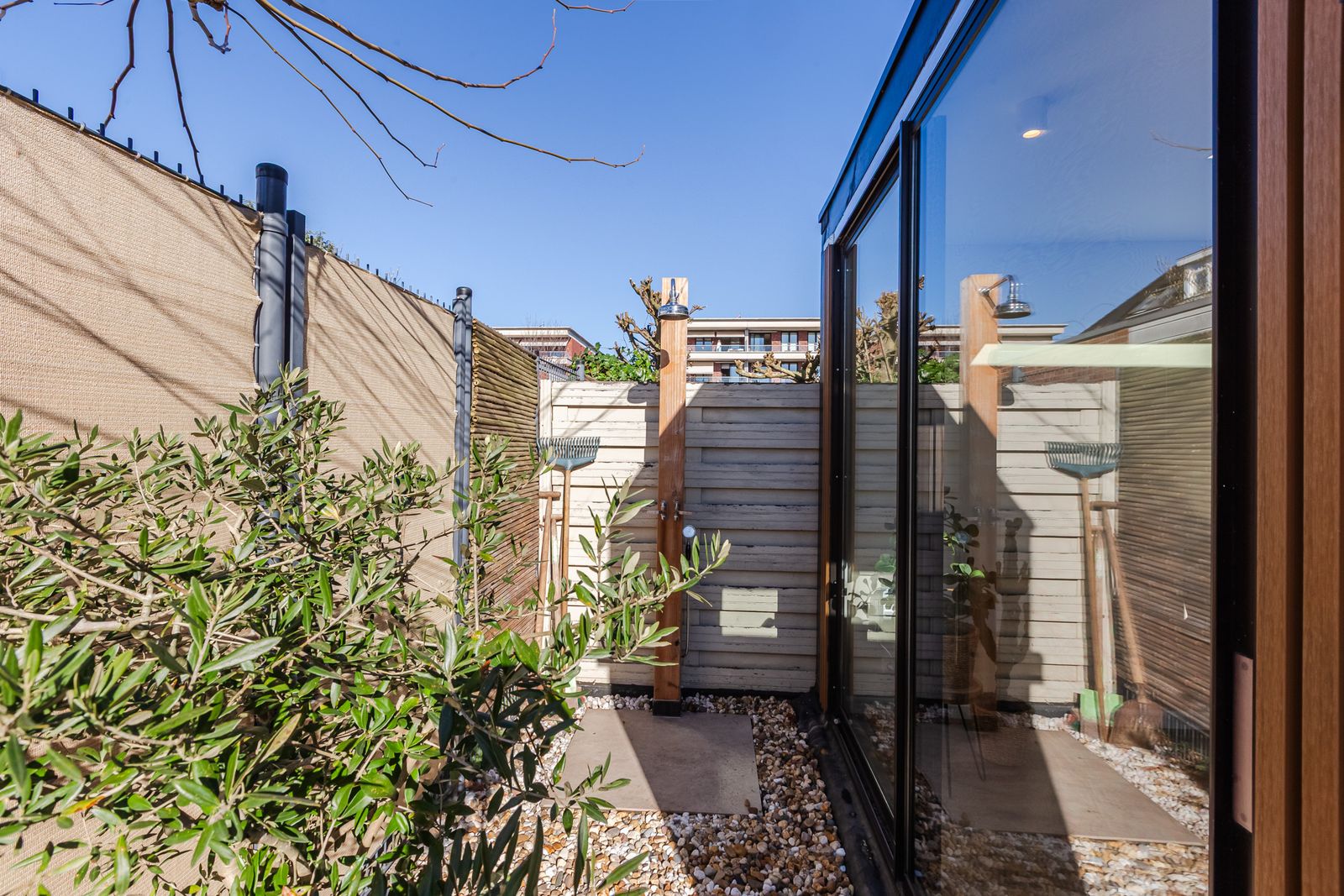 De achtertuin op het westen biedt middag- en avondzon. Sfeervolle tuinverlichting is aangebracht en twee mooie platanen zorgen in de zomer voor veel privacy en een groene uitstraling. Daarnaast beschikt de tuin over een buitendouche – ideaal na een stranddag of op warme zomerdagen.