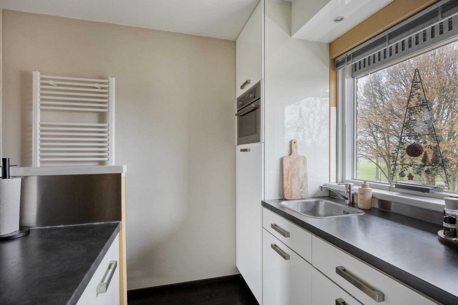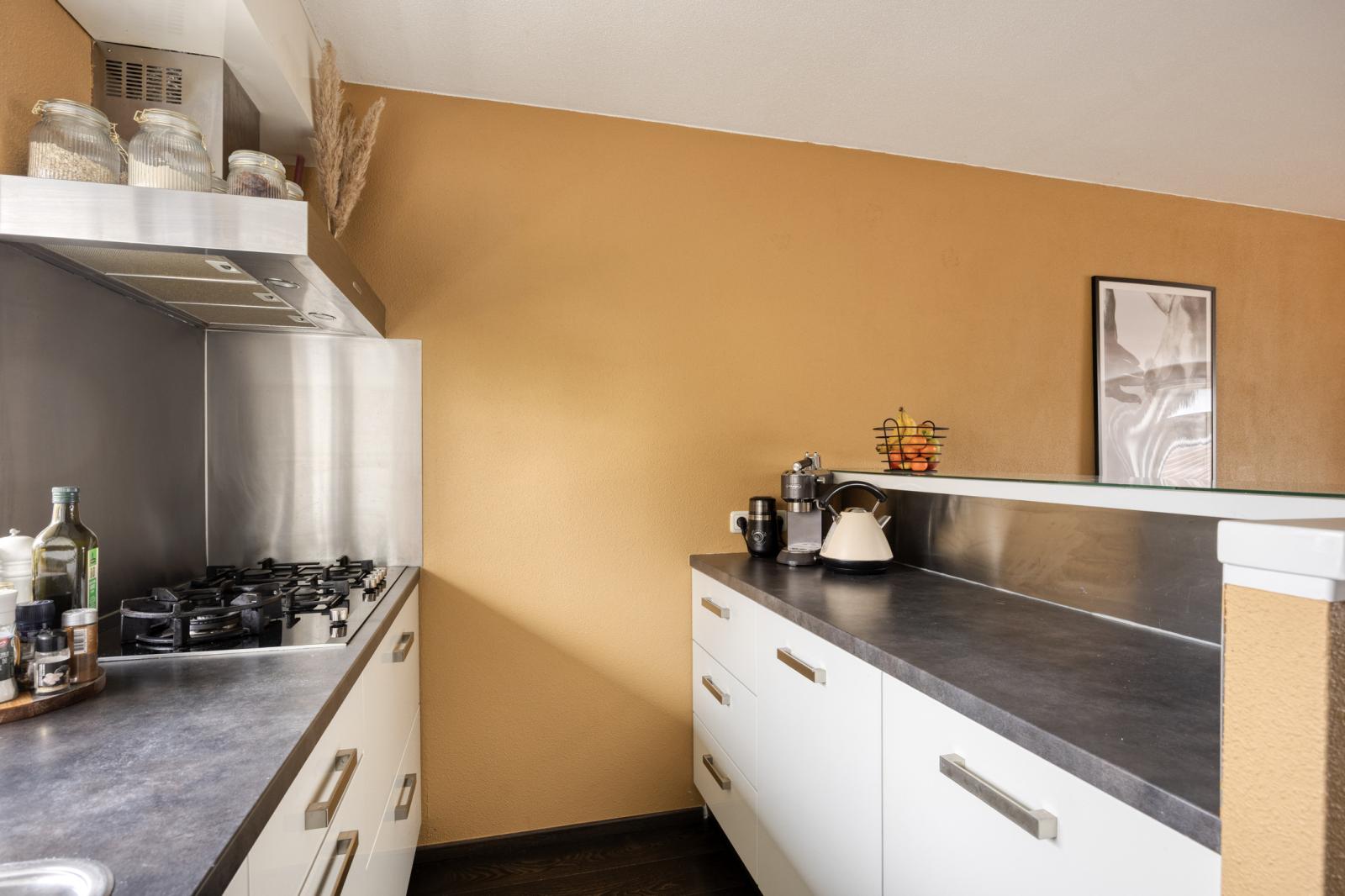 Entree, hal met meterkast, toilet, bergkast en trapopgang. Vanuit de hal bereik je de lichte woonkamer met open keuken voorzien van o.a. oven, 5-pits gasstel, afzuigkap, vaatwasser en koelkast. De grote raampartijen zorgen voor veel daglicht en een prettige woonruimte. Via de woonkamer is het zonnige balkon op het zuiden te bereiken _ een heerlijke plek om van het uitzicht en de zon te genieten.