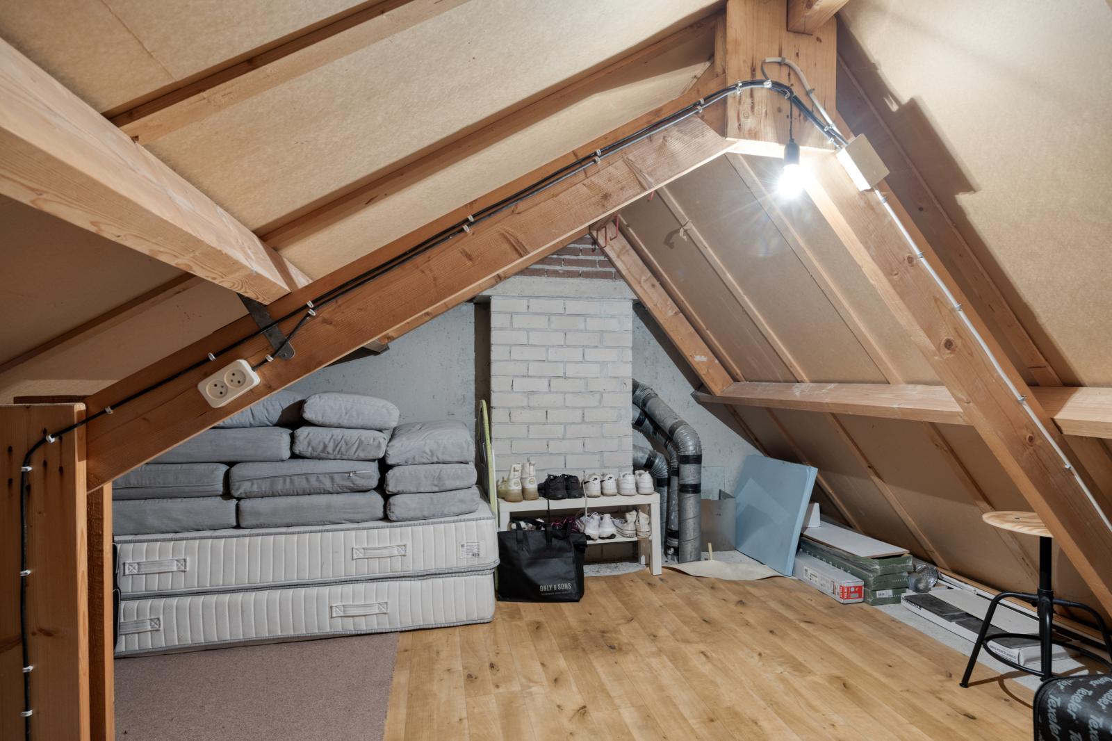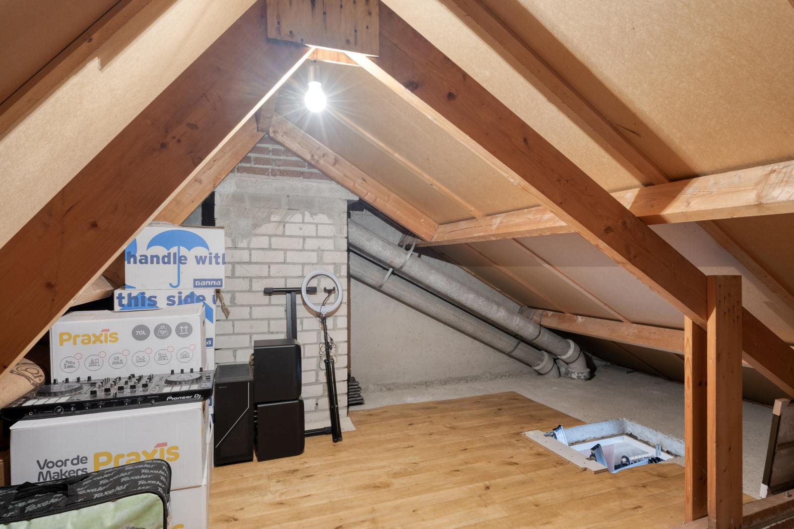 Via een luik met vlizotrap is de bergzolder bereikbaar. Deze biedt praktische opslagruimte en maakt de woning extra functioneel.