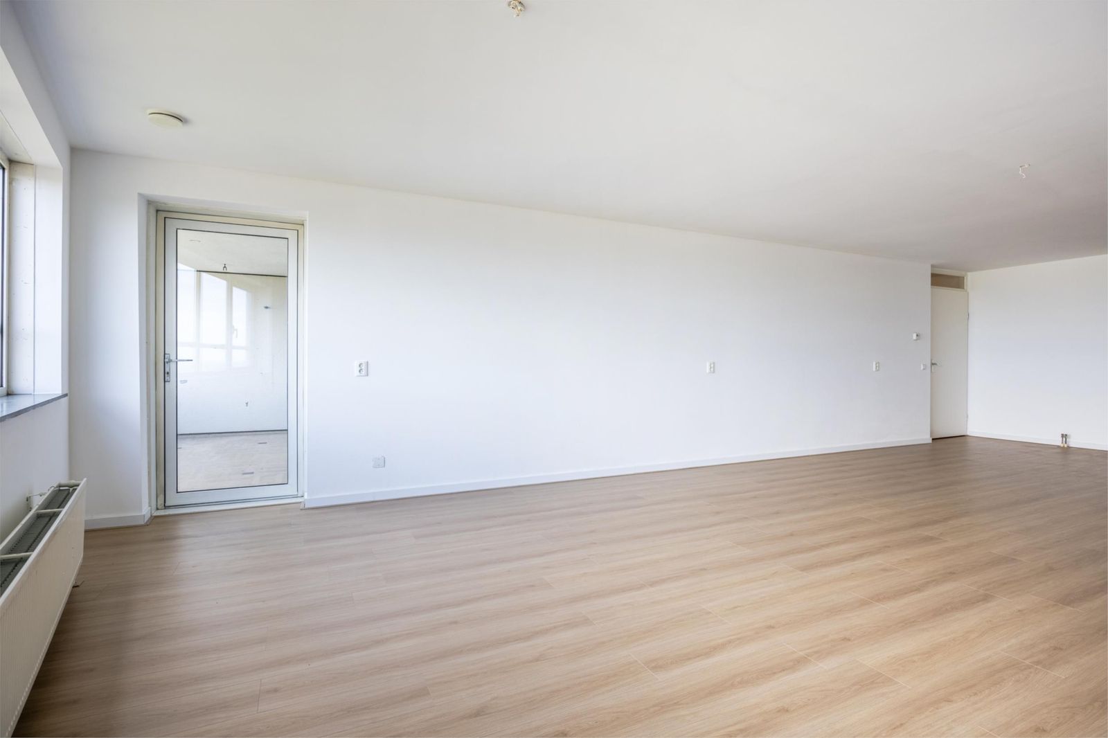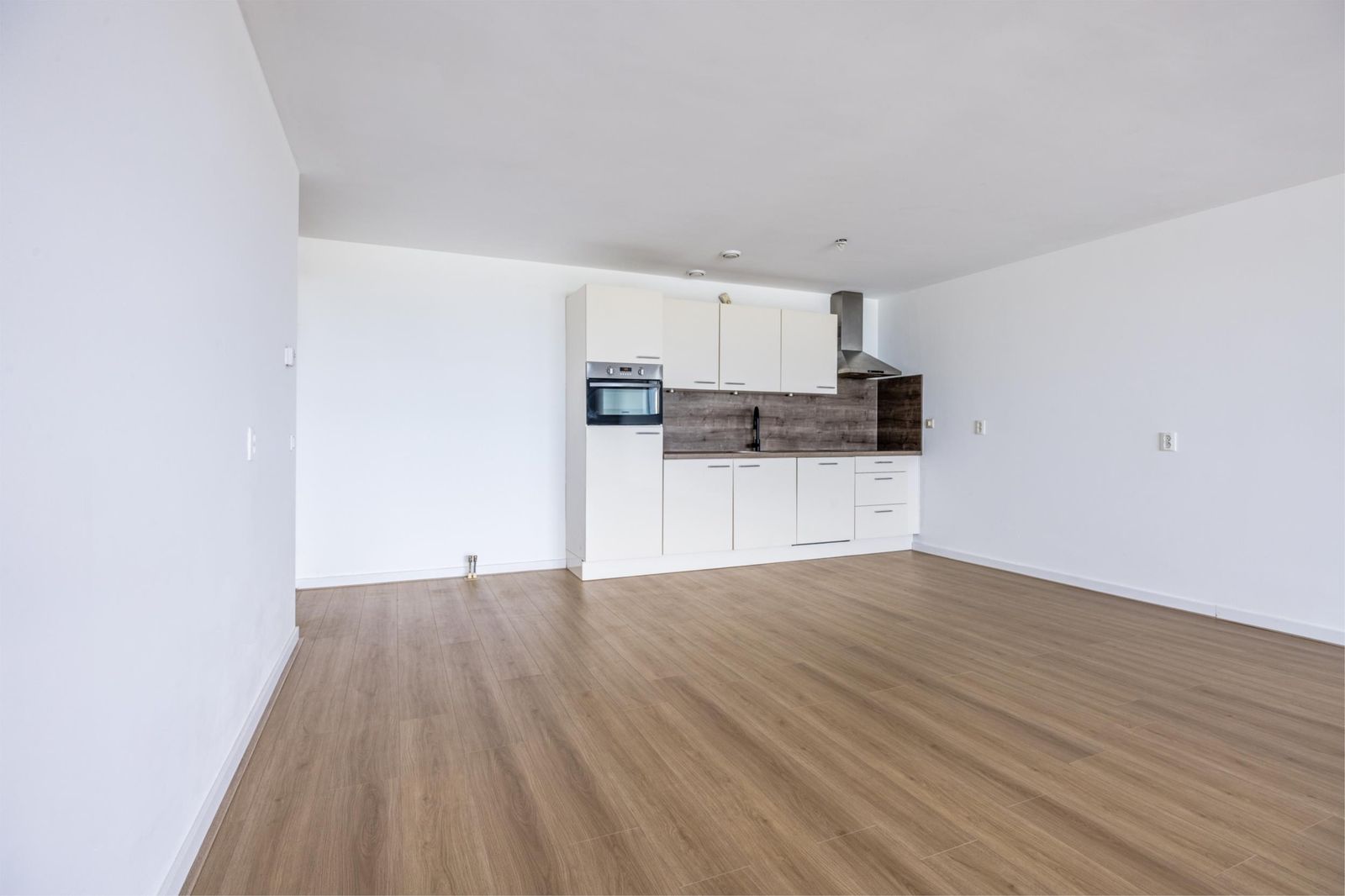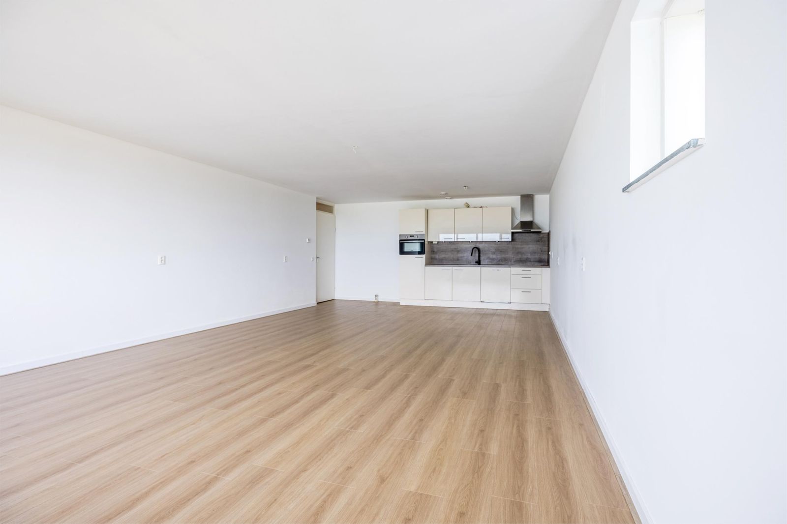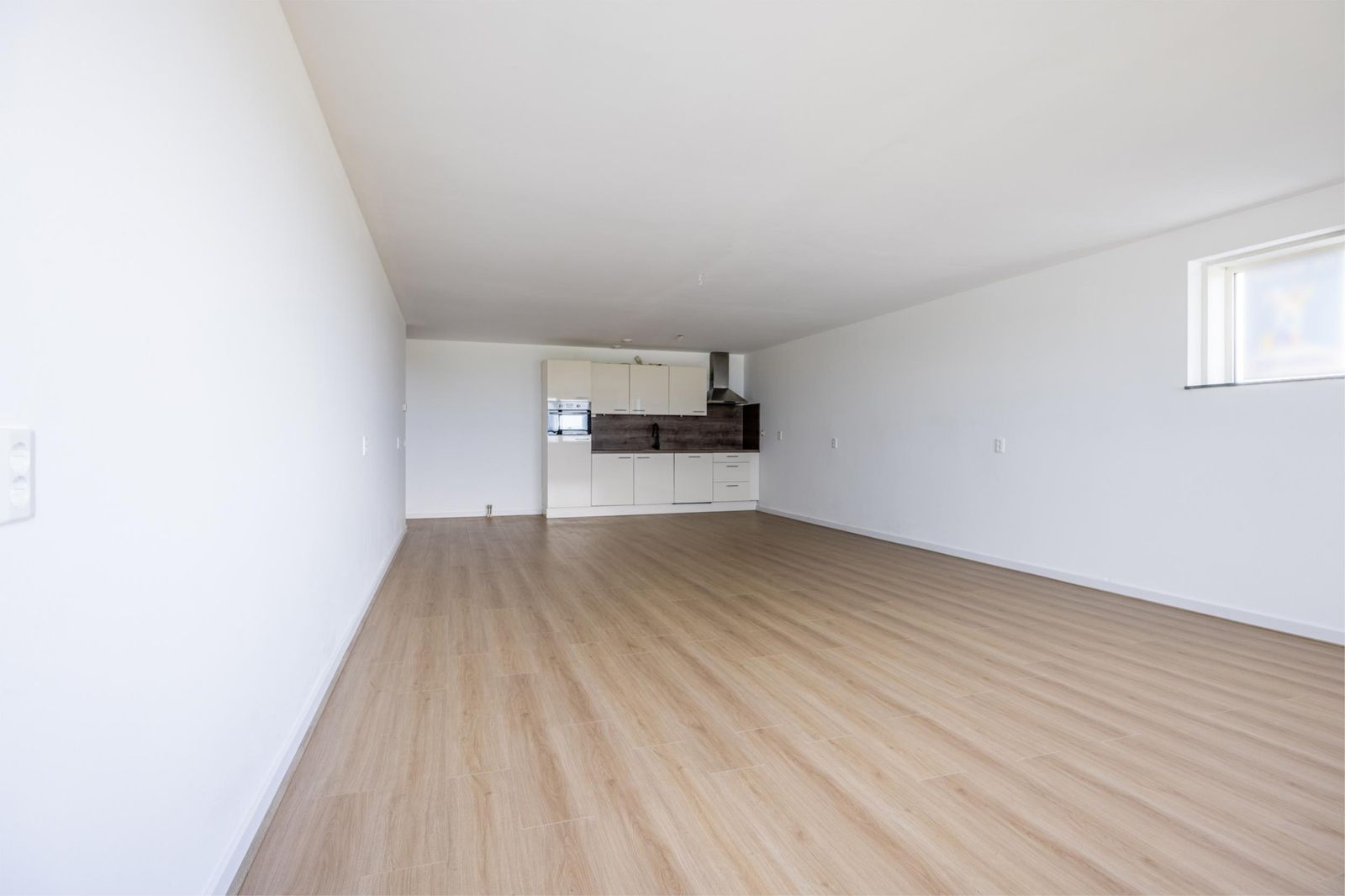 De woonkamer is afgewerkt met een moderne lichte vloer en strak gestuukte wanden, waardoor het geheel fris en ruimtelijk aanvoelt.
