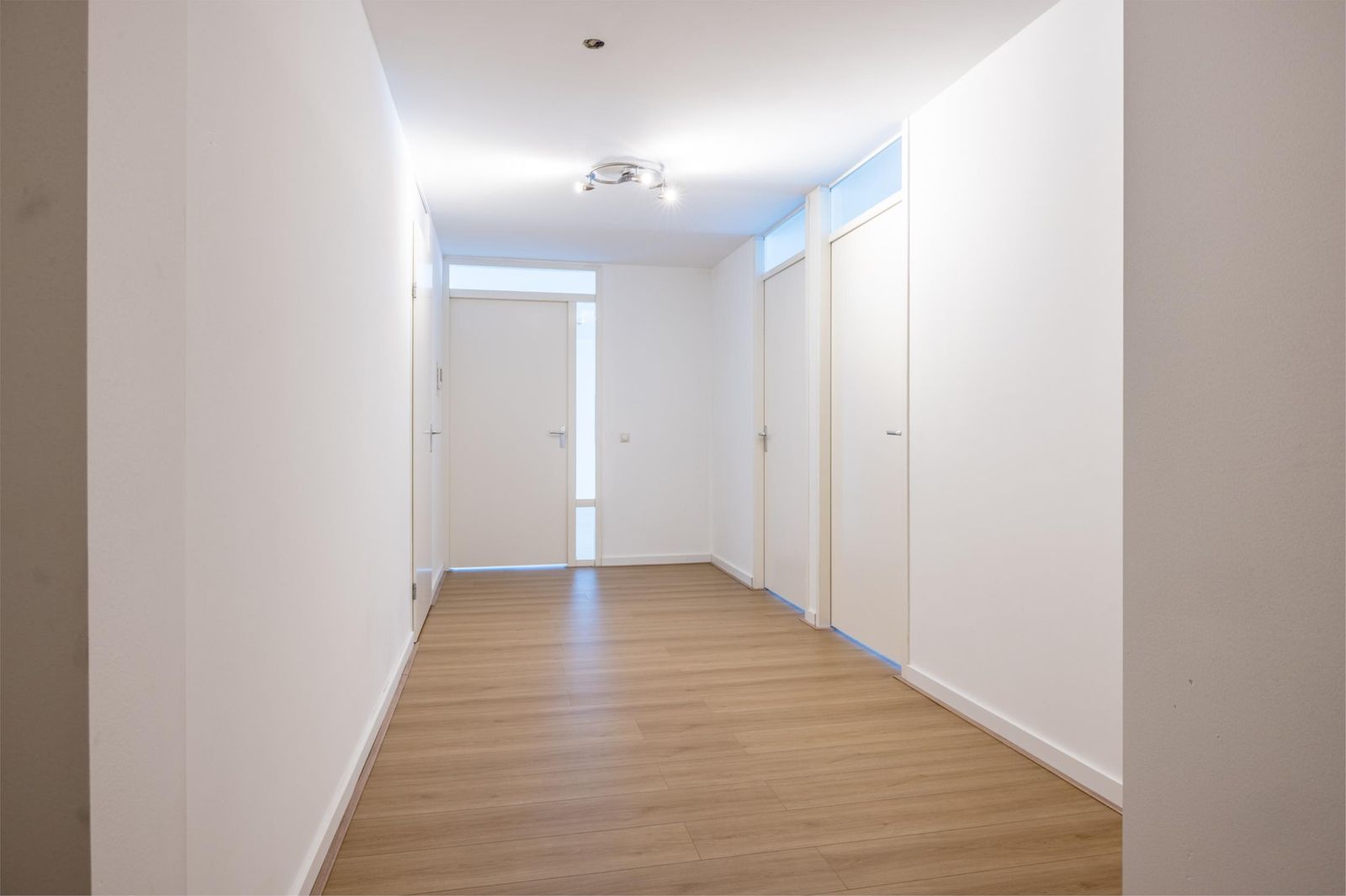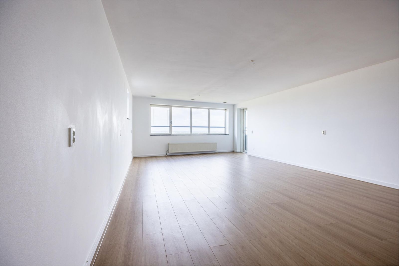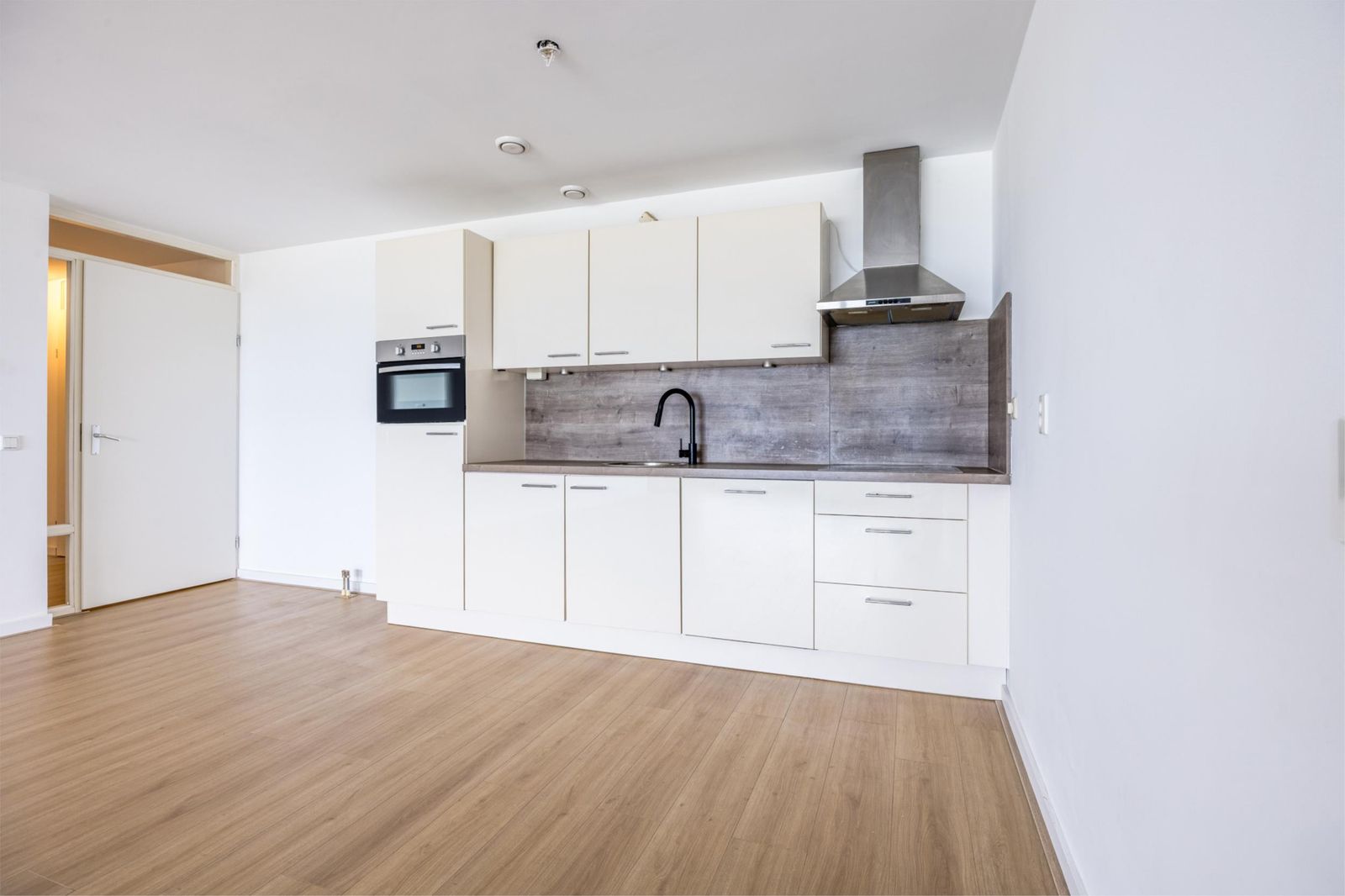 De woonkamer is afgewerkt met een moderne lichte vloer en strak gestuukte wanden, waardoor het geheel fris en ruimtelijk aanvoelt.