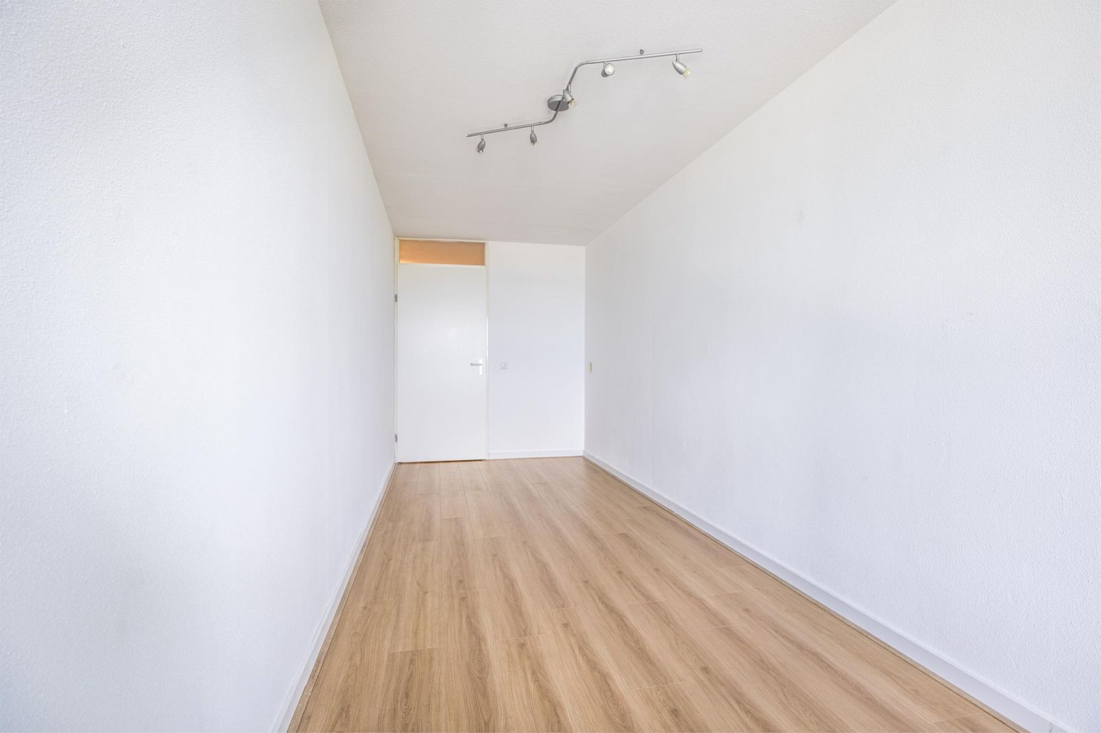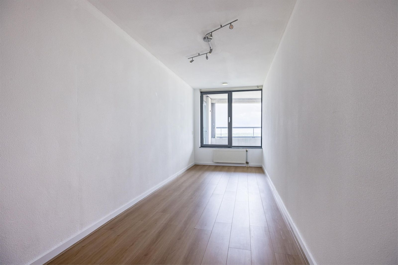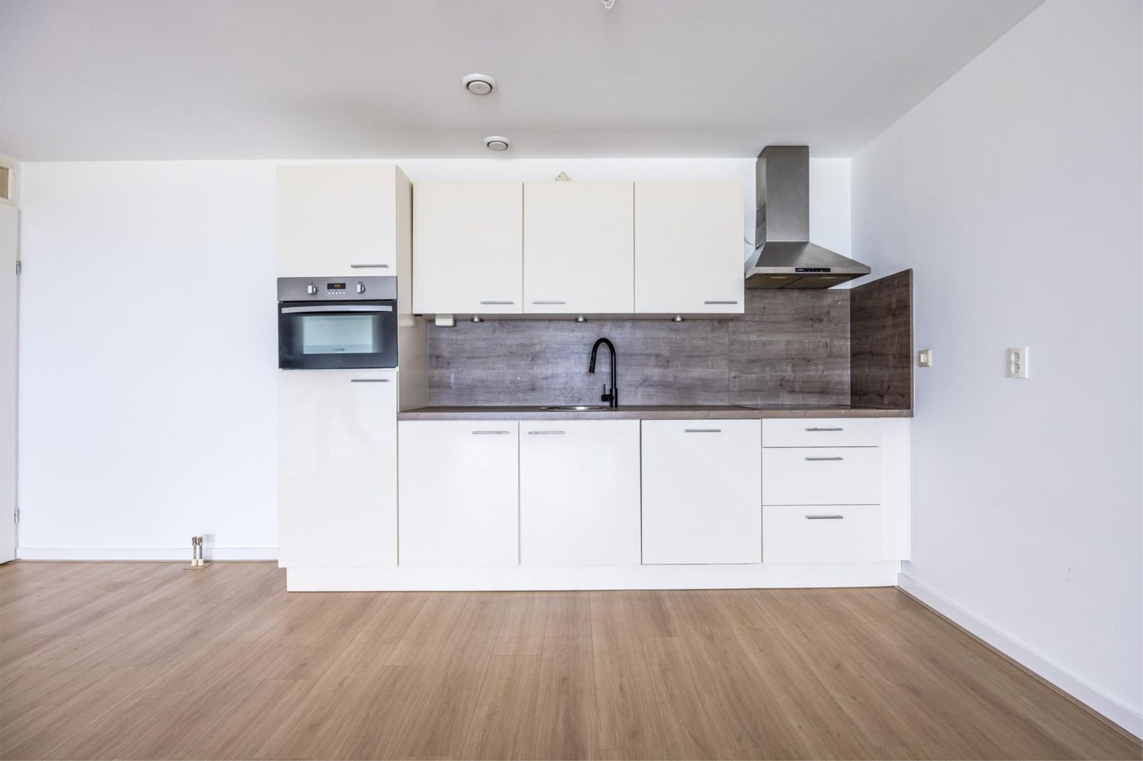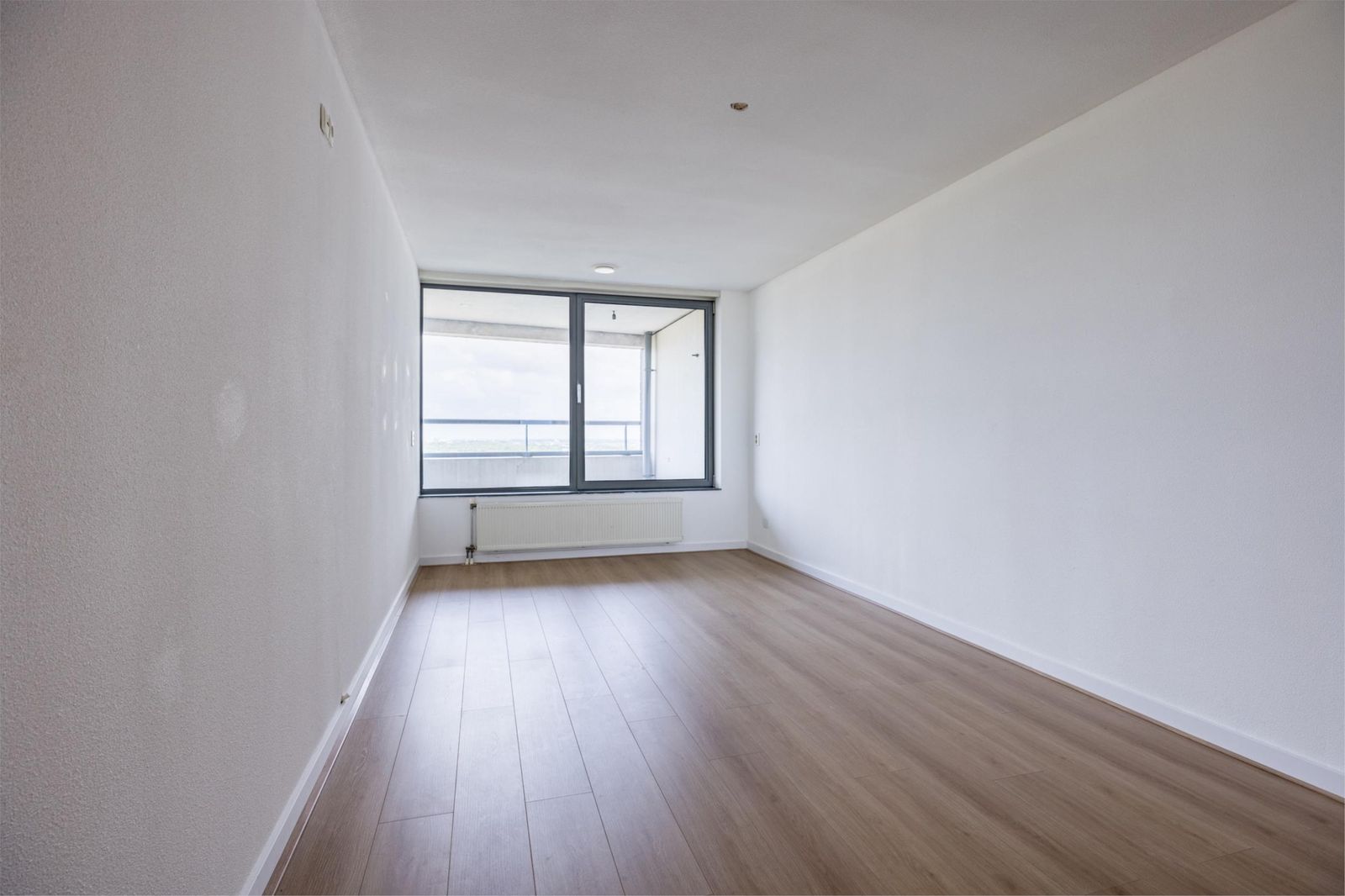 De woonkamer is afgewerkt met een moderne lichte vloer en strak gestuukte wanden, waardoor het geheel fris en ruimtelijk aanvoelt.