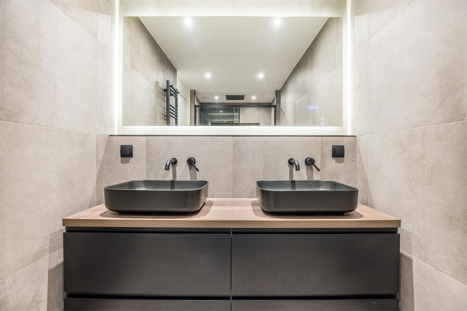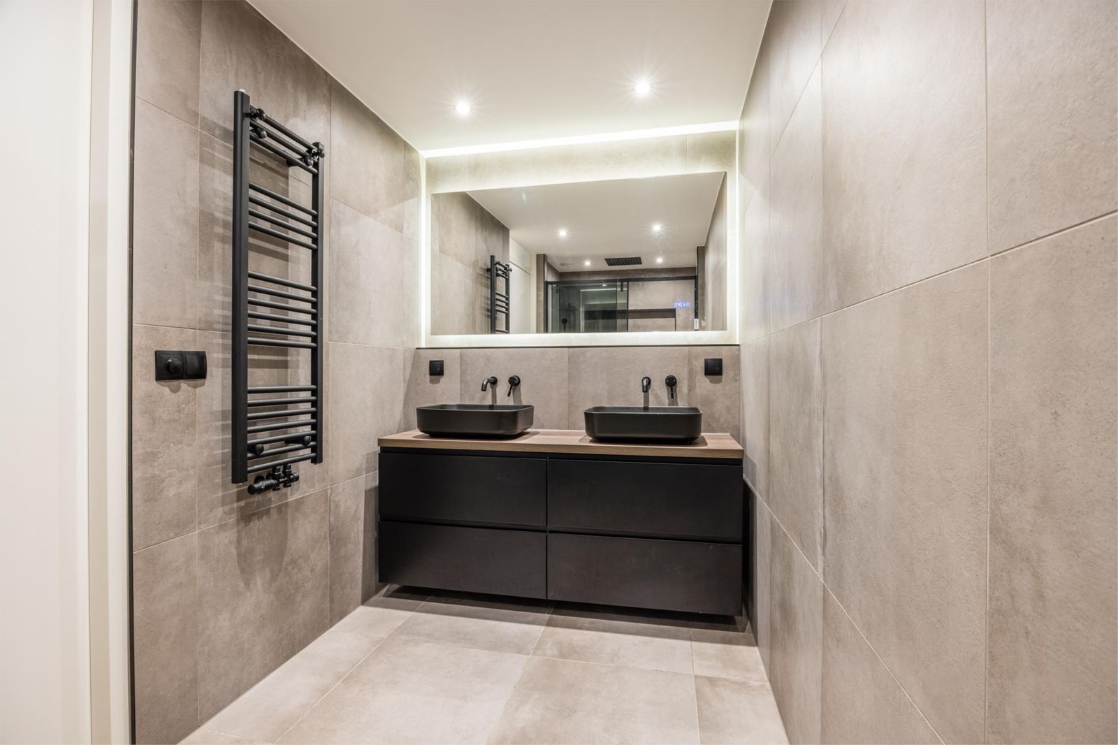 Luxe badkamer met dubbele wastafel en inloopdouche