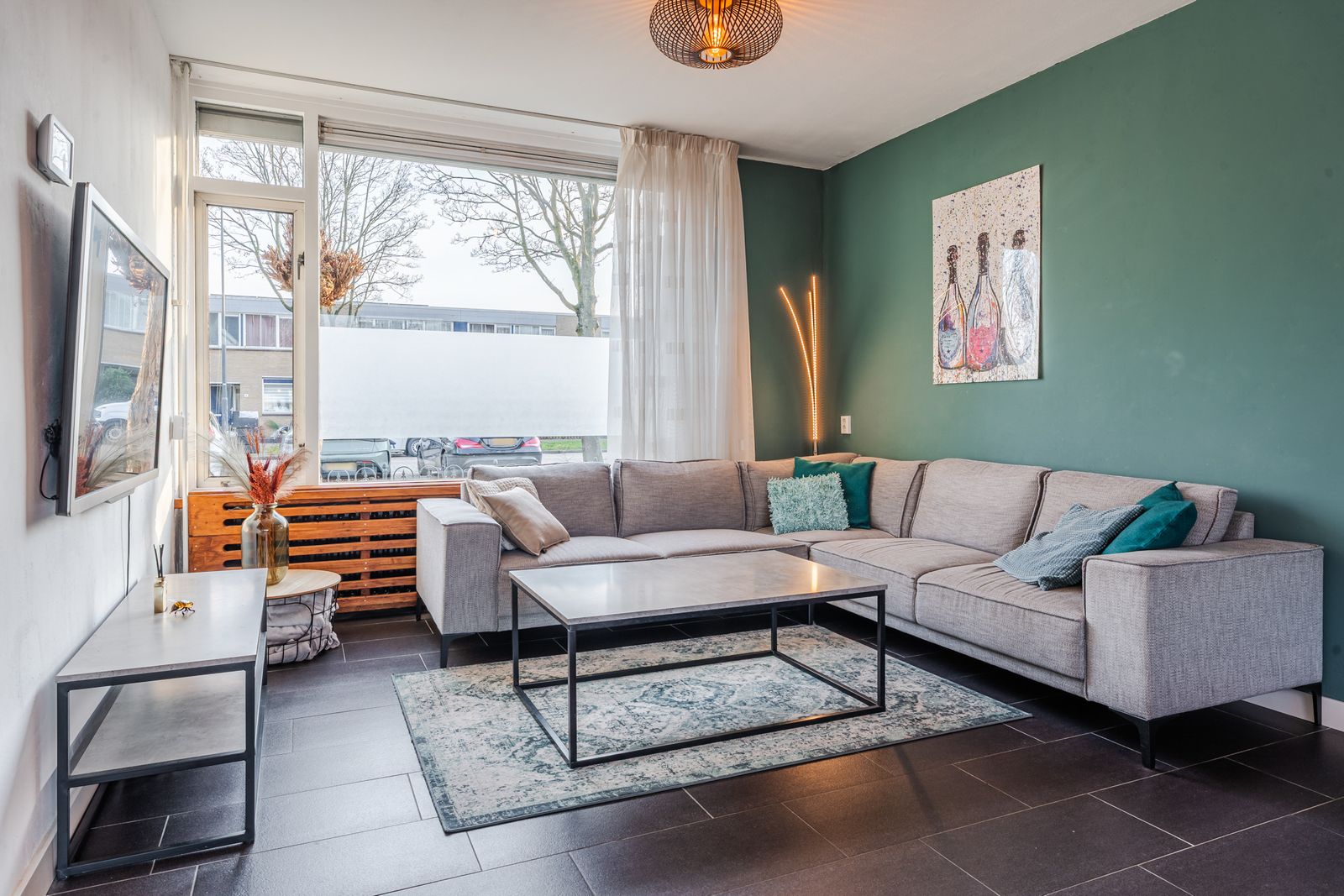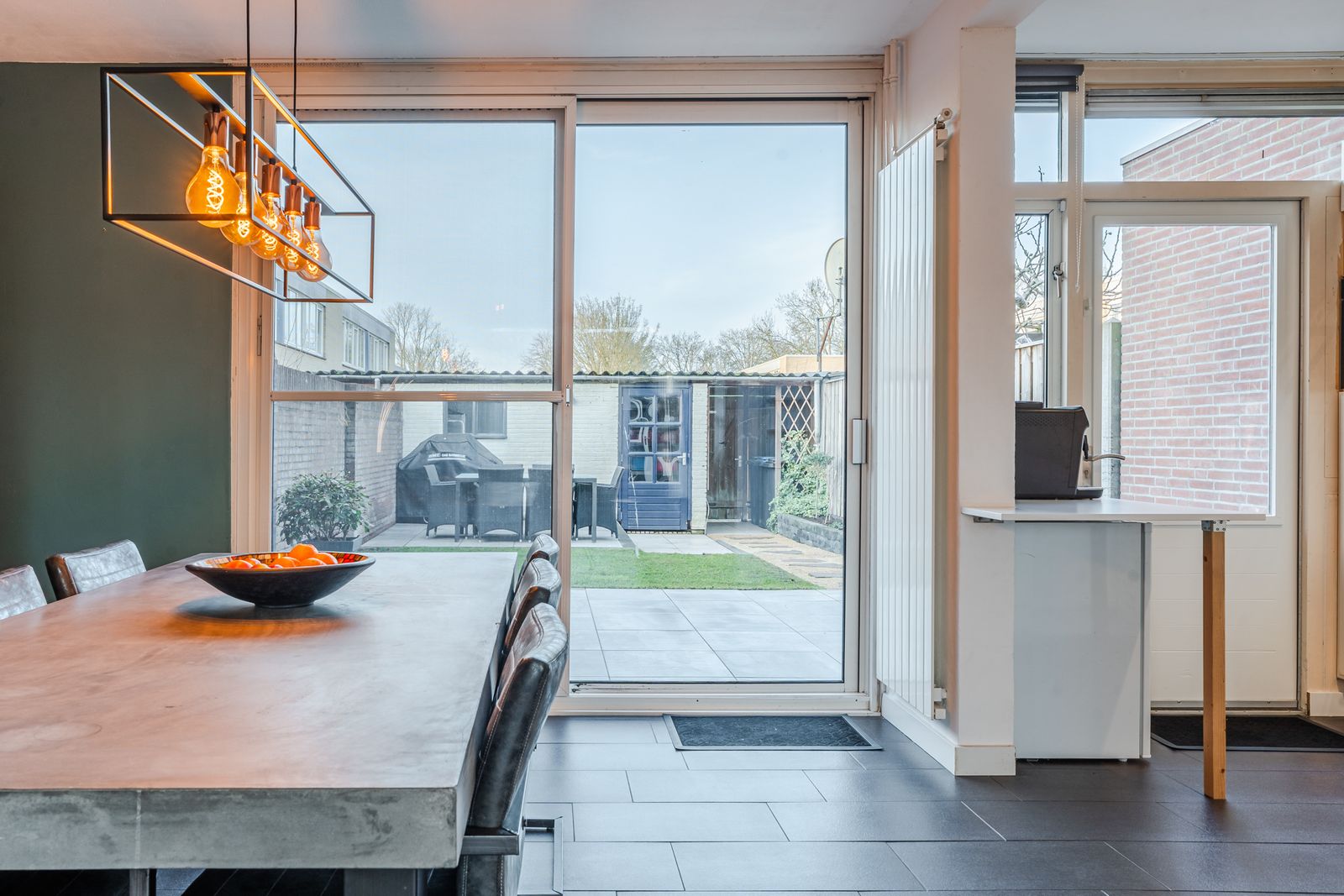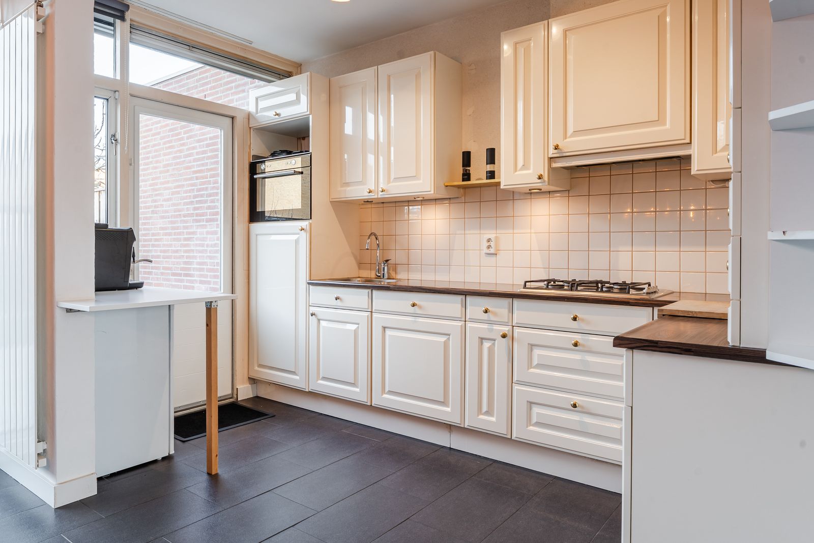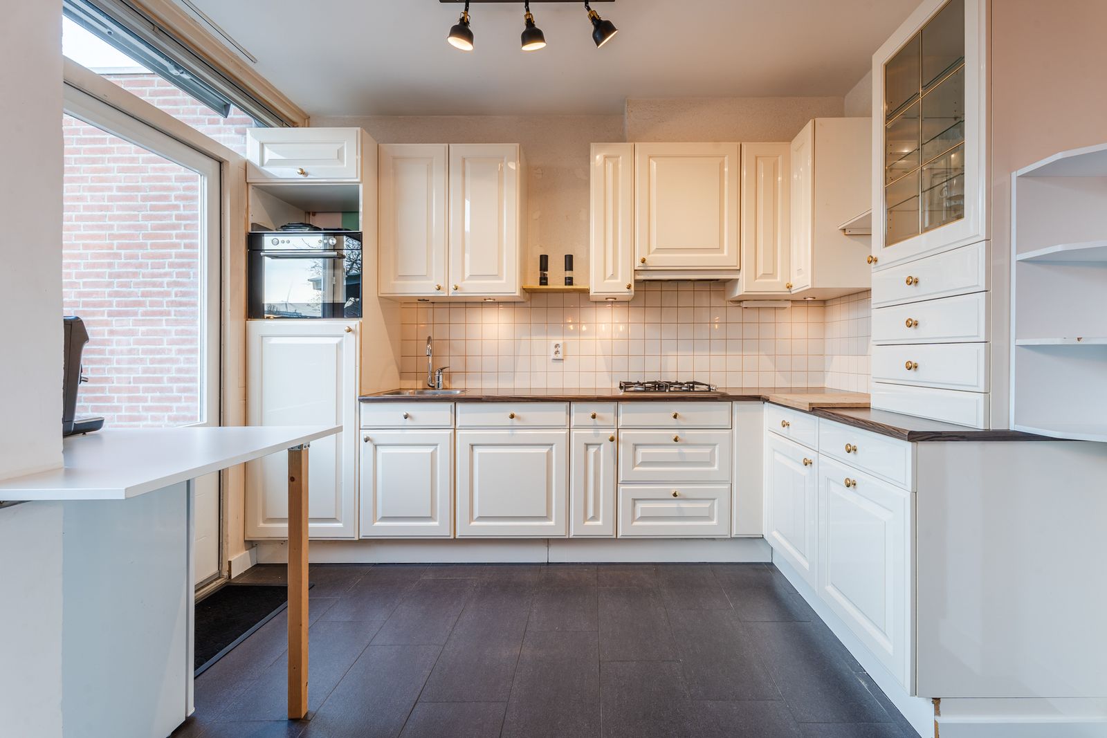 De lichte woonkamer biedt een prettige leefruimte met uitzicht op de tuin. De open keuken is praktisch ingedeeld en vormt een fijne plek om te koken en samen te komen.