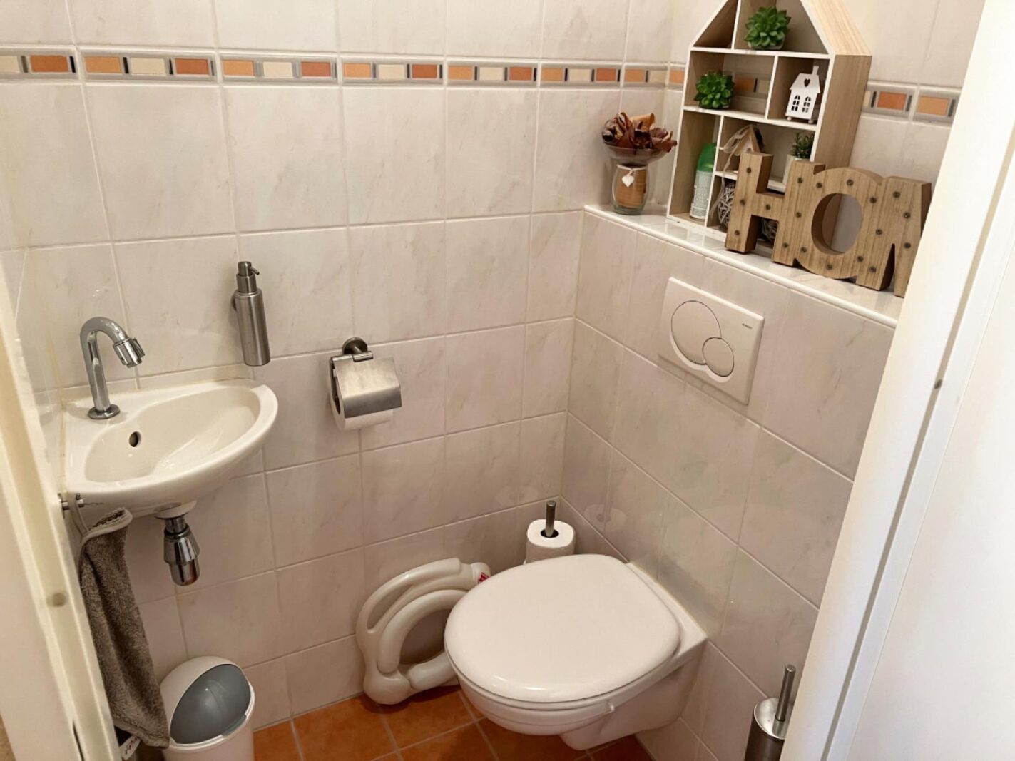Upon entering through the front door, you step into the hallway of the home. The hallway provides access to the living room, a separate toilet, and the staircase to the first floor. The living room is spacious and filled with natural light, providing ample room for a cozy seating area. From the living room, you enter the semi-open kitchen, fully equipped with plenty of cabinet space both above and below, as well as built-in appliances including a gas stove, refrigerator, dishwasher, and combination microwave. The kitchen also offers space for a dining area, and through French doors, you can access the garden. Behind the kitchen, you'll find the utility room with a washing machine connection and a door leading to the garden. The garden faces south, is low-maintenance, and thoughtfully landscaped with greenery. It can be accessed via a private rear entrance, and there's also a wooden shed with electricity.