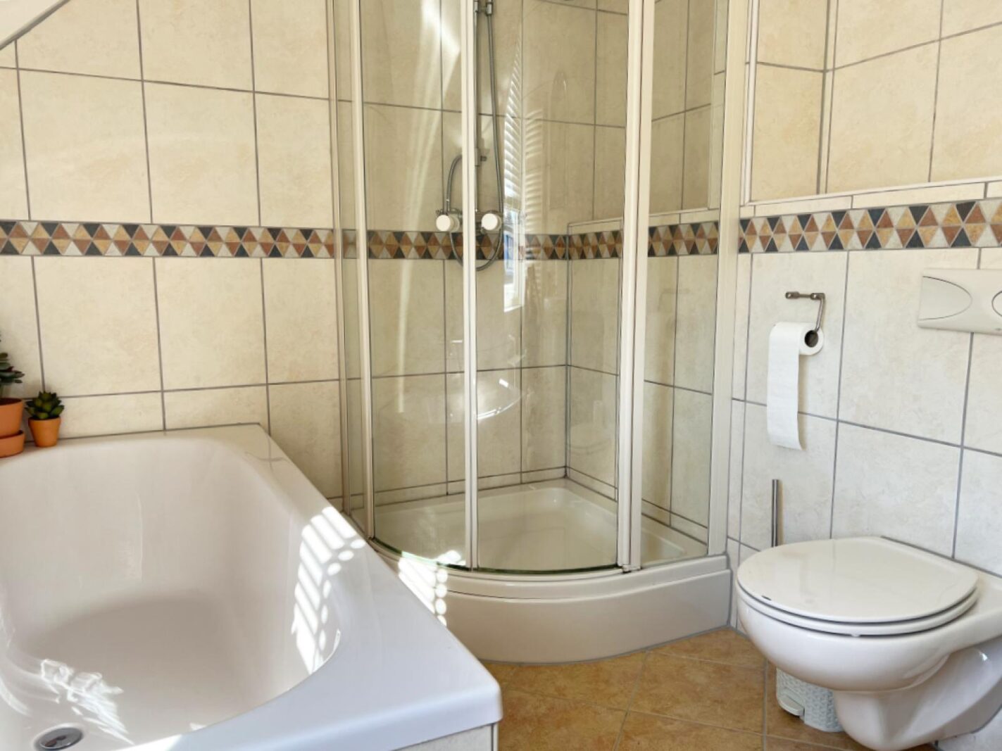 Ascending the stairs, you reach the landing, which provides access to all the rooms. Here, you'll find three full-sized bedrooms, one of which is generously sized and features a spacious built-in wardrobe. All the bedrooms boast beautiful herringbone-patterned flooring and dormer windows, making the rooms feel more spacious, well-lit, and practical. The bathroom is equipped with a shower cabin, bathtub, wall-mounted toilet, and a sink.