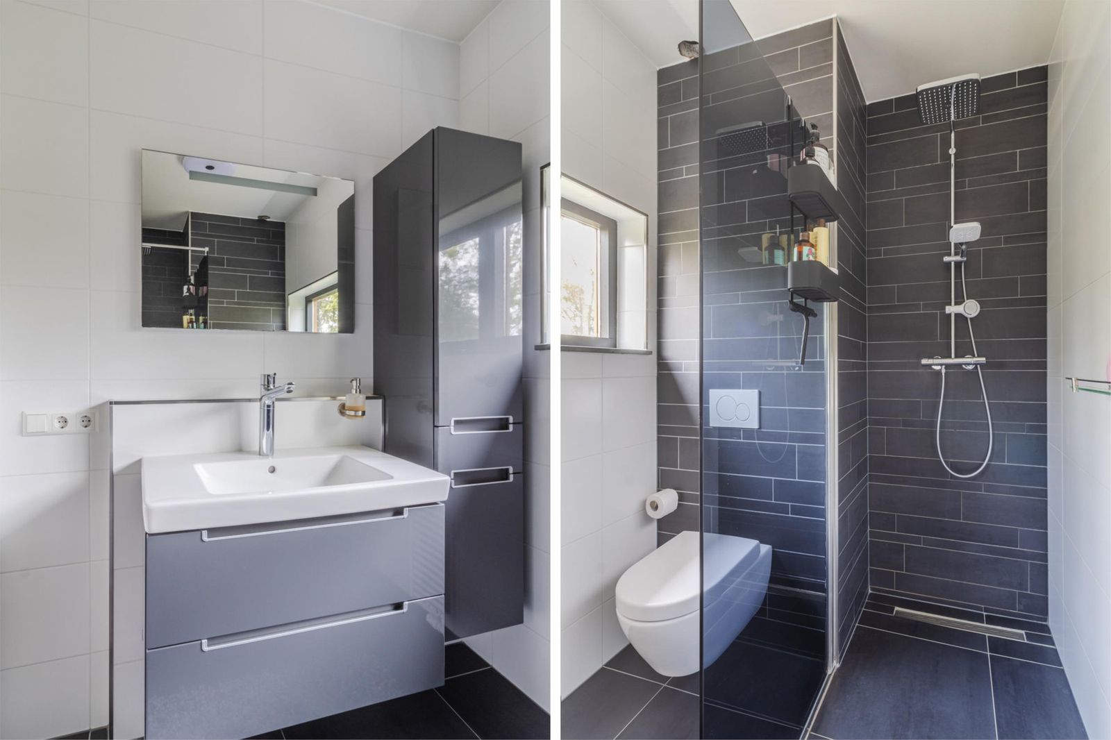 De badkamer is voorzien van een inloopdouche met hand- en regendouche, een hangend toilet, handdoekenradiator, een was meubel en spiegel met verlichting.