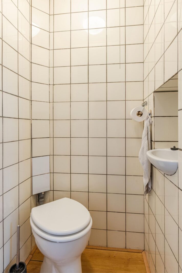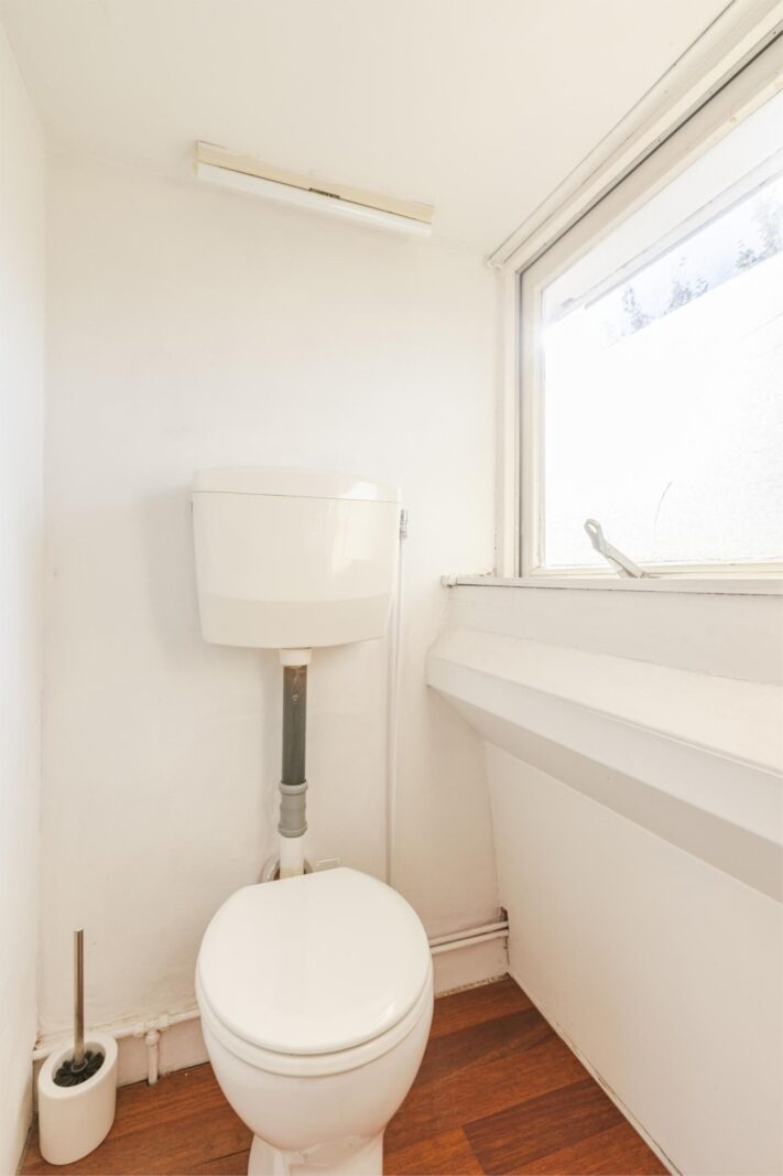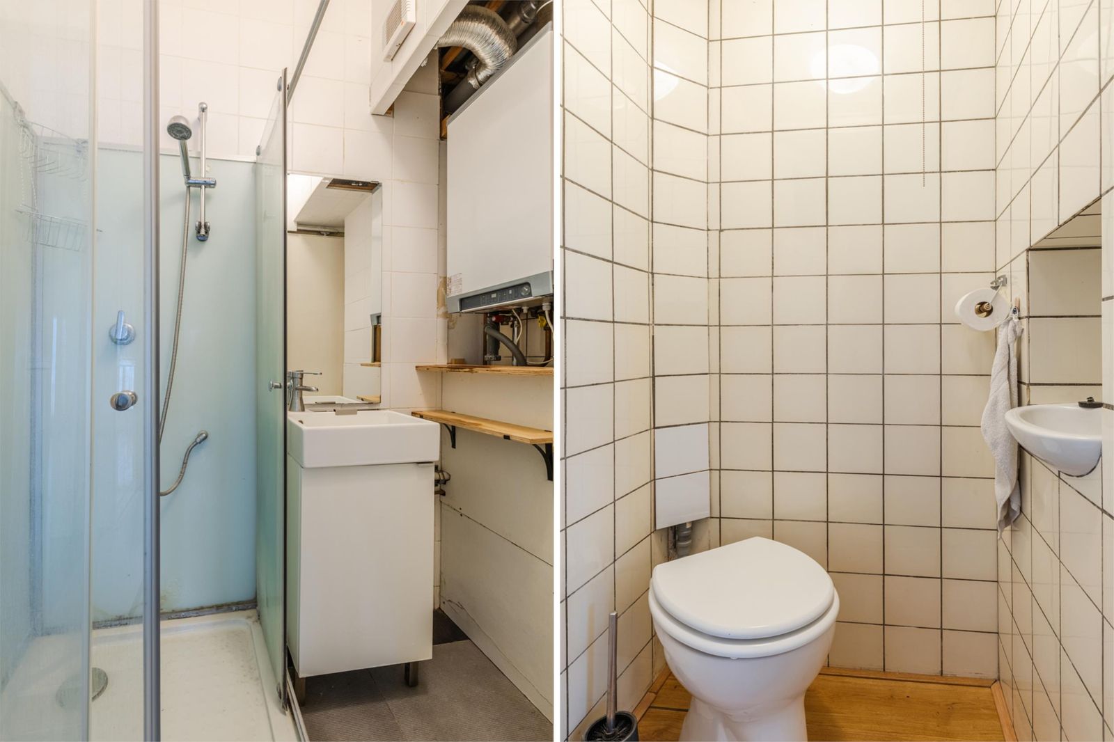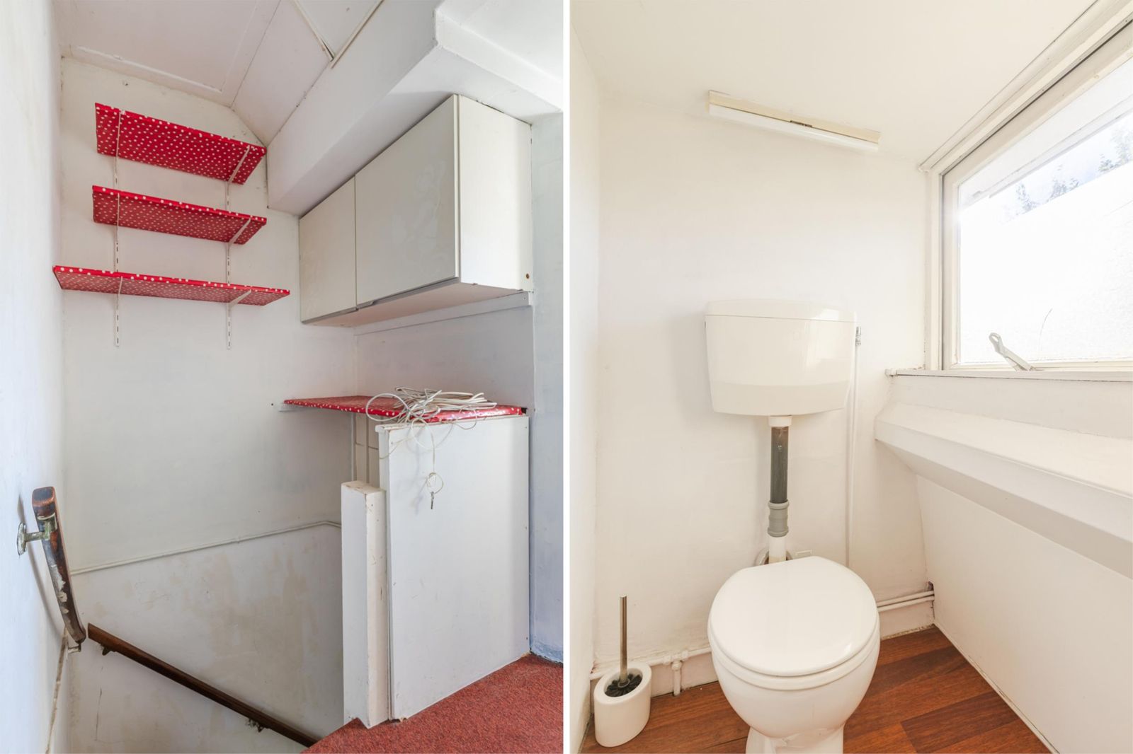 2e etage; toilet in de gang, deur naar een apartement met keuken en badkamer.